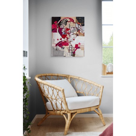 Originalkunstwerk von Carme Magem, collagistische Künstlerin, bekannt für seine bemerkenswert ausdrucksstarken Porträts, komponiert aus Zeitungsausschnitten und Fragmenten alter Briefe und Schriften.