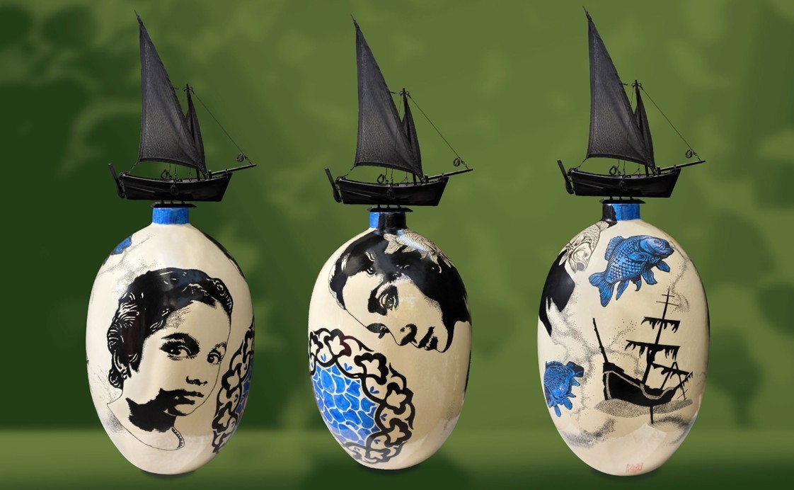 Originalwerk der Künstlerin Elia Pagliarino, in Doppelbrand-Keramik gefertigt. Diese Balise ist vom Schicksal des Aralsees inspiriert, einem Symbol einer der größten ökologischen Katastrophen des 20. Jahrhunderts, deren Schiffs-Friedhof in Moynaq, Usbekistan, ein eindringliches Mahnmal darstellt.