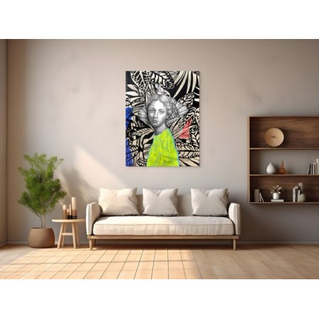 Originalgemälde der Künstlerin Elia Pagliario, stellt eine klassische Figur und ein verspieltes Kaninchen vor einem grafischen Dschungelhintergrund mit intensiven Neonfarben dar. Ein auffälliges Bild zwischen Sanftheit und zeitgenössischer Pop-Ästhetik.