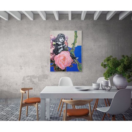 Originalgemälde der Künstlerin Elia Pagliario,stellt einen Vintage-Kinderschnitt und Pfingstrosen in poppigen Farben dar, die einen auffälligen Kontrast auf Holz bilden. Dieses Bild bietet eine traumhafte und eindrucksvolle Vision, die Unschuld und zeitgenössische Energie miteinander verbindet.