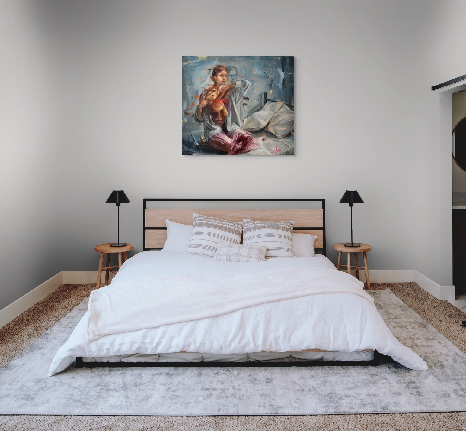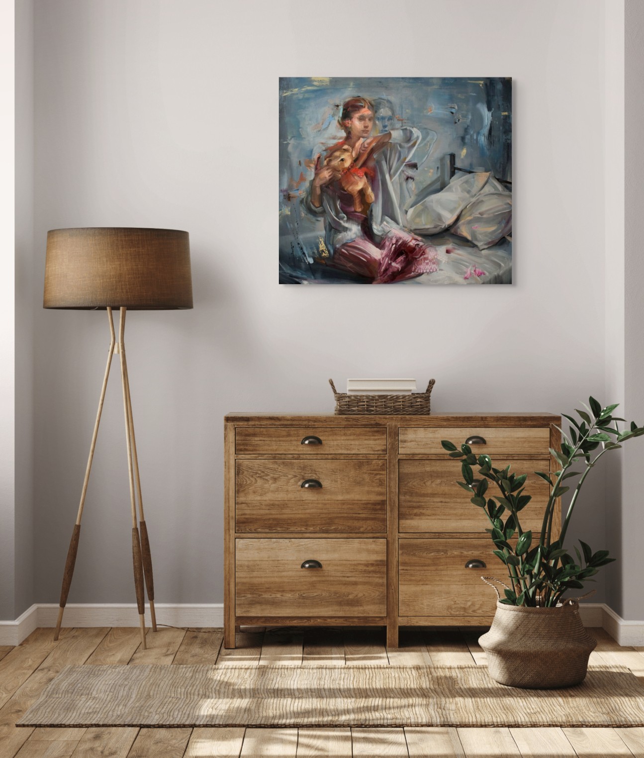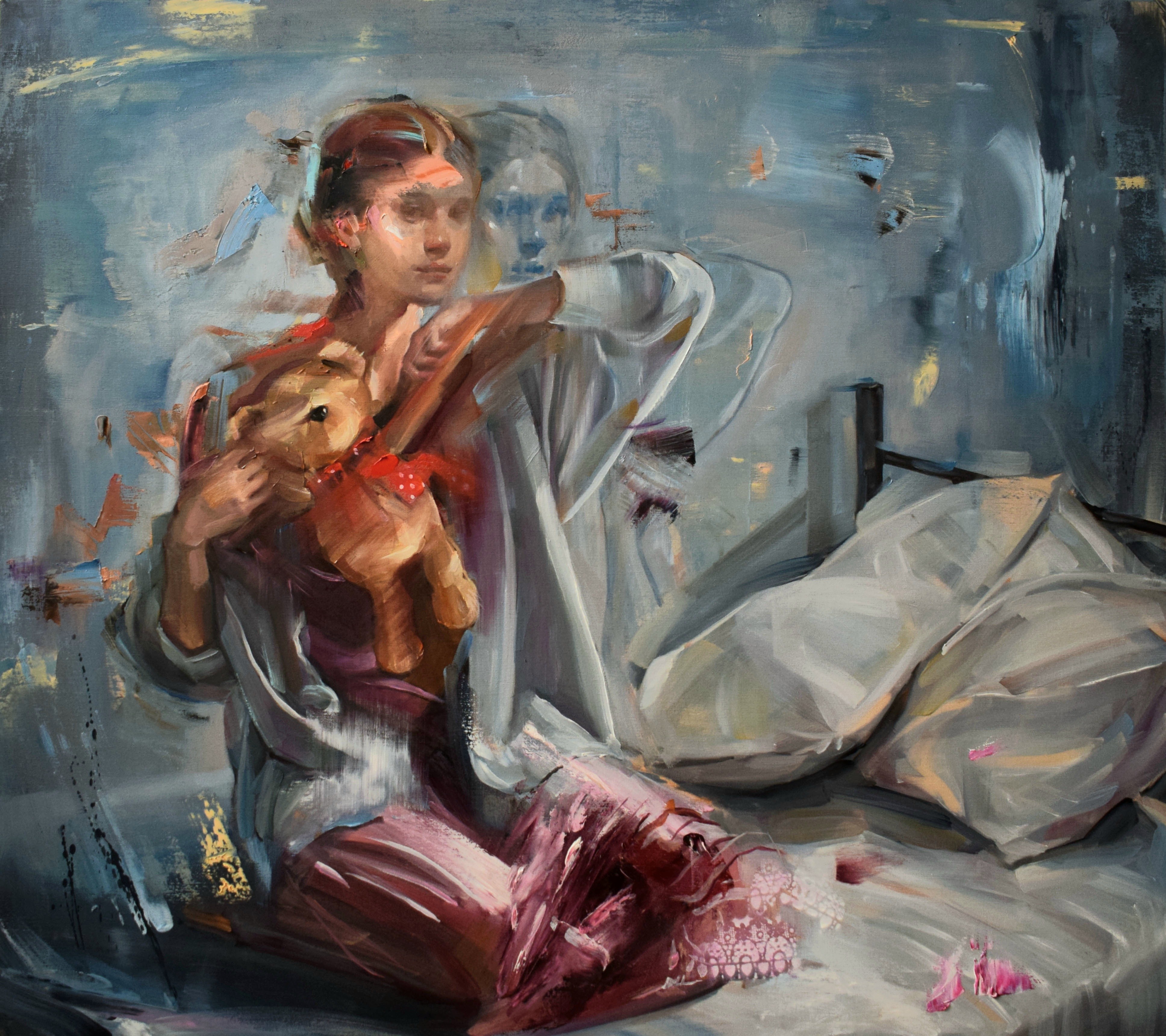 Originalwerk der Künstlerin EVITA ANDUJAR, zeigt eine weibliche Figur, die auf einem Bett sitzt und einen Teddy hält, mit einem Doppelbelichtungs- oder Geistereffekt. Die Künstlerin verwendet gestische Pinselstriche und reiche Texturen, insbesondere tiefe Rottöne und dunkle Blautöne, um einen Moment der Introspektion oder des Übergangs einzufangen.