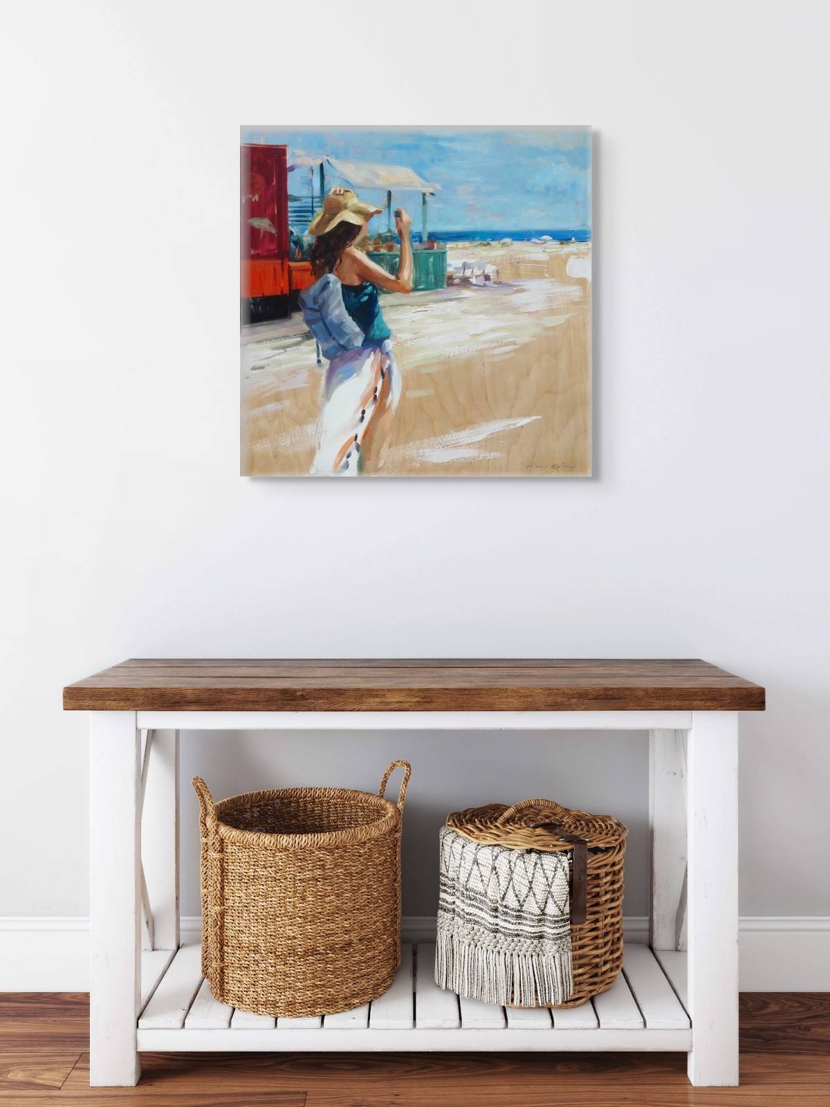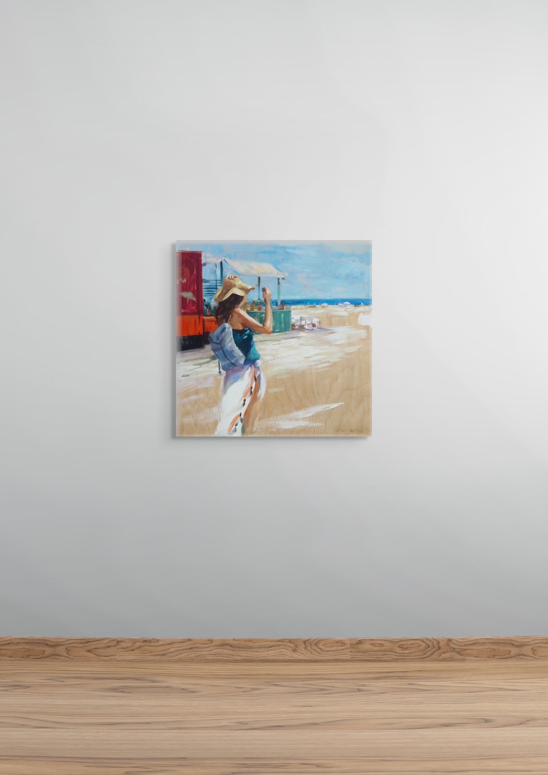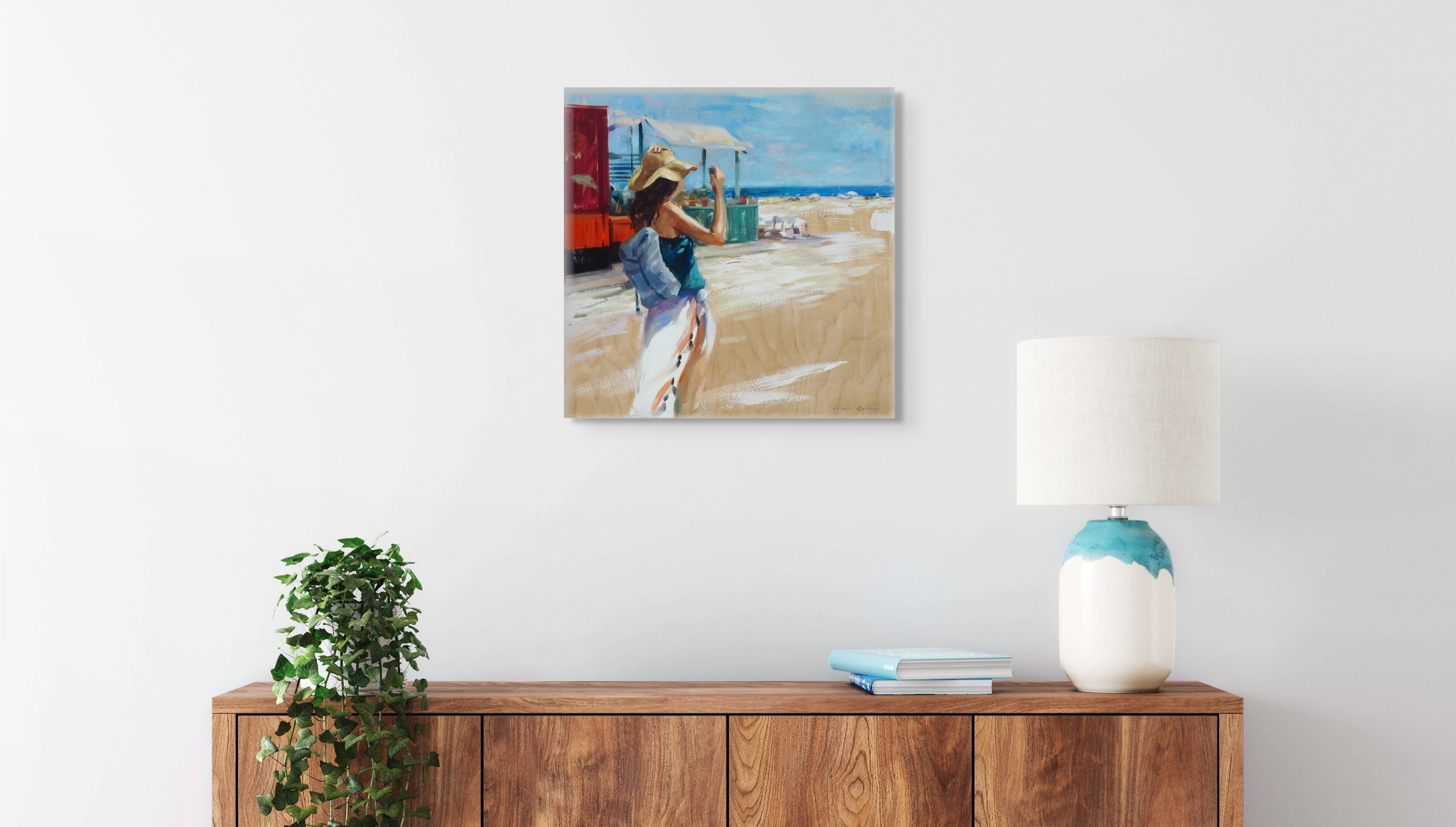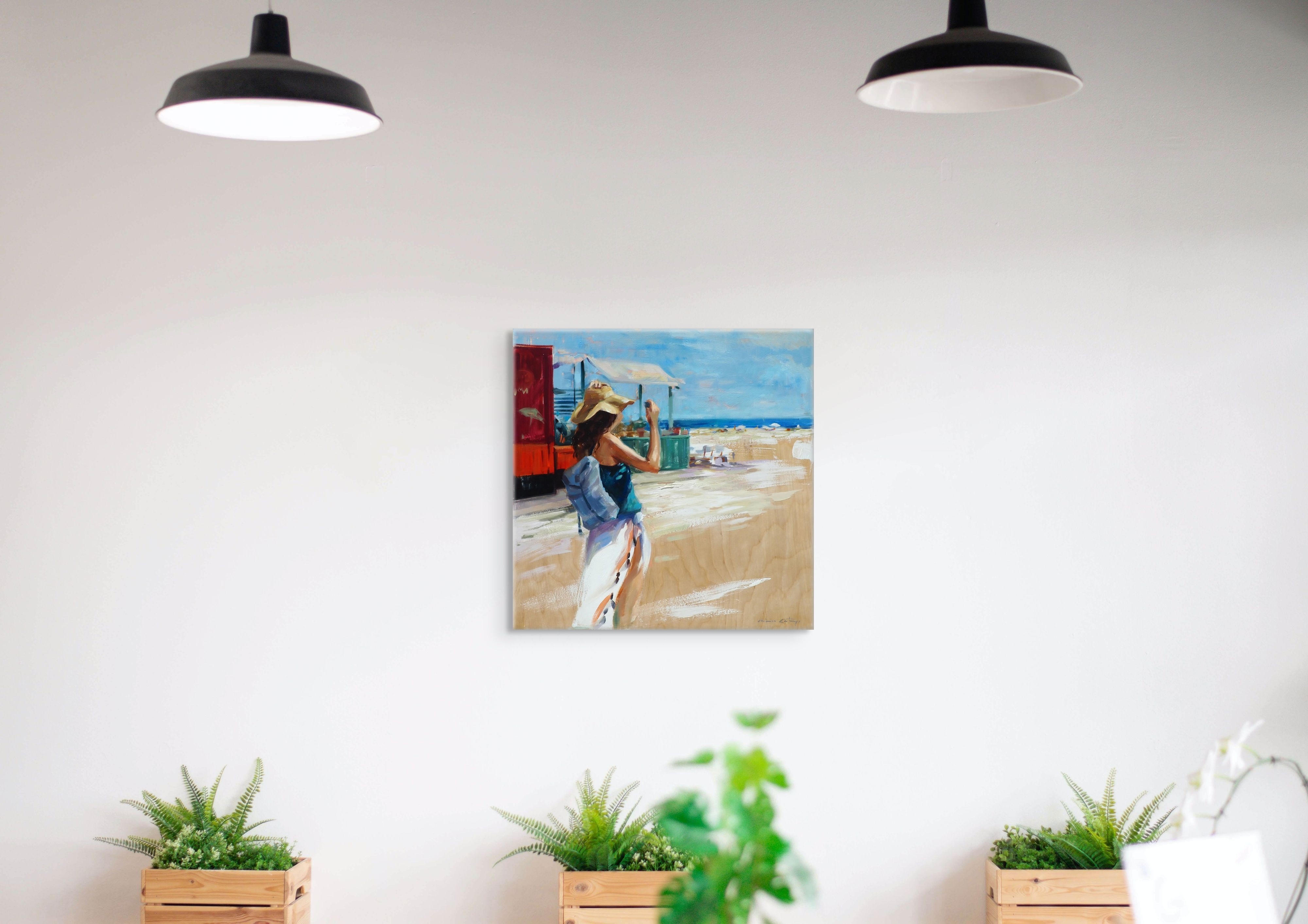 Originalkunstwerk der Künstlerin MONICA CASTANYS, das einen lebendigen und unbeschwerten Sommermoment zeigt, in dem eine Frau das Meer an einem sonnenverwöhnten Strand betrachtet. Durch dynamische Pinselstriche und helles Licht evoziert die Künstlerin die einfache Freude an Momenten sommerlicher Freiheit.