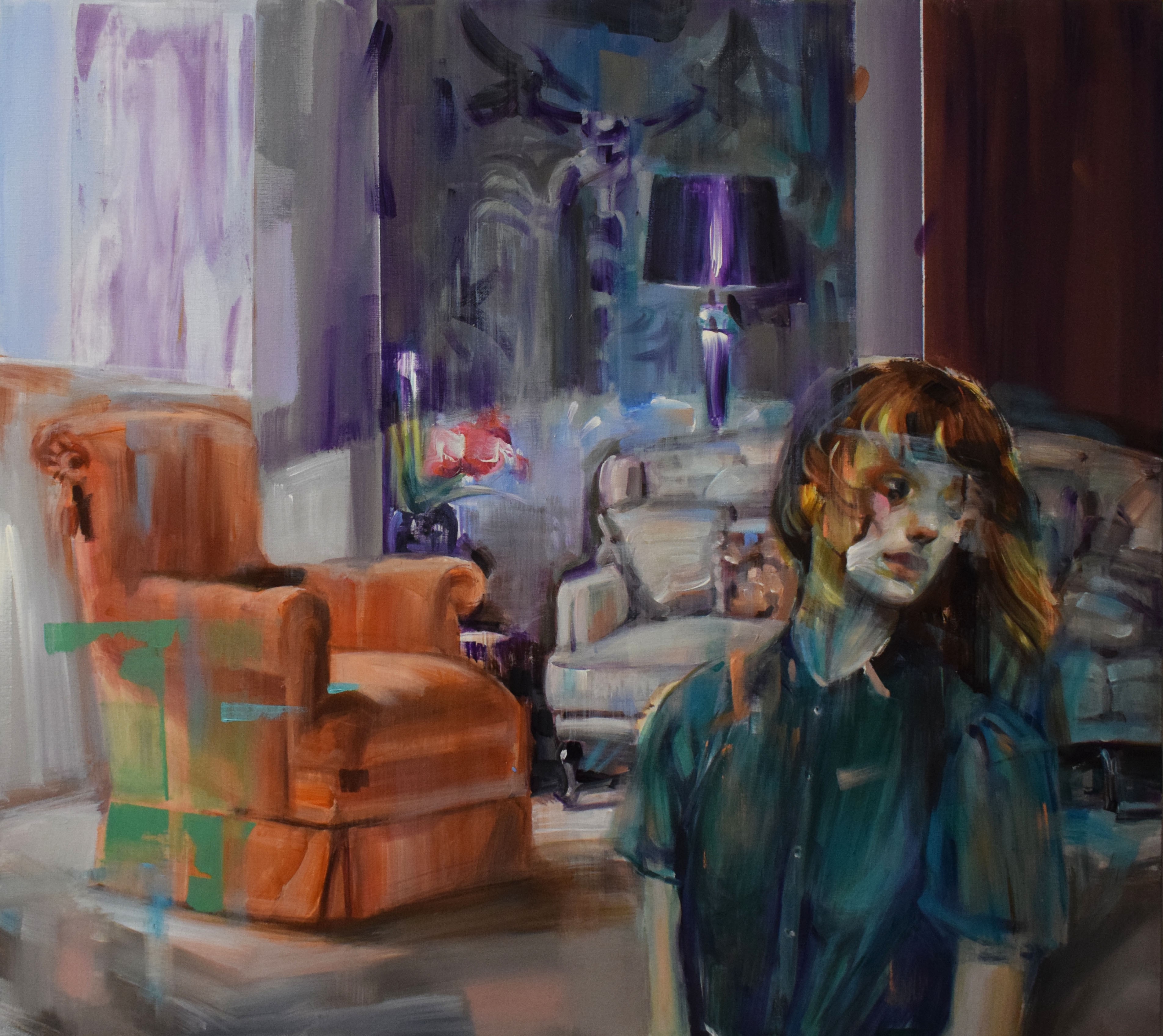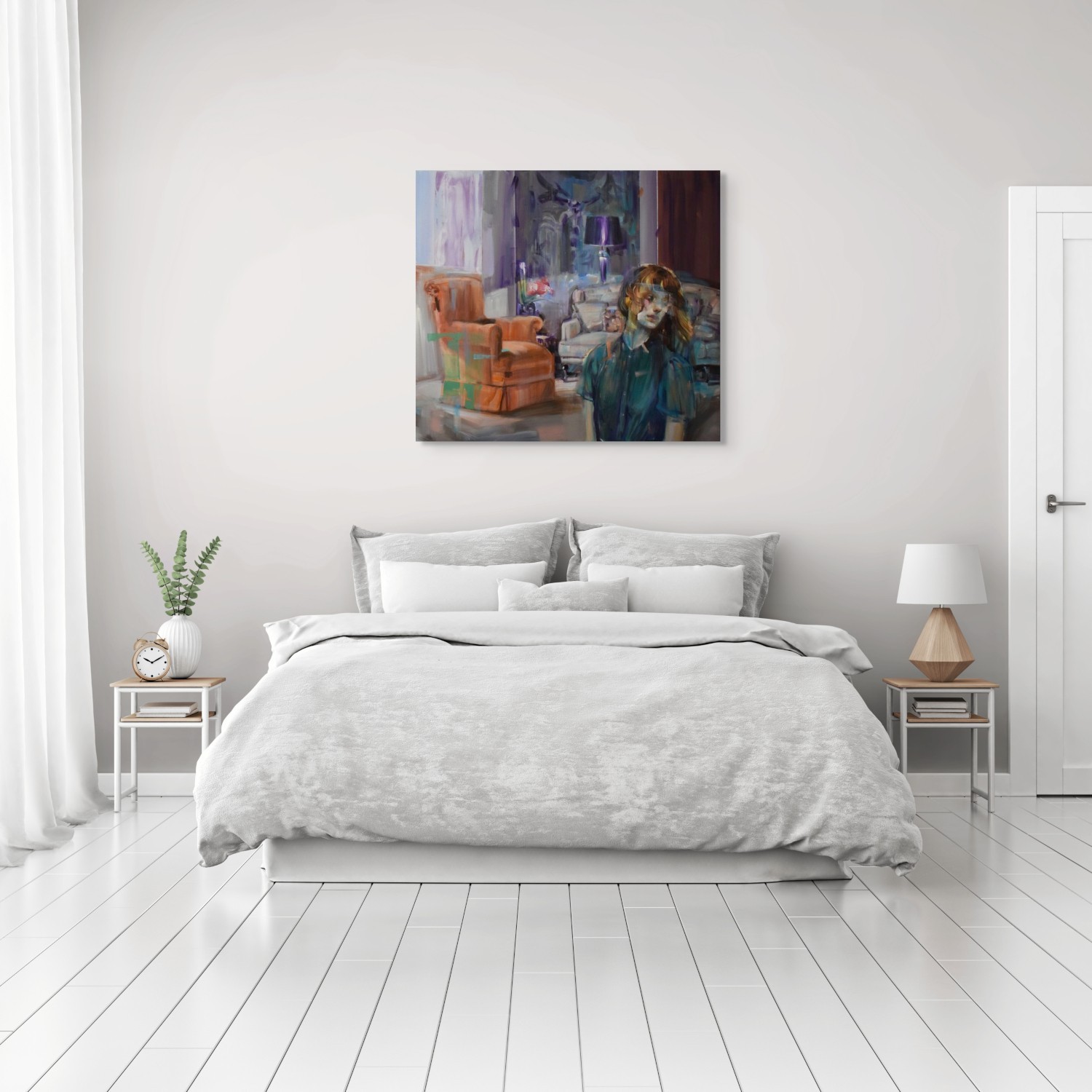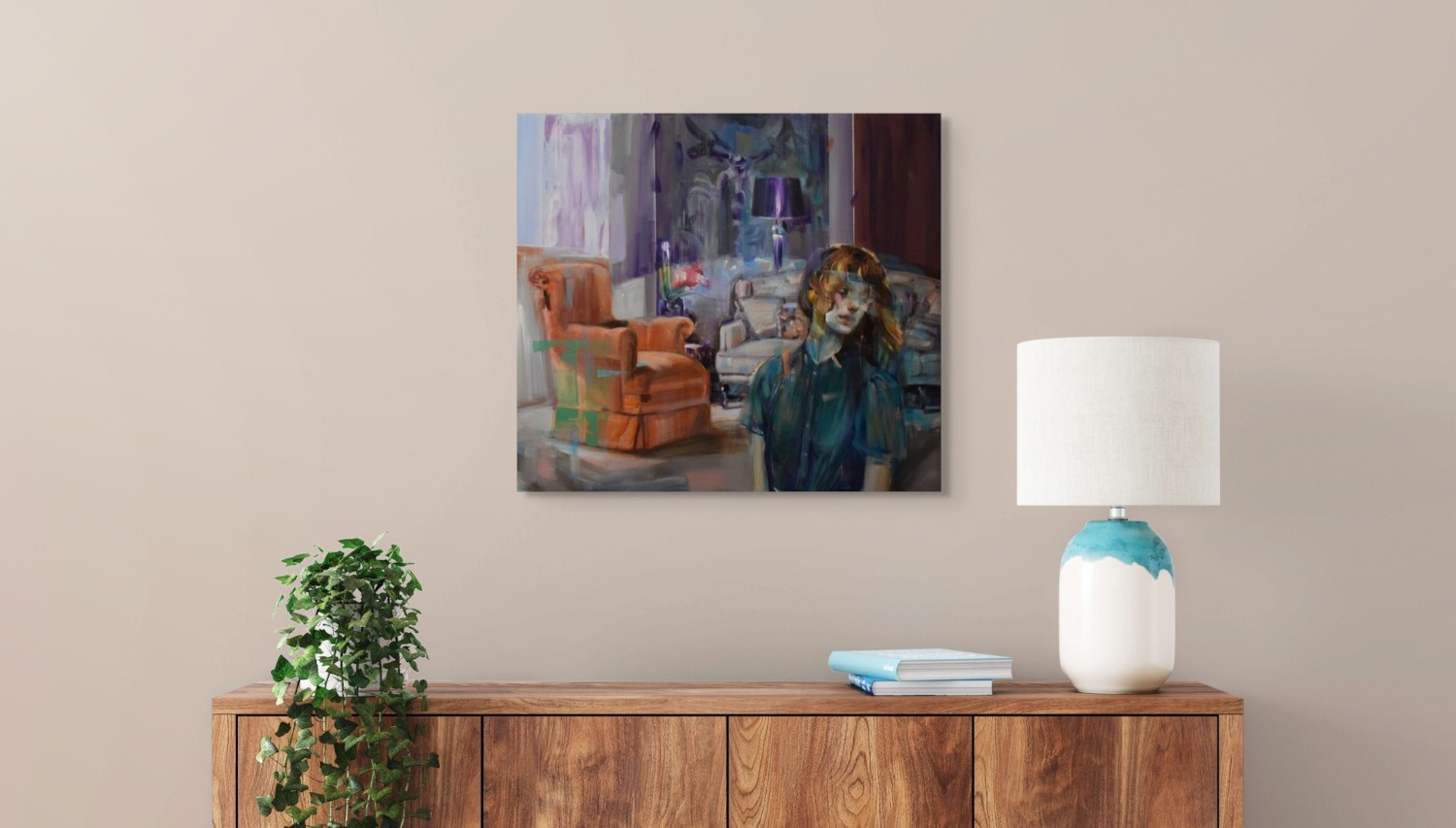 Originalwerk der Künstlerin EVITA ANDUJAR, ein Porträt in verblassten Farben einer rothaarigen Frau im Vordergrund, deren Gesicht teilweise durch einen Unschärfe- oder Bewegungseffekt verdeckt ist, vor dem Hintergrund eines dekorierten Wohnzimmers. Die Farbpalette wird von Violett-, Rost- und Grüntönen dominiert und suggeriert eine flüchtige Präsenz oder eine Erinnerung.
