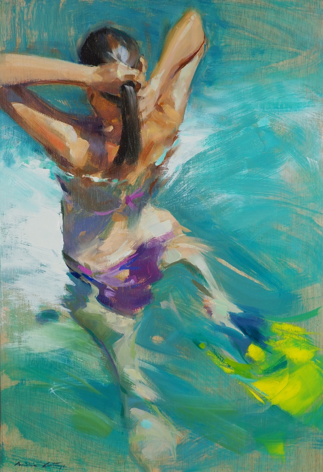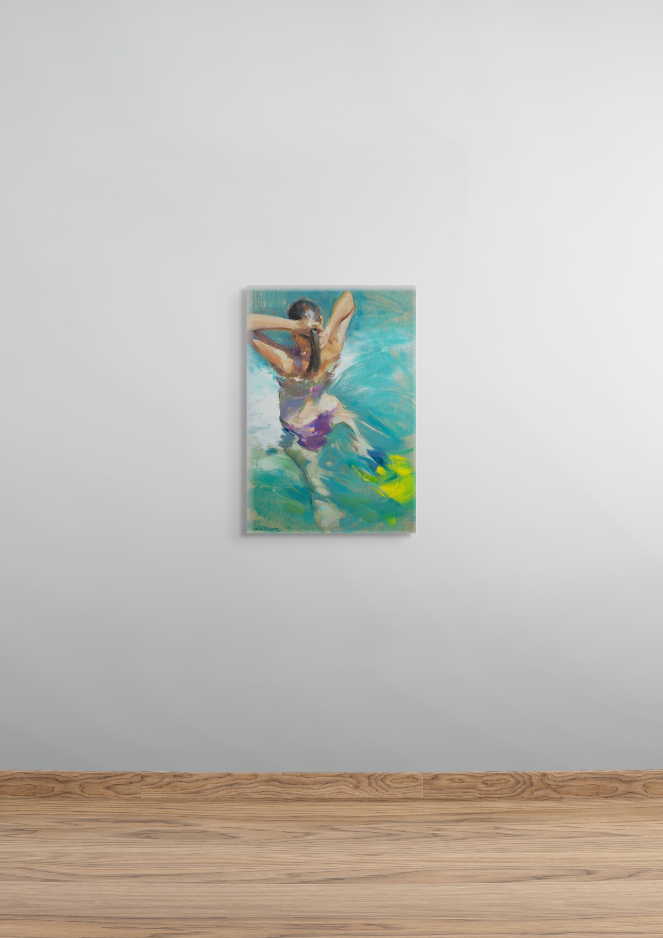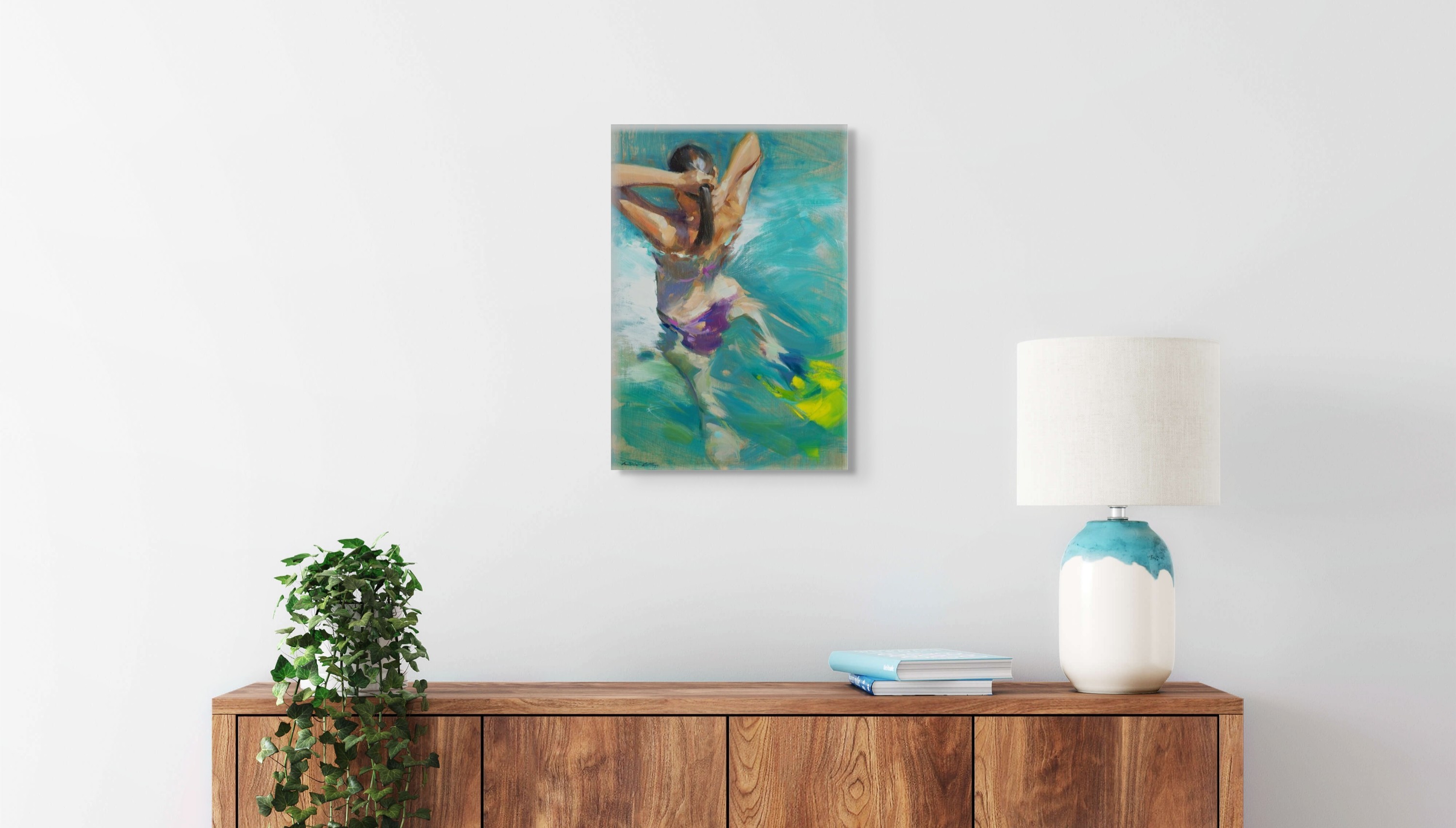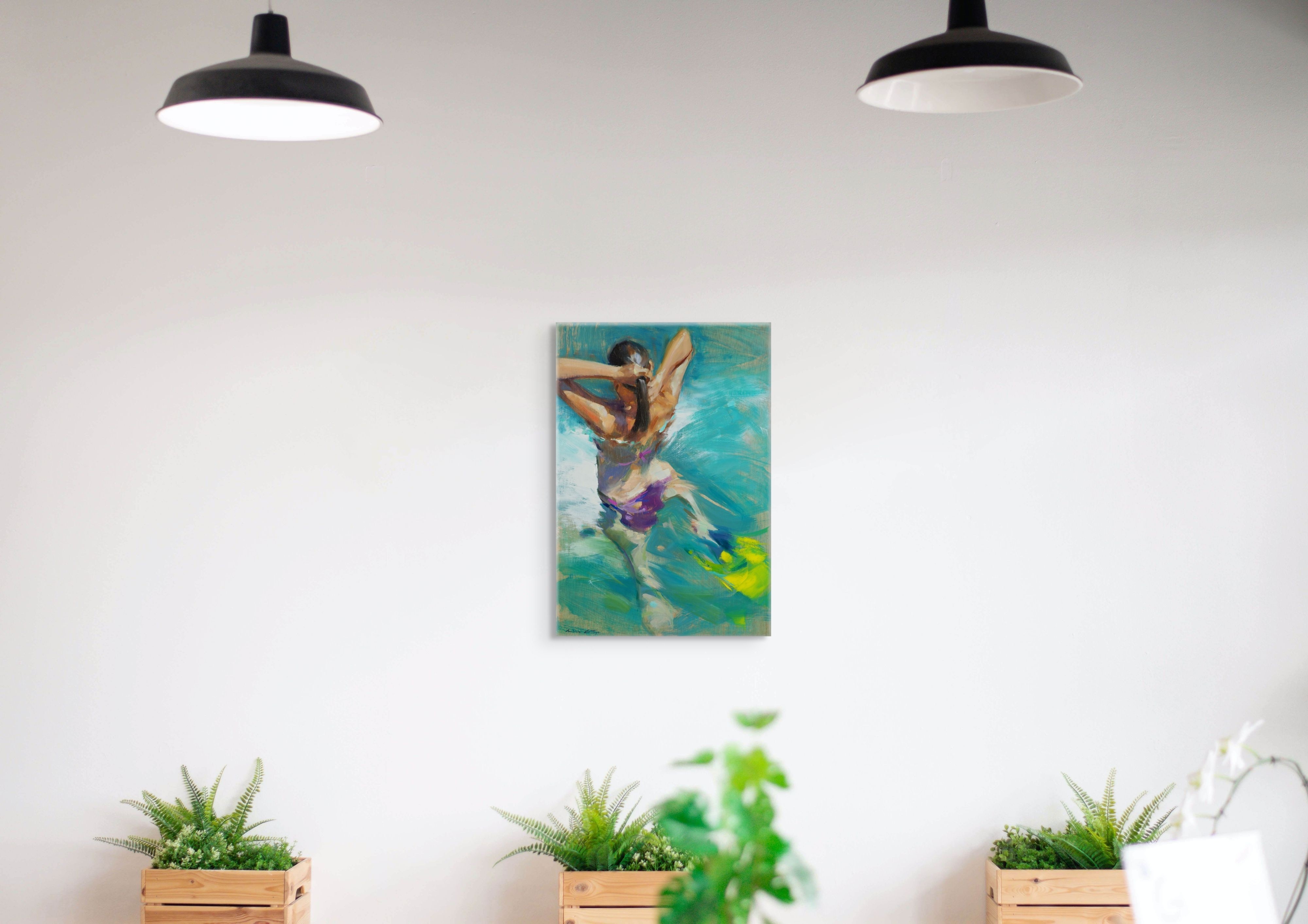 Originalkunstwerk der Künstlerin MONICA CASTANYS, das eine lichtdurchflutete Szene einer Frau im Wasser zeigt, im Moment der Bewegung festgehalten. Die ausdrucksstarken und lebendigen Ölpinselstriche vermitteln Dynamik und Frische durch eine Palette aus reichen, transluzenten Blau- und Grüntönen.