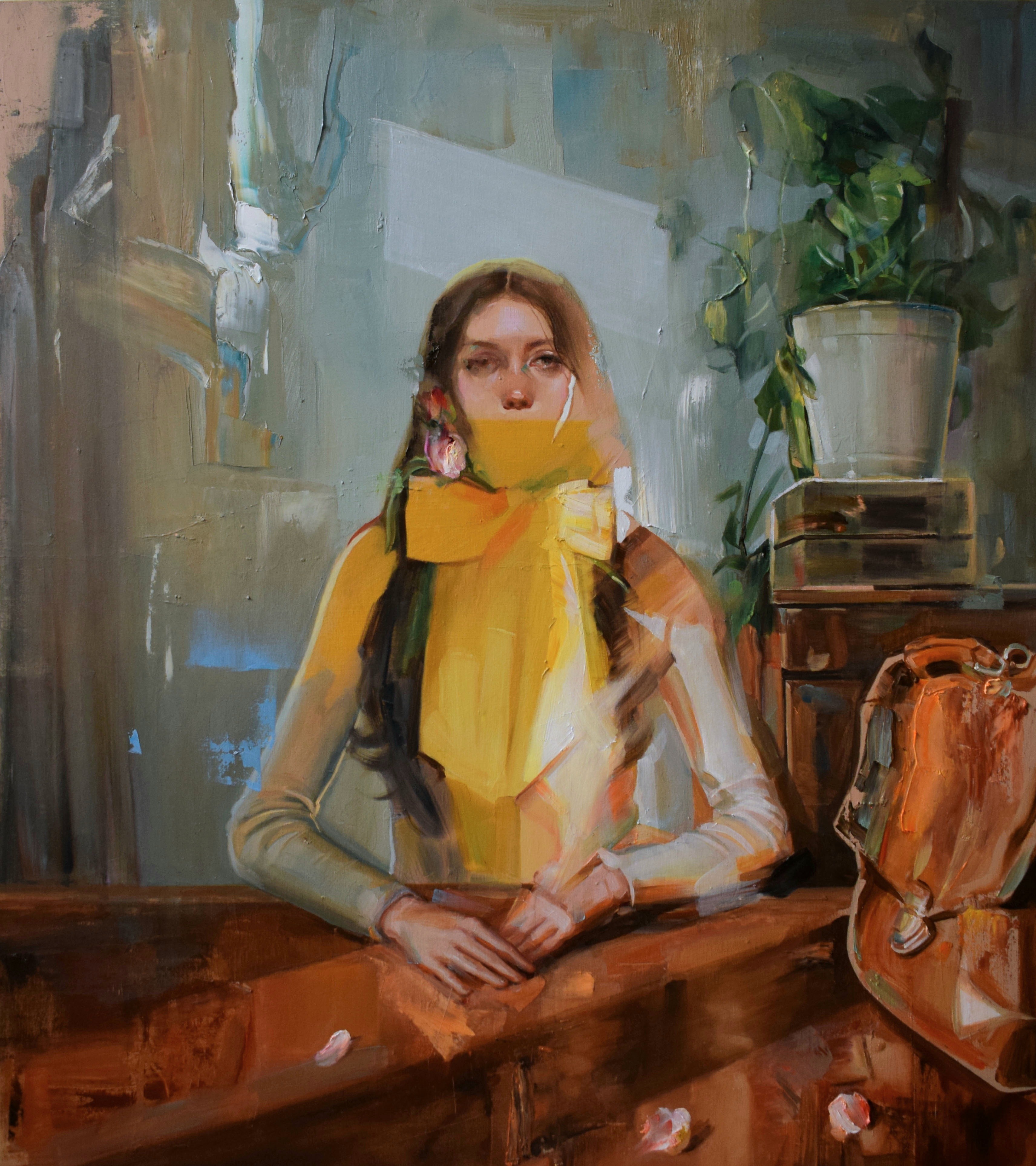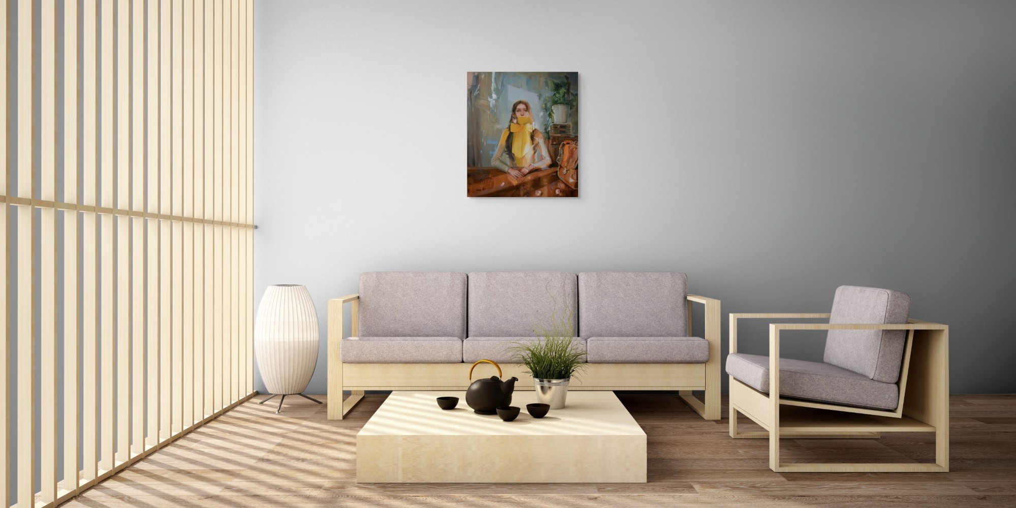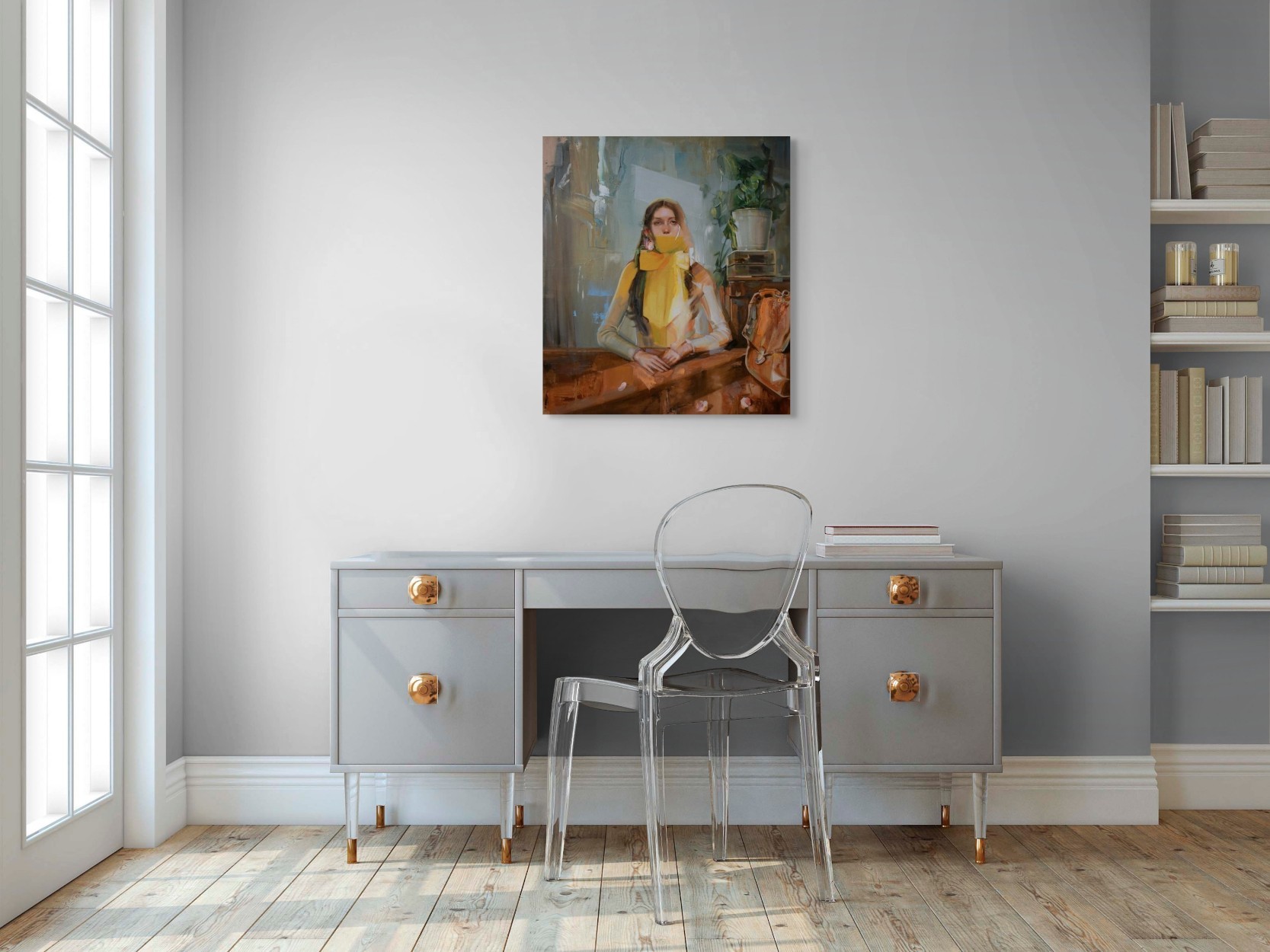 Originalwerk der Künstlerin EVITA ANDUJAR, zeigt ein Porträt einer Frau mit Zöpfen, deren unterer Gesichtsbereich von einem breiten Band oder einem leuchtend gelben Stoff bedeckt ist. Die Komposition, dominiert von warmen Erdtönen und Olivgrün, vermittelt Geheimnis oder Schutz in einem häuslichen Umfeld.