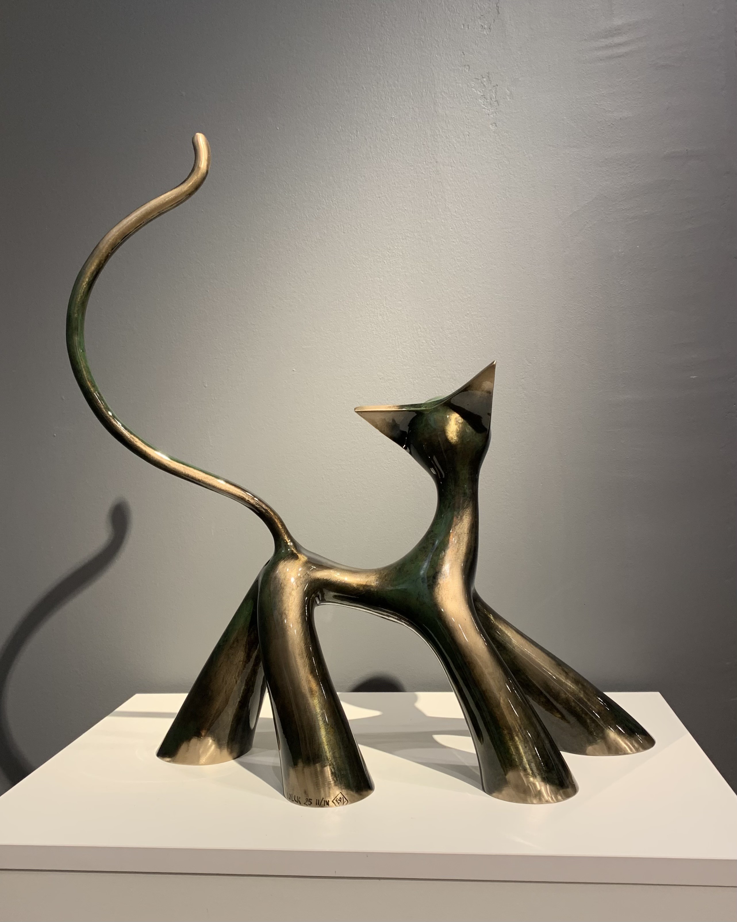 Diese originale und einzigartige Bronzeskulptur des Künstlers LOLEK ist ein zeitgenössisches und abstraktes Werk, das eine Katze darstellt. Ihr minimalistisches Design und ihre dynamischen Kurven vermitteln sowohl Bewegung als auch Eleganz, während ihre Patina ihr eine besondere künstlerische Tiefe verleiht. In einer modernistischen Ästhetik verankert, spielt diese Skulptur mit Volumen und Gleichgewicht und veranschaulicht perfekt die Arbeit von Lolek, einem Künstler, der für seine Bronzekreationen mit raffinierten organischen Linien bekannt ist.