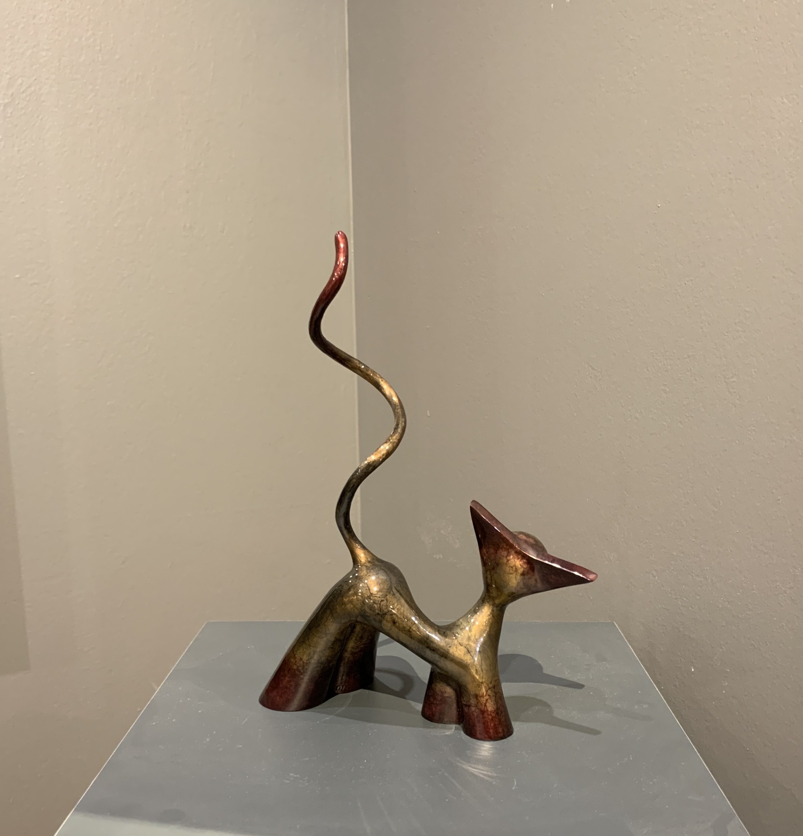 Diese originale und einzigartige Bronzeskulptur des Künstlers LOLEK ist ein zeitgenössisches und abstraktes Werk, das eine Katze im Kleinformat darstellt. Ihr minimalistisches Design und ihre dynamischen Kurven vermitteln zugleich Bewegung und Eleganz, während ihre Patina ihr eine besondere künstlerische Tiefe verleiht. In einer modernistischen Ästhetik verankert, spielt diese Skulptur mit Volumen und Gleichgewicht und veranschaulicht perfekt die Arbeit von Lolek, einem Künstler, der für seine Bronzekreationen mit raffinierten organischen Linien bekannt ist.