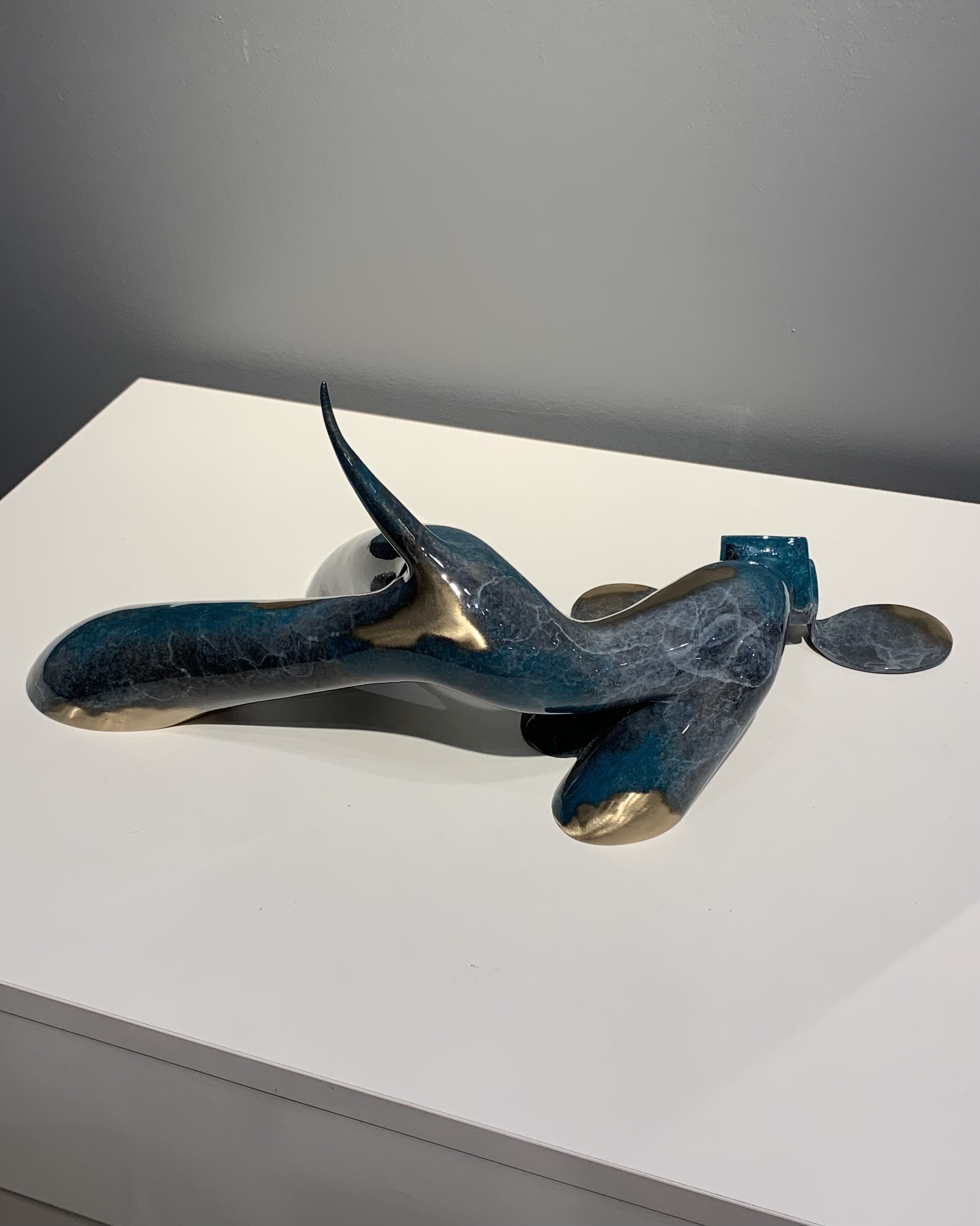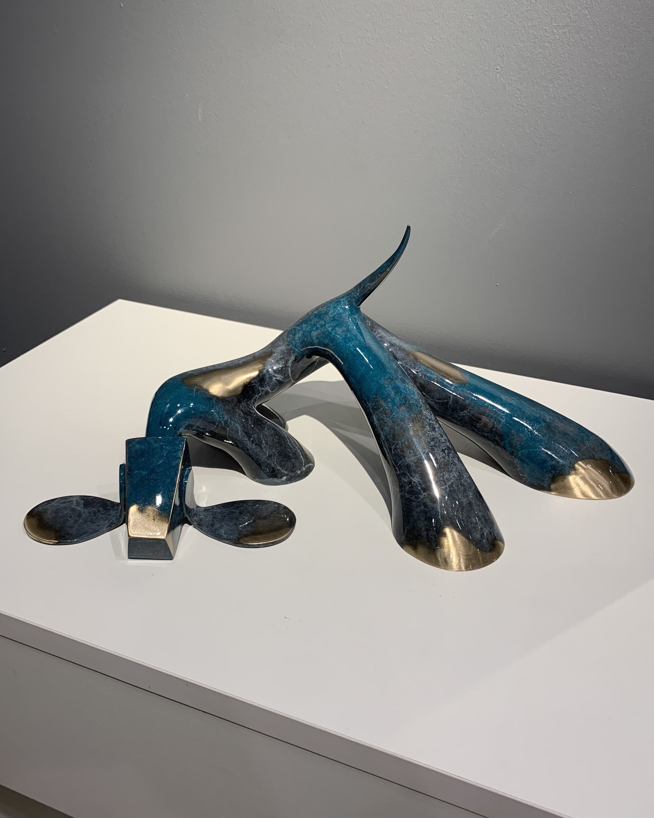 Skulptur aus grau und kobaltblau marmorierter Bronze, geschliffene Oberfläche.