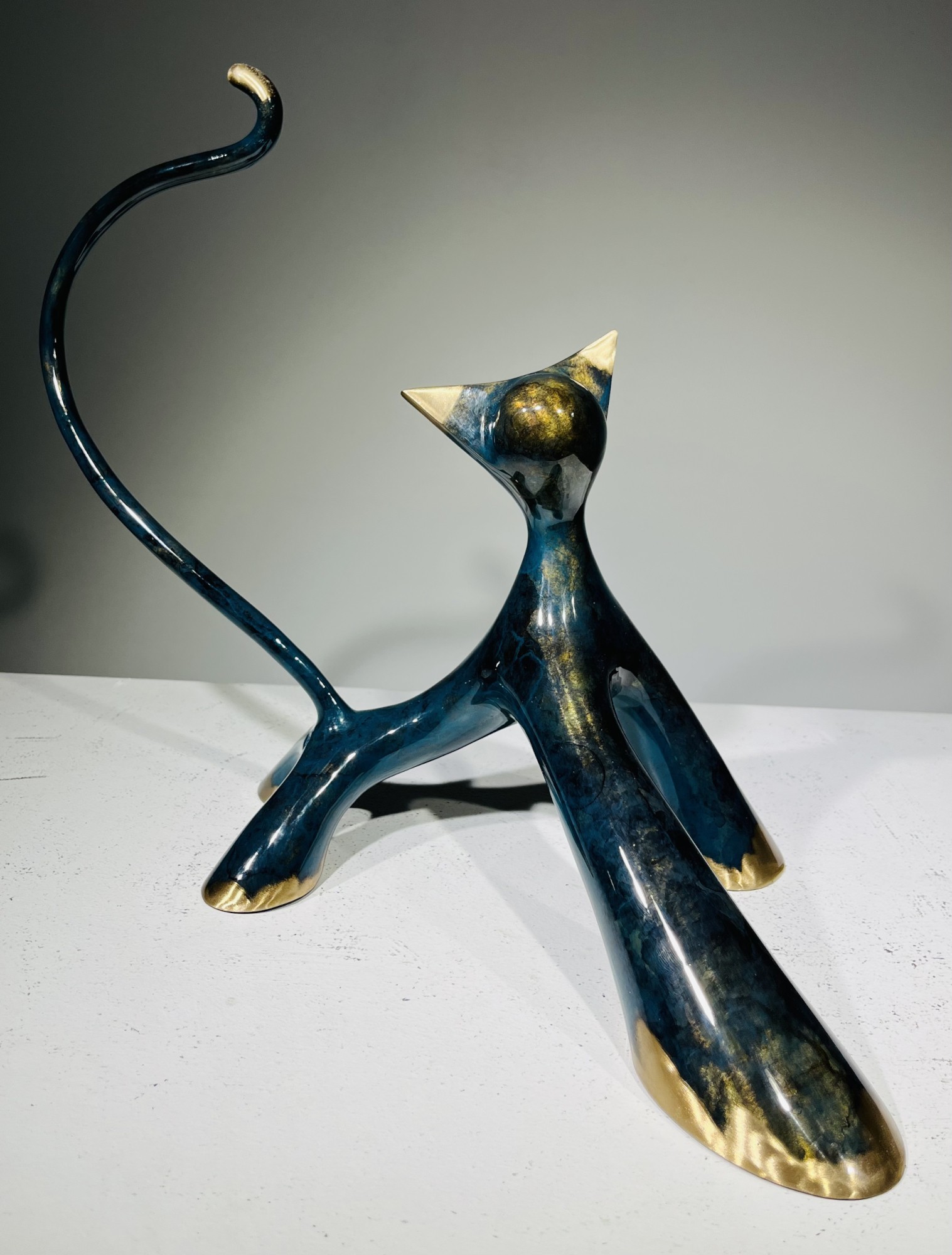 Sein Stil zeichnet sich durch klare und stilisierte Formen aus, die häufig von Tieren, insbesondere Katzen und Hunden, inspiriert sind. Als Meister der Bronze und der Patina verleiht er seinen Skulpturen eine einzigartige Tiefe und Lebendigkeit.