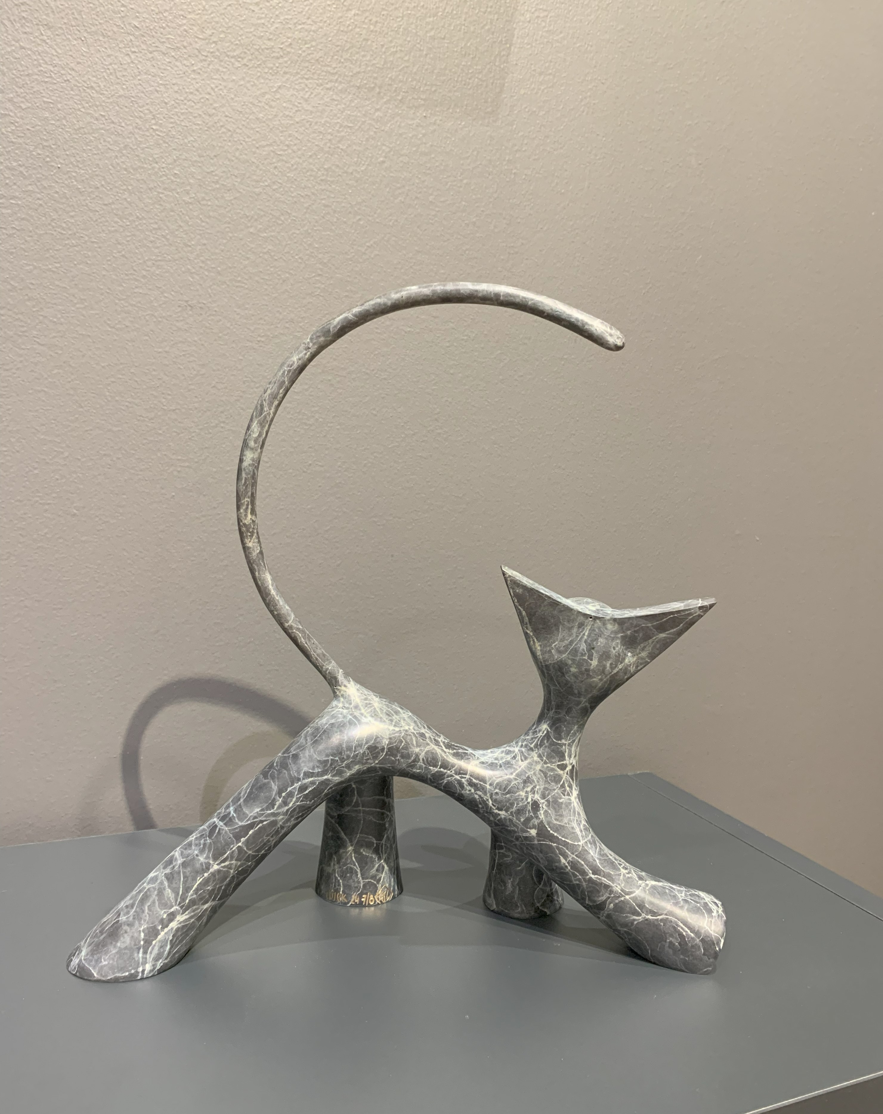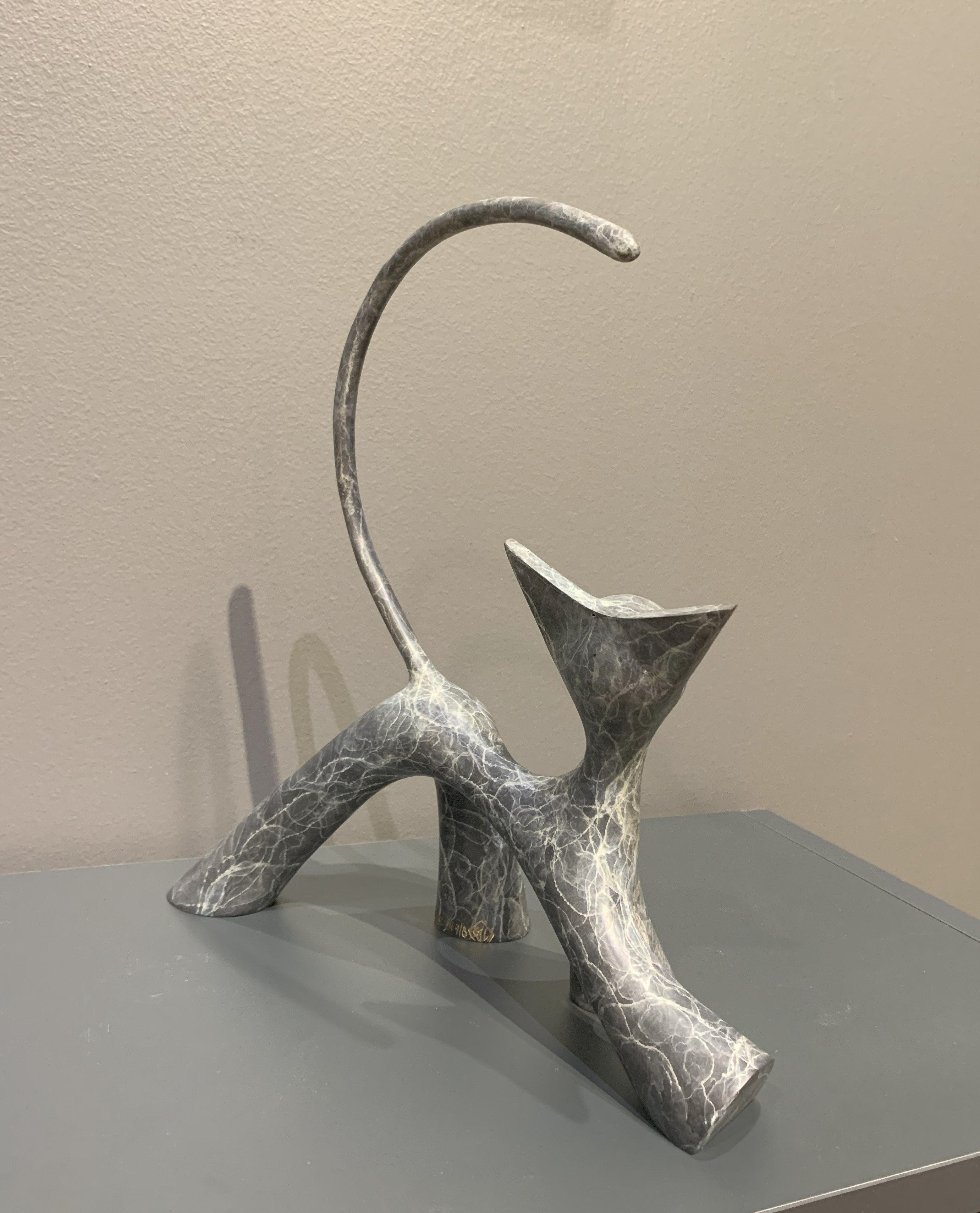 Diese originale und einzigartige Bronzeskulptur des Künstlers LOLEK ist ein zeitgenössisches und abstraktes Werk, das eine Katze im Kleinformat darstellt. Ihr minimalistisches Design und ihre dynamischen Kurven vermitteln zugleich Bewegung und Eleganz, während ihre Patina ihr eine besondere künstlerische Tiefe verleiht. In einer modernistischen Ästhetik verankert, spielt diese Skulptur mit Volumen und Gleichgewicht und veranschaulicht perfekt die Arbeit von Lolek, einem Künstler, der für seine Bronzekreationen mit raffinierten organischen Linien bekannt ist.