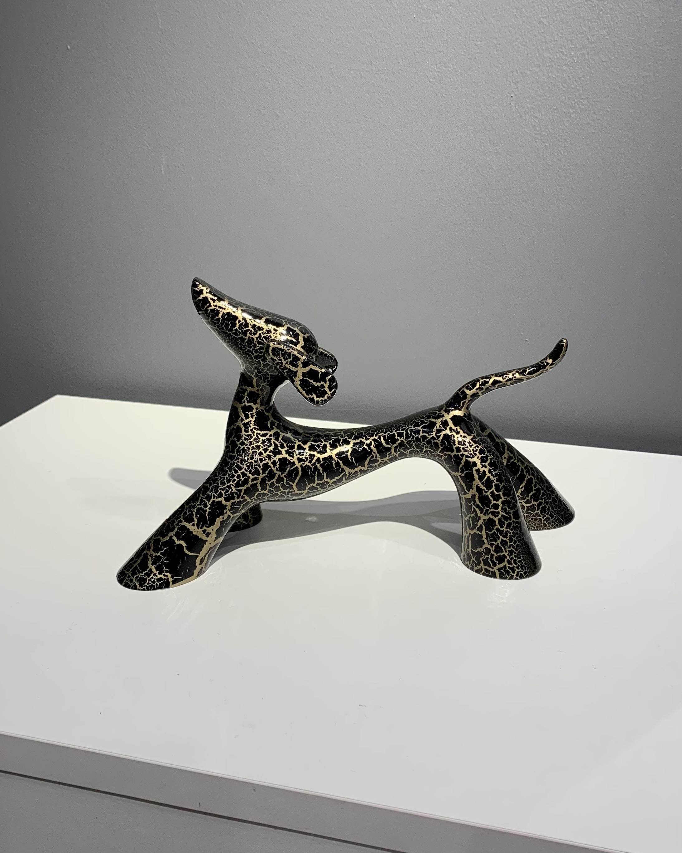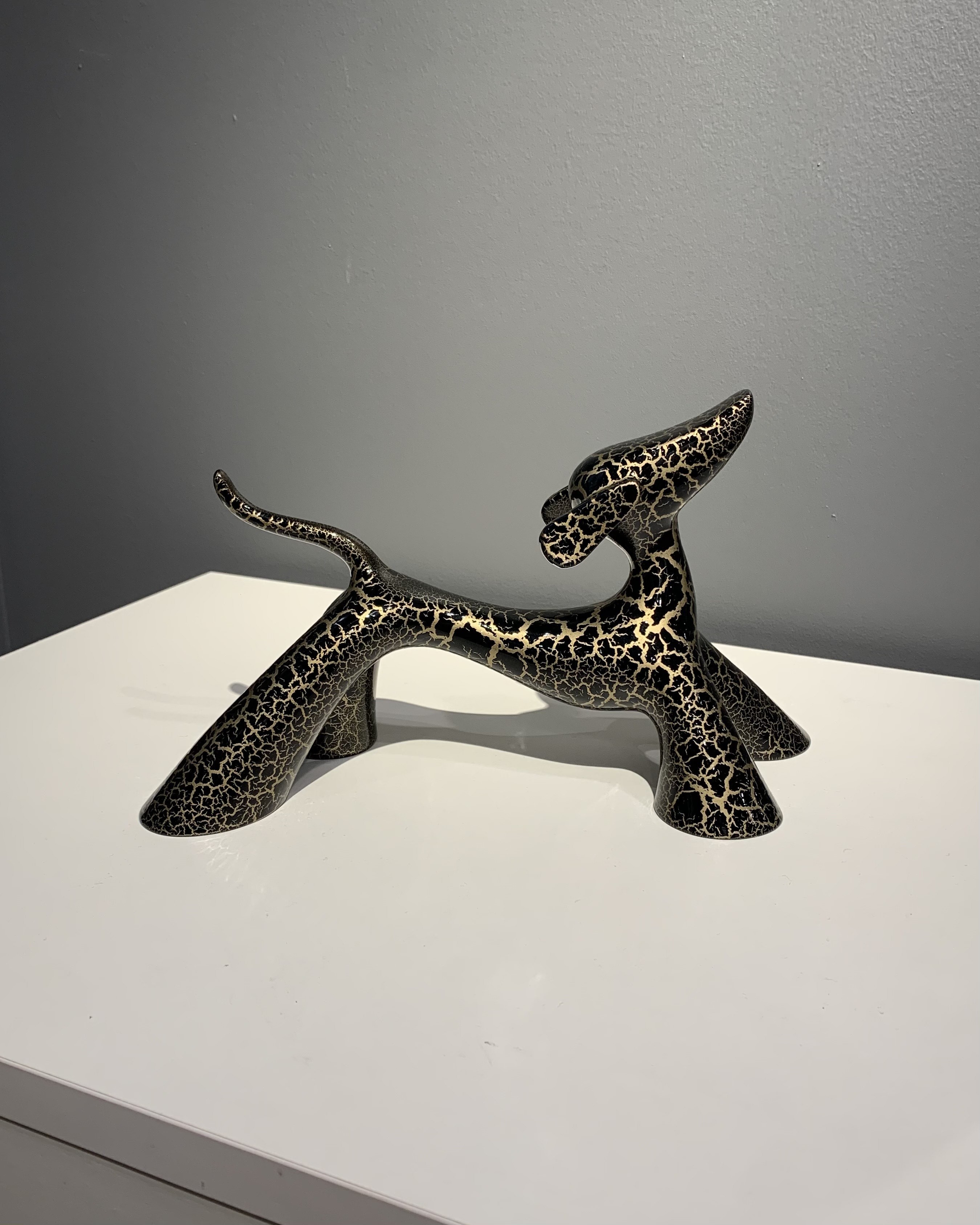 Diese originale und einzigartige Bronzeskulptur des Künstlers LOLEK ist ein zeitgenössisches und abstraktes Werk, das einen Hund im Kleinformat darstellt. Ihr minimalistisches Design und ihre dynamischen Kurven vermitteln zugleich Bewegung und Eleganz, während ihre Patina ihr eine besondere künstlerische Tiefe verleiht. In einer modernistischen Ästhetik verankert, spielt diese Skulptur mit Volumen und Gleichgewicht und veranschaulicht perfekt die Arbeit von Lolek, einem Künstler, der für seine Bronzekreationen mit raffinierten organischen Linien bekannt ist.