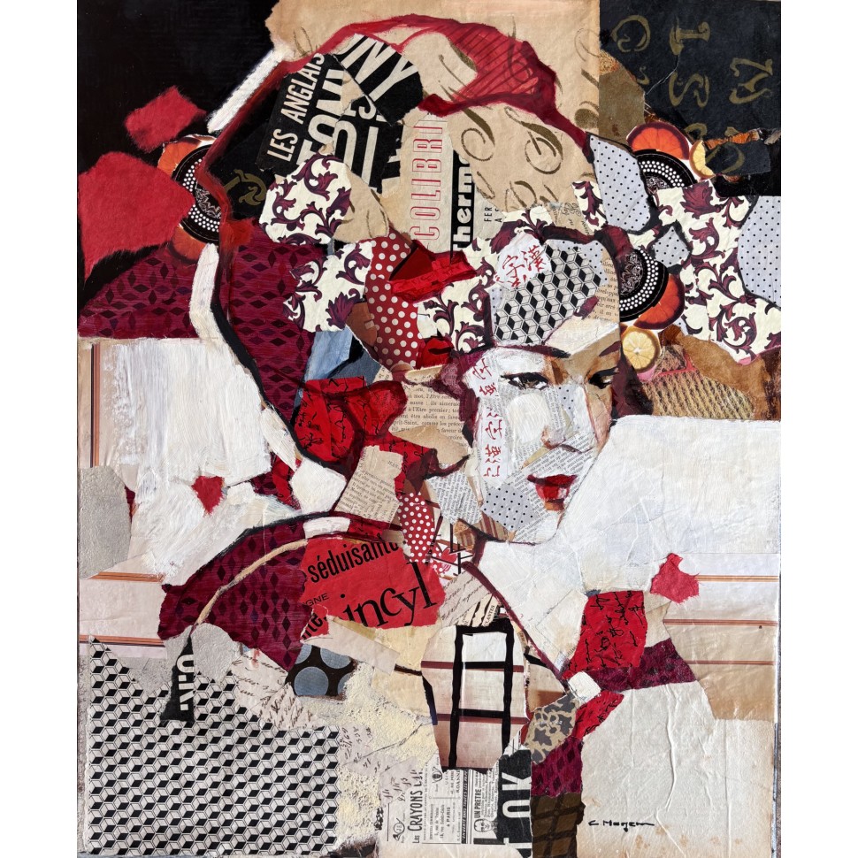 Obra original de Carme Magem , artista collagista conocida por sus retratos notablemente expresivos, compuestos con recortes de periódicos y fragmentos de cartas y escritos antiguos.