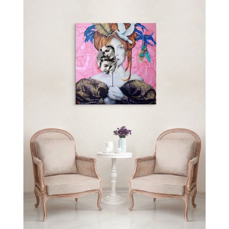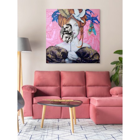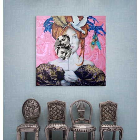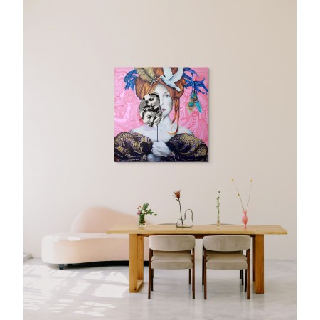 Pintura original del artista Elia Pagliarino, cuyo trabajo a menudo se caracteriza por formas de carácter étnico o retro. Su interés por la antropología y las representaciones de Oceanía confiere un carácter muy singular a sus representaciones imaginarias.