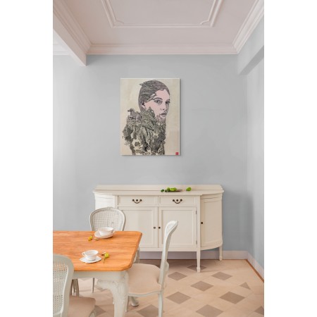 Pintura original del artista Elia Pagliarino, cuyo trabajo a menudo se caracteriza por formas de carácter étnico o retro. Su interés por la antropología y las representaciones de Oceanía confiere un carácter muy singular a sus representaciones imaginarias.