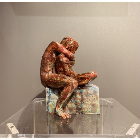 Sculpture en céramique originale et unique de l'artiste MASTROMATTEO, Un couple assis, aux formes simples et épurées, figée dans un instant de calme et de réflexion. Recouverte d’un lustro métallique, la sculpture capte la lumière et dégage une atmosphère méditative typique de MASTROMATTEO.