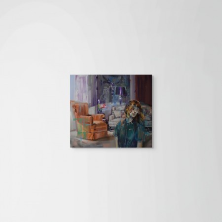 Œuvre originale de l'artiste EVITA ANDUJAR, qui est un portrait aux couleurs délavées d'une femme rousse au premier plan, dont le visage est partiellement obscurci par un effet de flou ou de mouvement, sur fond d'un salon décoré. La palette est dominée par des teintes de violet, de rouille et de vert, suggérant une présence éphémère ou un souvenir.