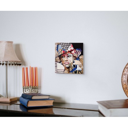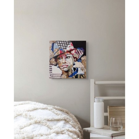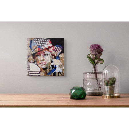 Œuvre originale de l'artiste Carme Magem, portrait de Sophia Loren en collage joue avec des papiers imprimés, des textures neutres et des contrastes graphiques.