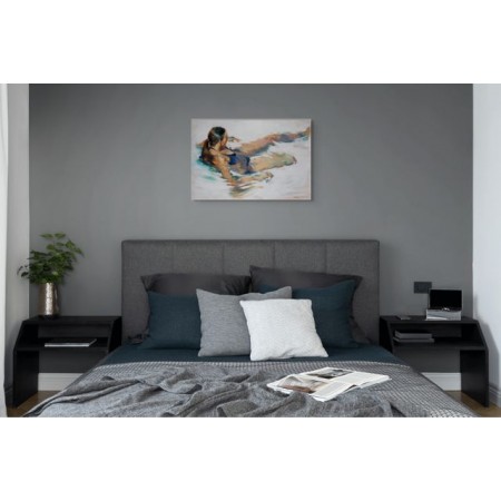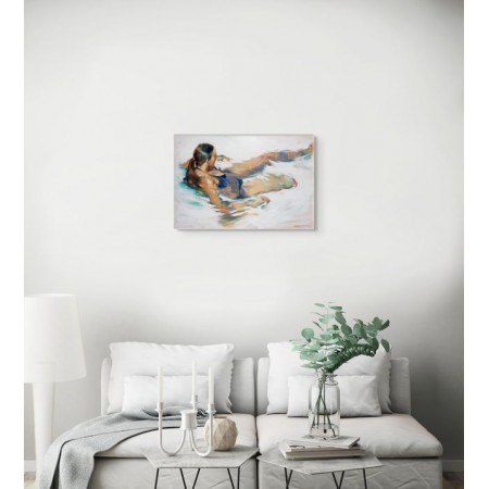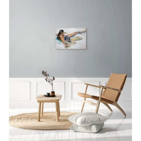 Œuvre originale de l'artiste MONICA CASTANYS, capture une femme nage ou flotte dans l’eau, baignée de lumière. Les nuances de bleu et d’orangé se fondent dans un mouvement fluide, évoquant la liberté et la douceur estivale.