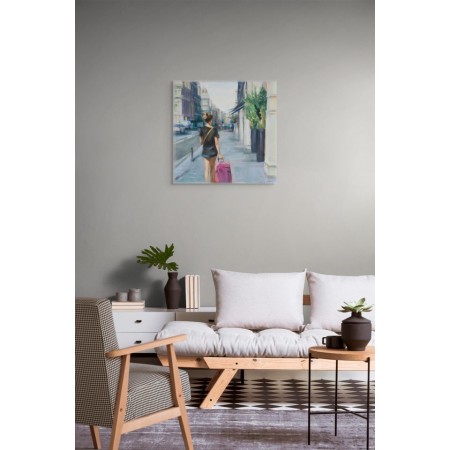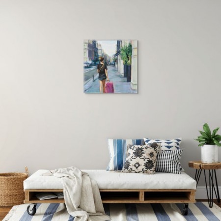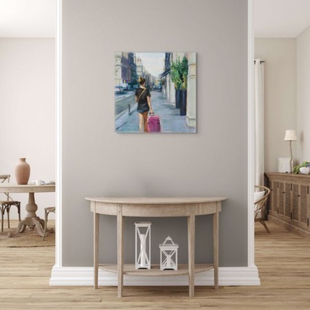 Œuvre originale de l'artiste MONICA CASTANYS, capture une jeune femme vue de dos, marchant sur un trottoir urbain en tirant une valise rose. Les couleurs douces et la lumière chaude suggèrent une atmosphère de départ ou de voyage au petit matin.