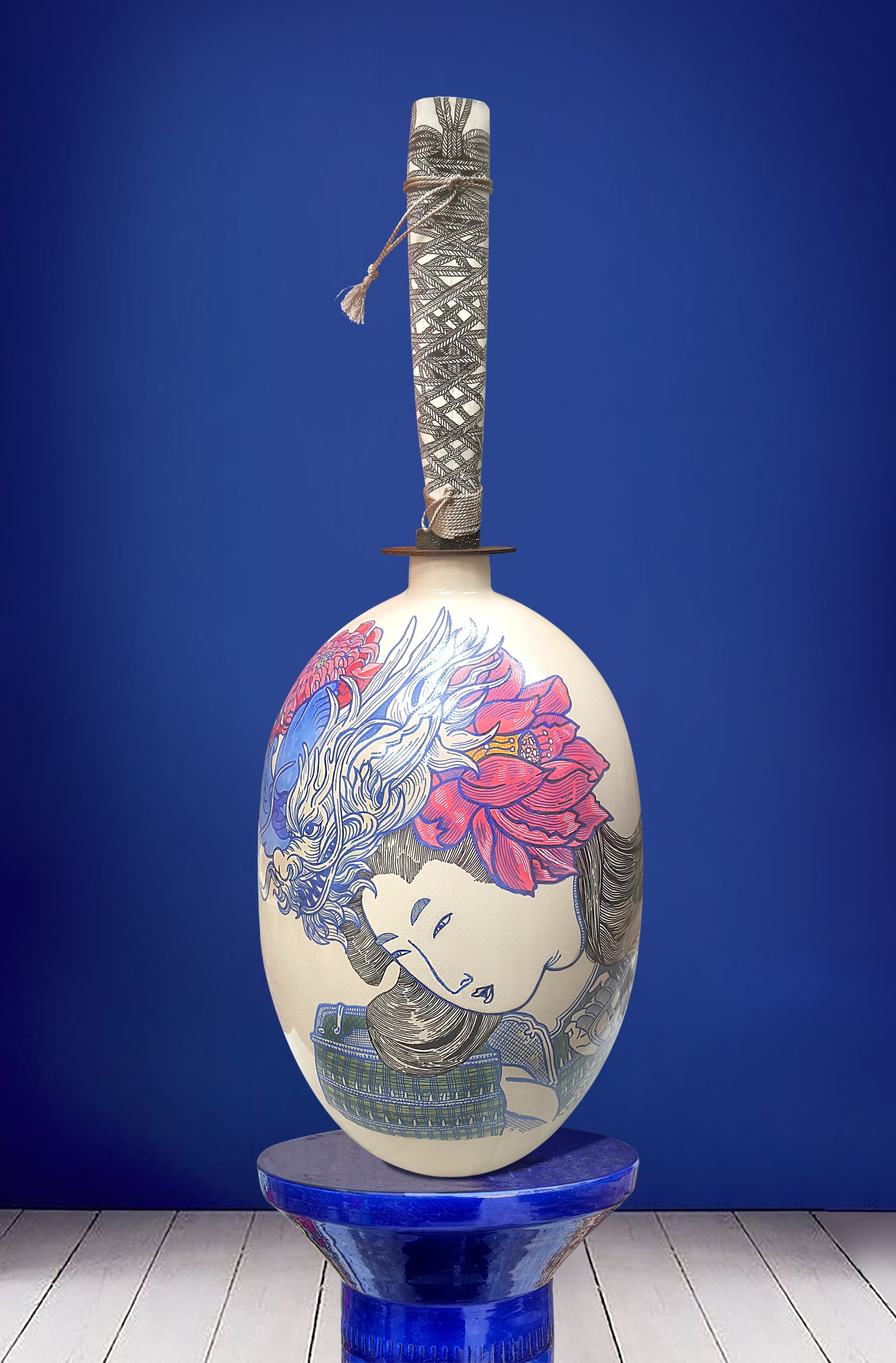Œuvre originale de l'artiste Elia Pagliarino,réalisée en double cuisson, inspirée de l'esthétique japonaise dont le manche évoque un katana. On y voit un portrait de femme en kimono, des fleurs et un guerrier samouraï, illustrant l’histoire de Masako, l’une des rares femmes samouraï. La juxtaposition des éléments floraux délicats avec l'imagerie guerrière évoque la dualité de force et de grâce propre à cette figure historique féminine.