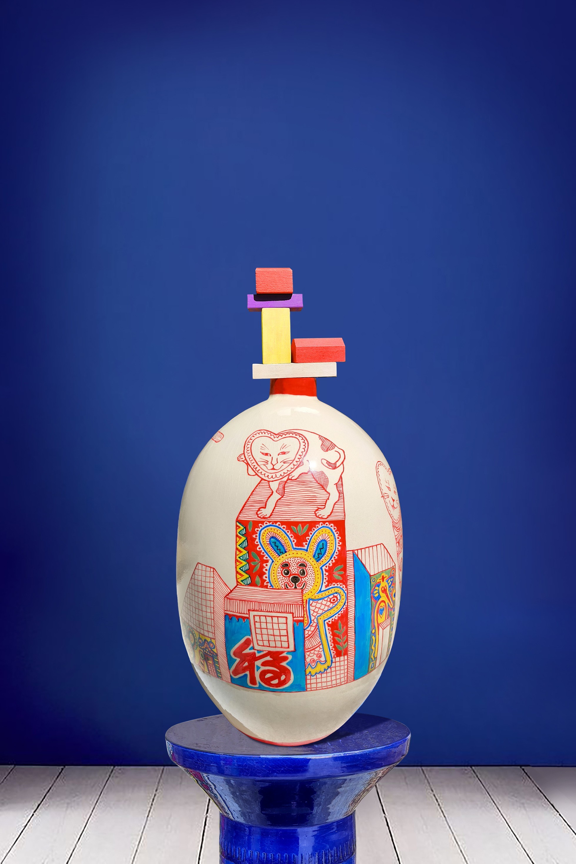 Céramique originale de l'artiste Elia Pagliarino, dont le travail est souvent caractérisé par des formes au caractère ethnique ou rétro. Son intérêt pour l'anthropologie et les représentations venues d'Océanie donne un caractère tout à fait singulier à ses figurations imaginaires.