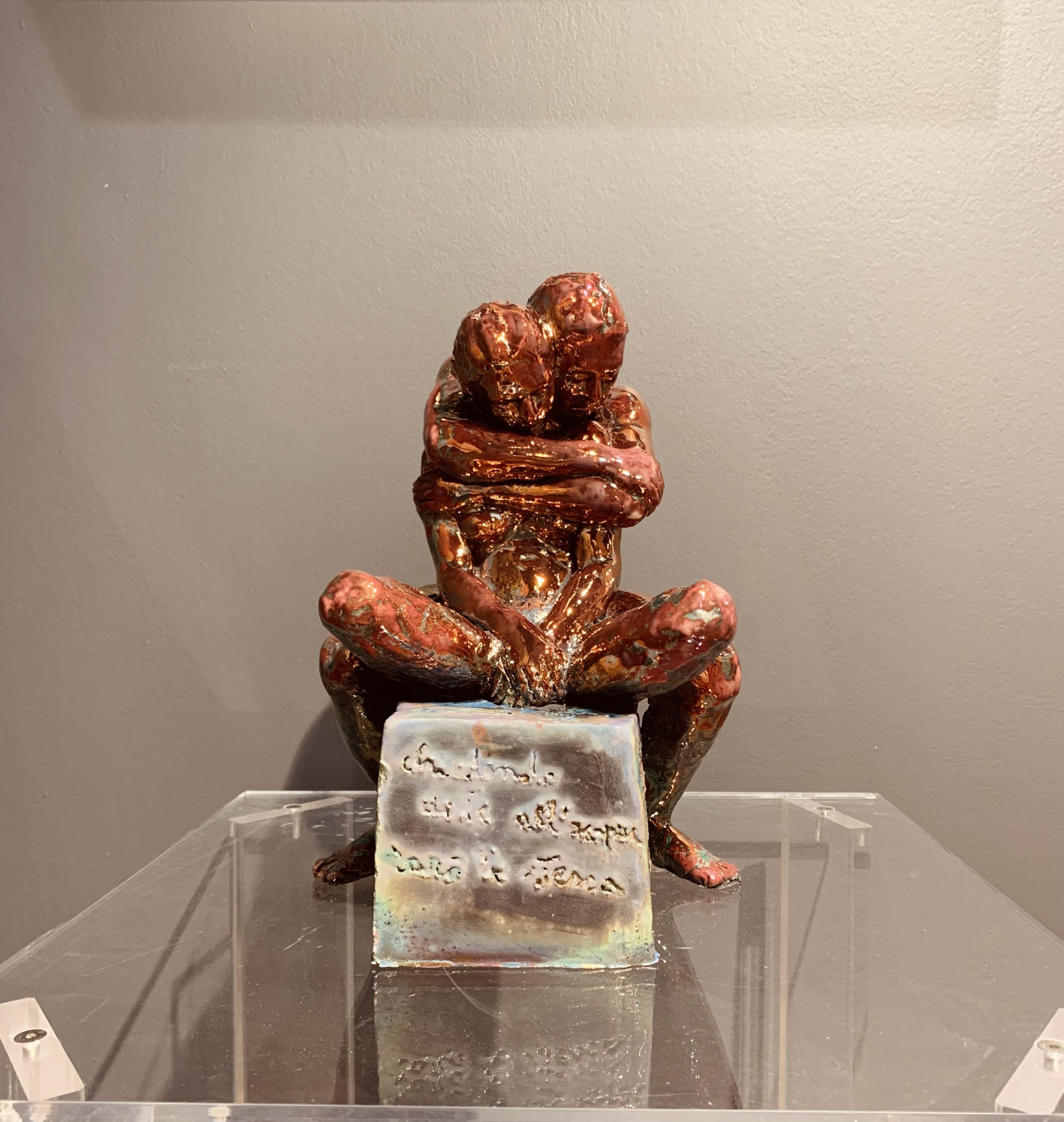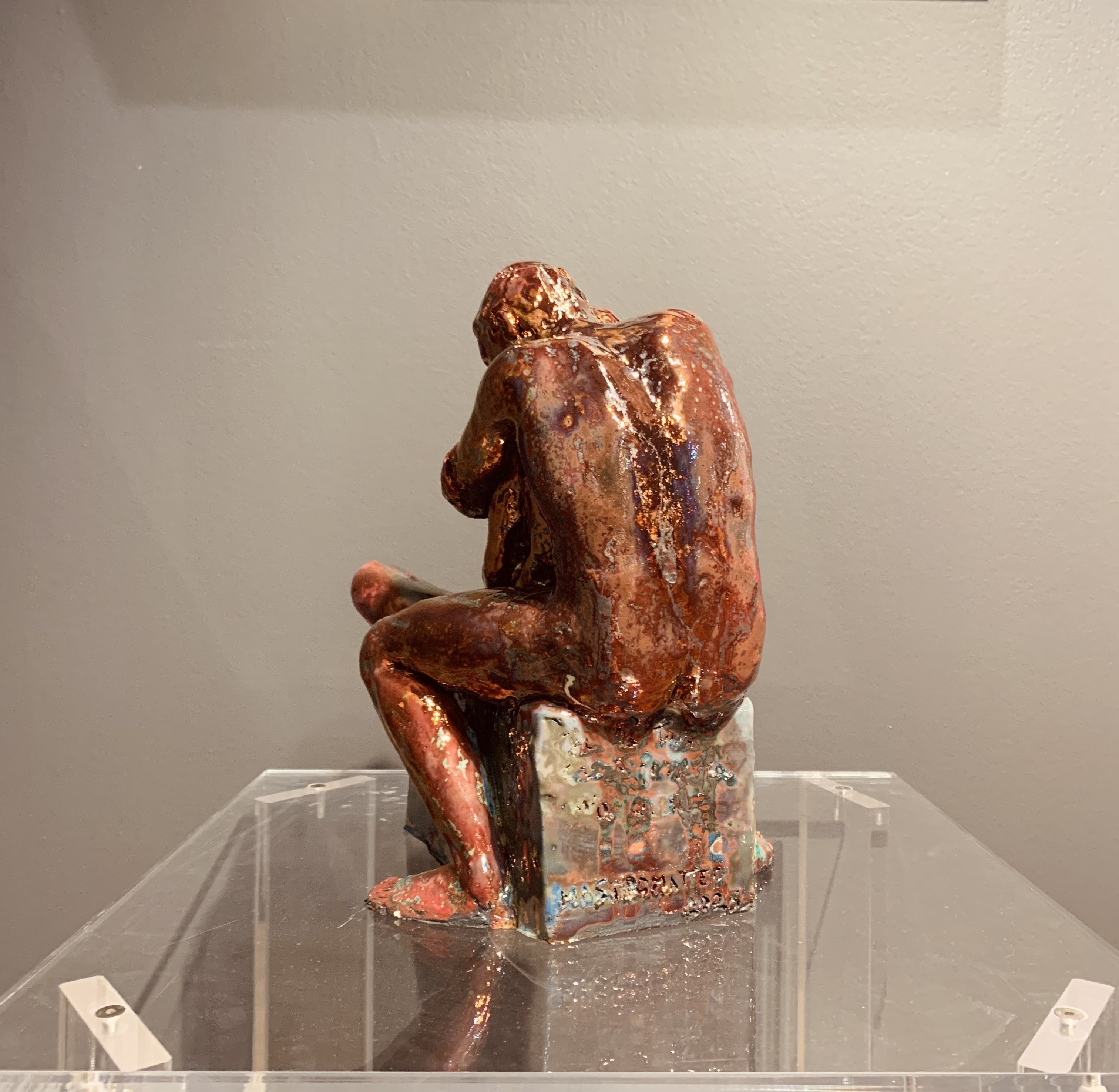 Sculpture en céramique originale et unique de l'artiste MASTROMATTEO, d'un couple assis, aux formes simples et épurées, figée dans un instant de calme et de réflexion. Recouverte d’un lustro métallique, la sculpture capte la lumière et dégage une atmosphère méditative typique de MASTROMATTEO.