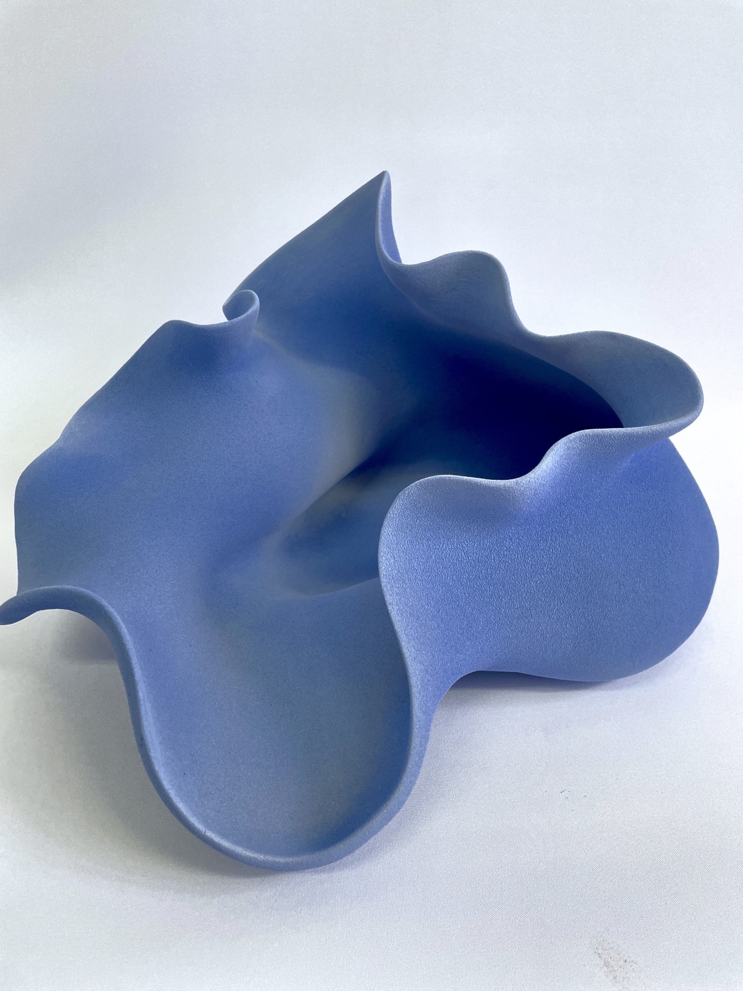 Sculpture en céramique originale et unique de l'artiste DEMEESTER, d’un bleu uniforme, avec une forme organique qui évoque le mouvement. La pièce semble tourner et se plier sur elle-même. Les surfaces paraissent légèrement texturées. L’ensemble rappelle une danse de formes abstraites, sans angles rigides, avec un équilibre subtil.