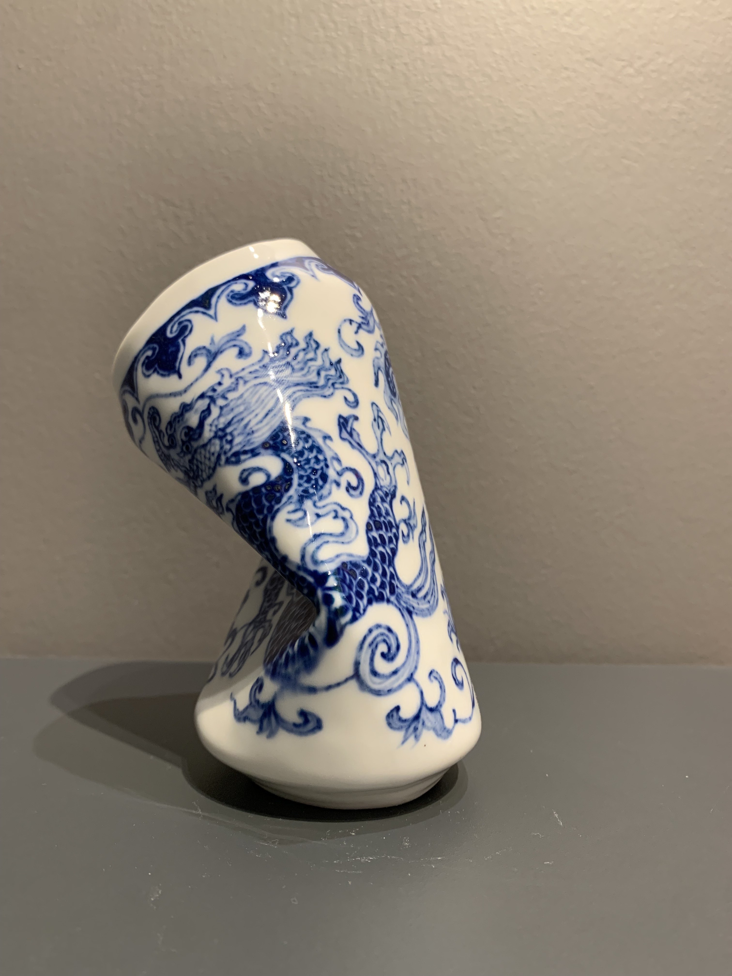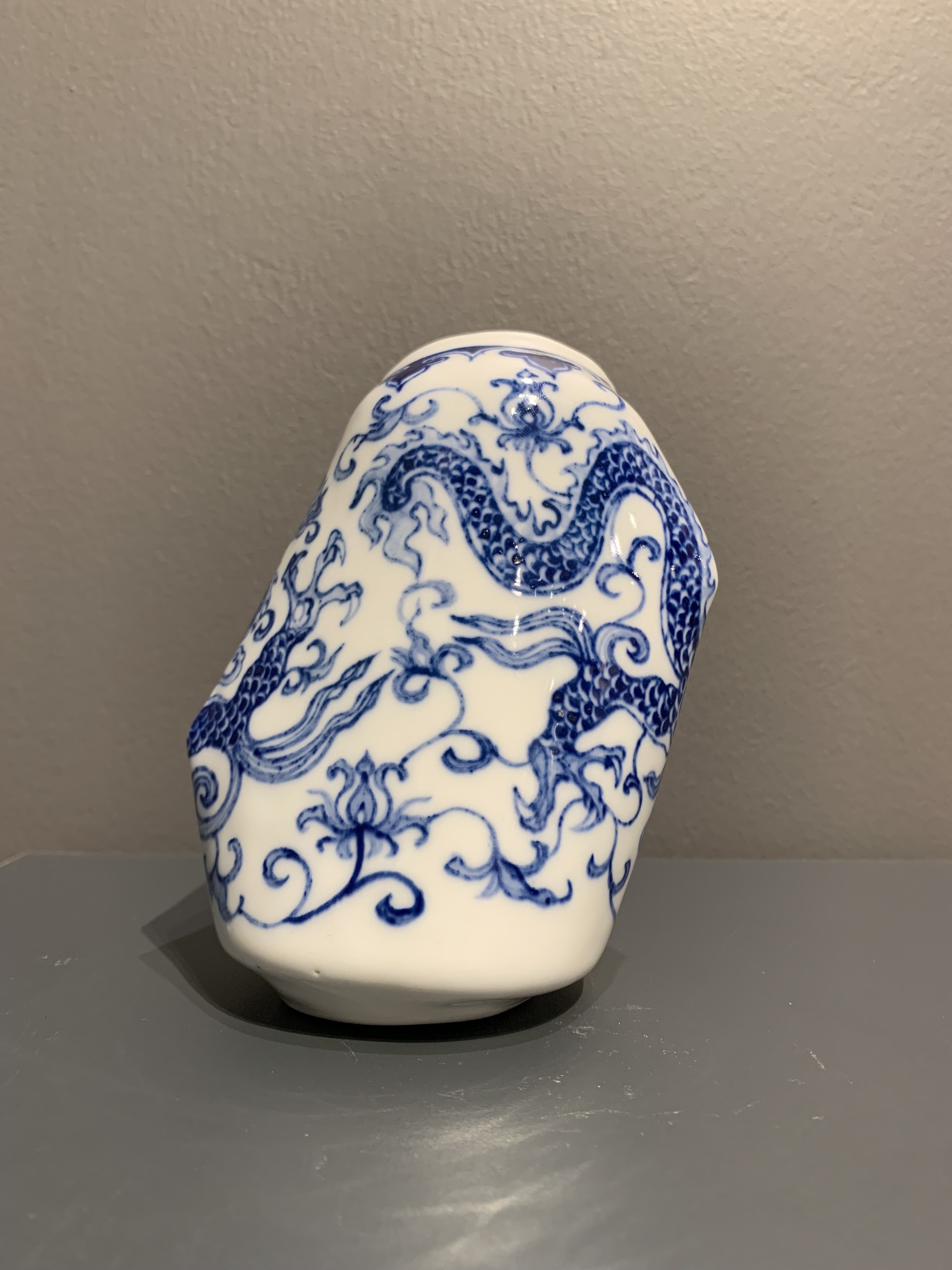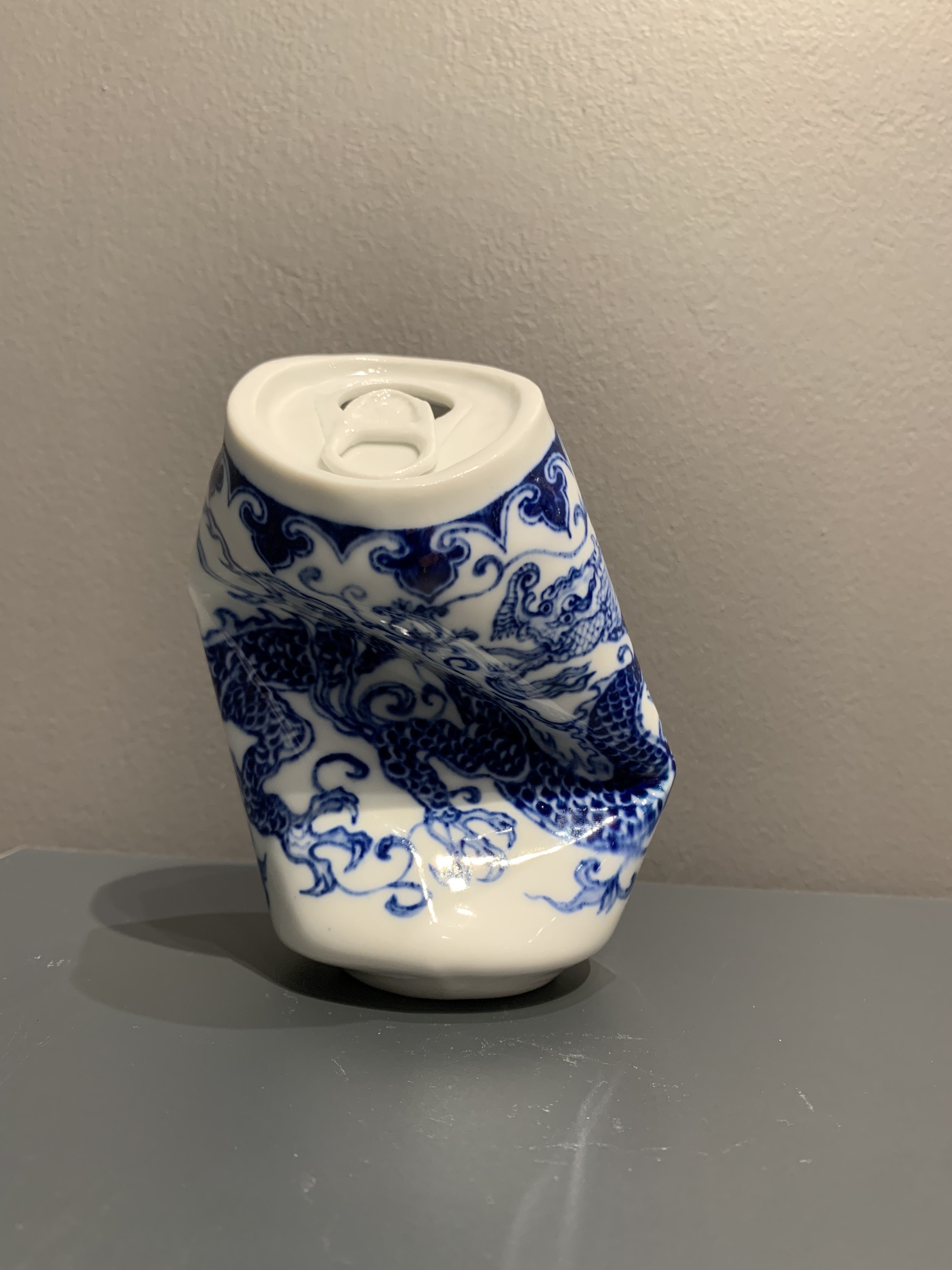 Sculpture en porcelaine originale et unique de l'artiste XUEsoigneusement modelée et peinte à la main en bleu, imitant une canette métallique écrasée tout en évoquant la délicatesse des vases de la dynastie Ming.