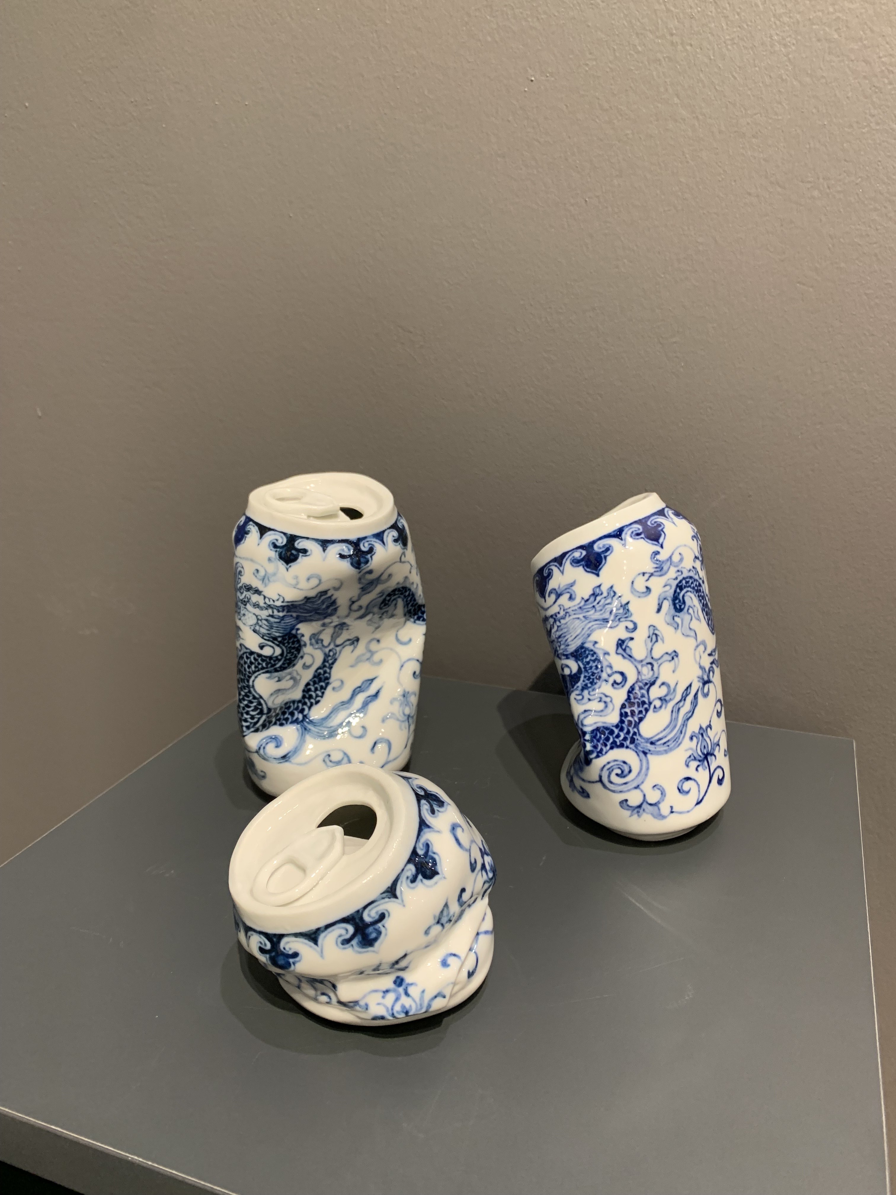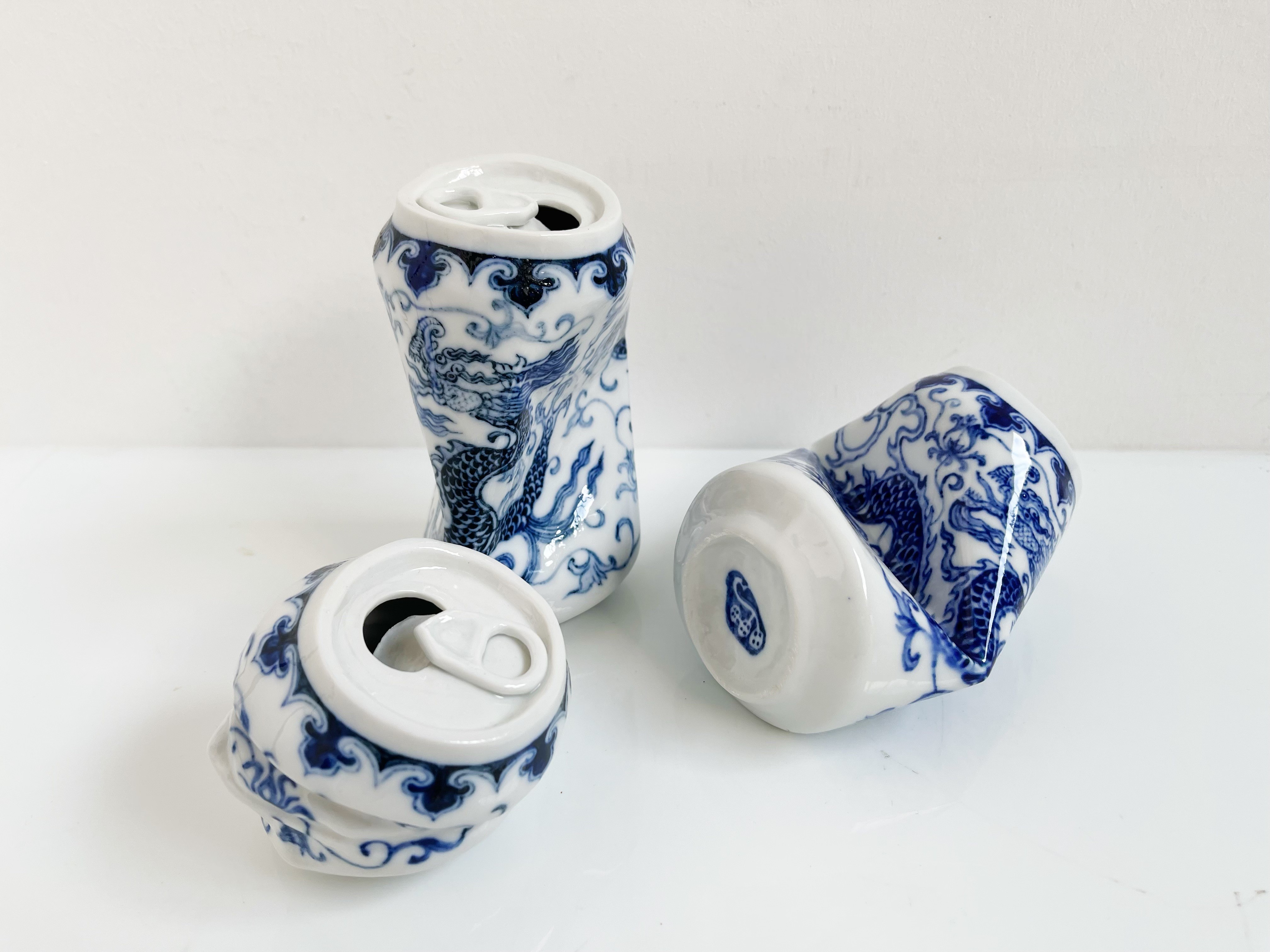 Lei Xue est un artiste chinois multidisciplinaire — sculpteur, peintre, photographe et artiste vidéo — dont la série Drinking Tea, lancée au début des années 2000, détourne des canettes écrasées en porcelaine inspirée de l’esthétique Ming.