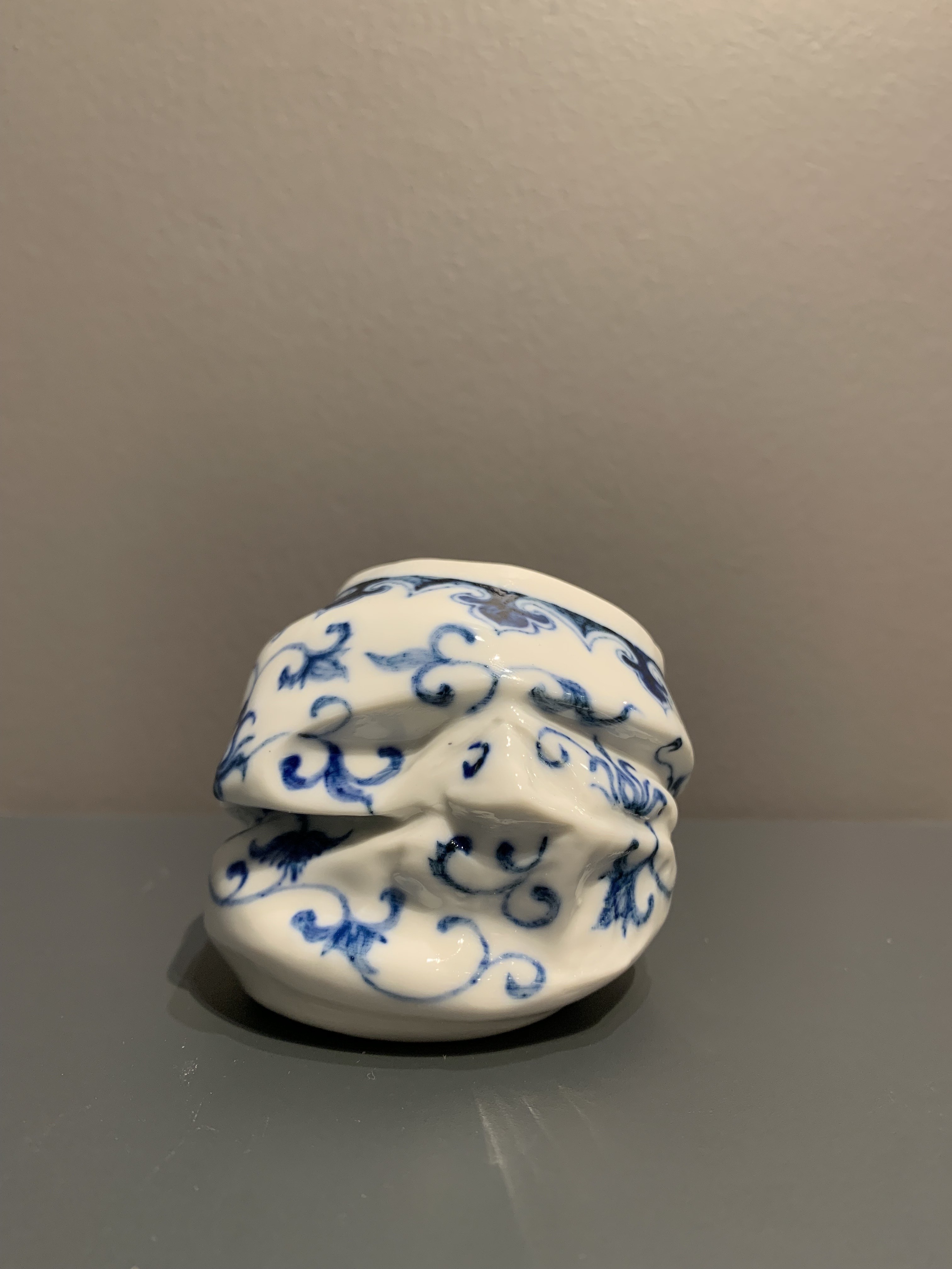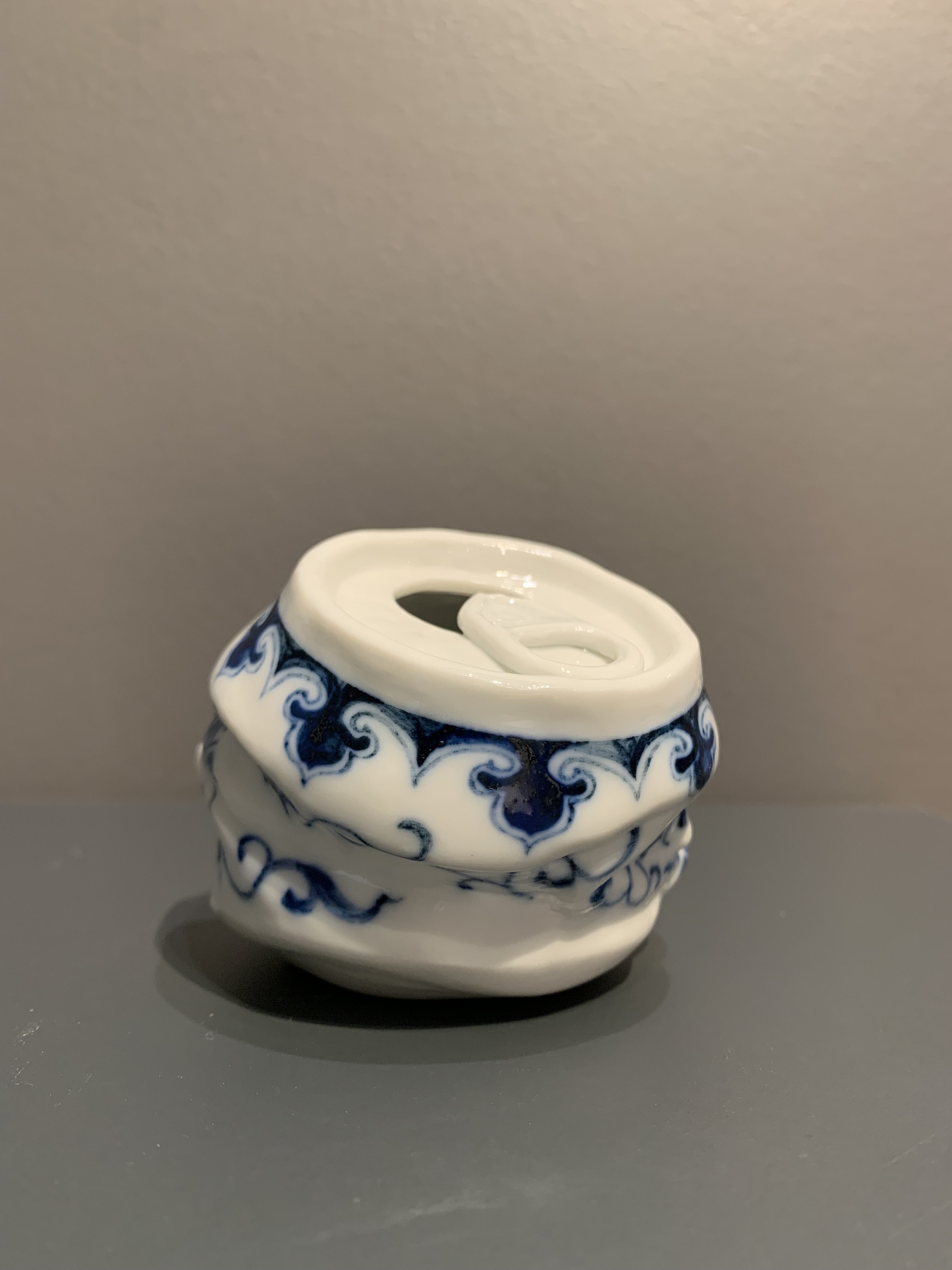 Sculpture en porcelaine originale et unique de l'artiste XUEsoigneusement modelée et peinte à la main en bleu, imitant une canette métallique écrasée tout en évoquant la délicatesse des vases de la dynastie Ming.
