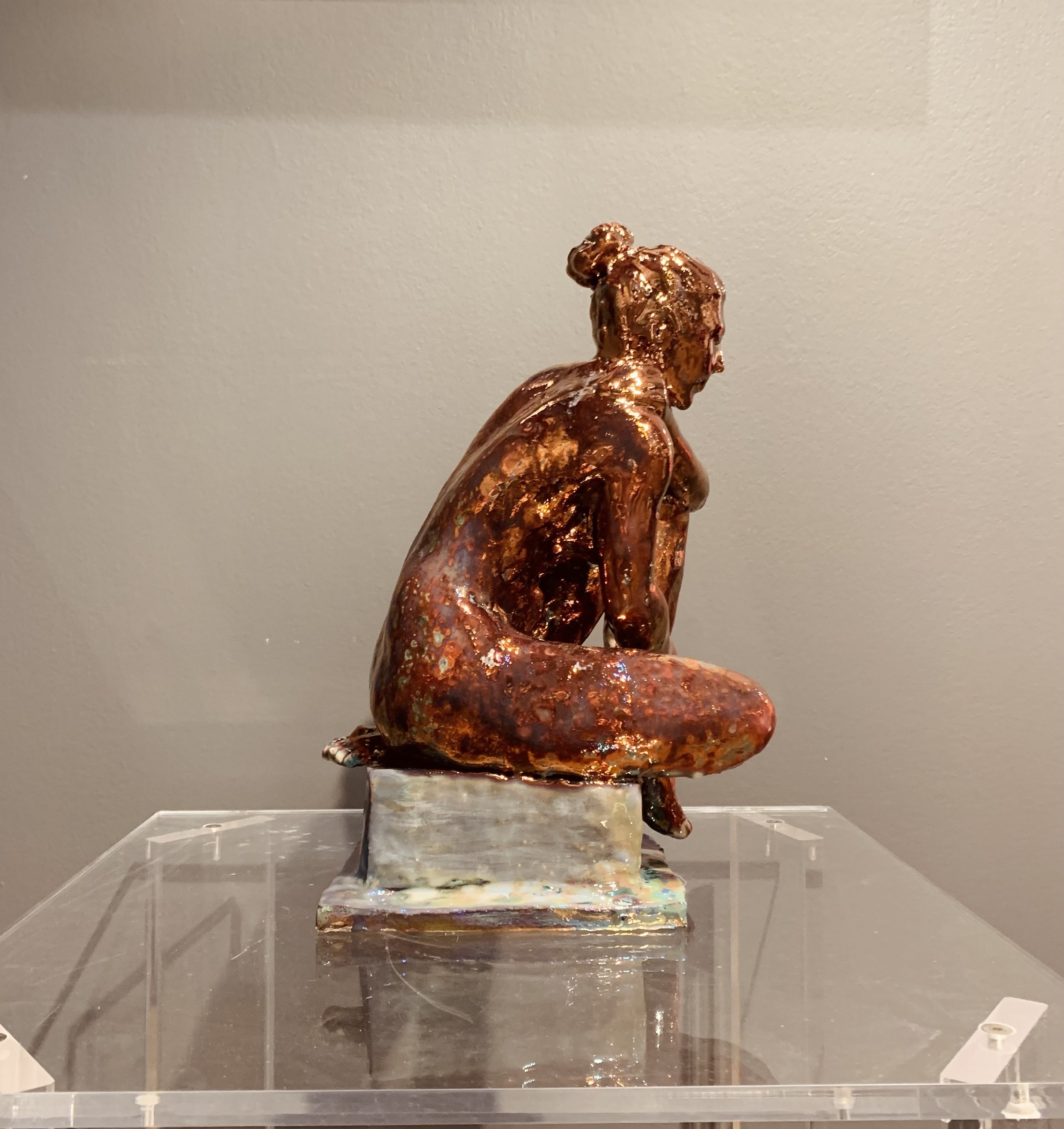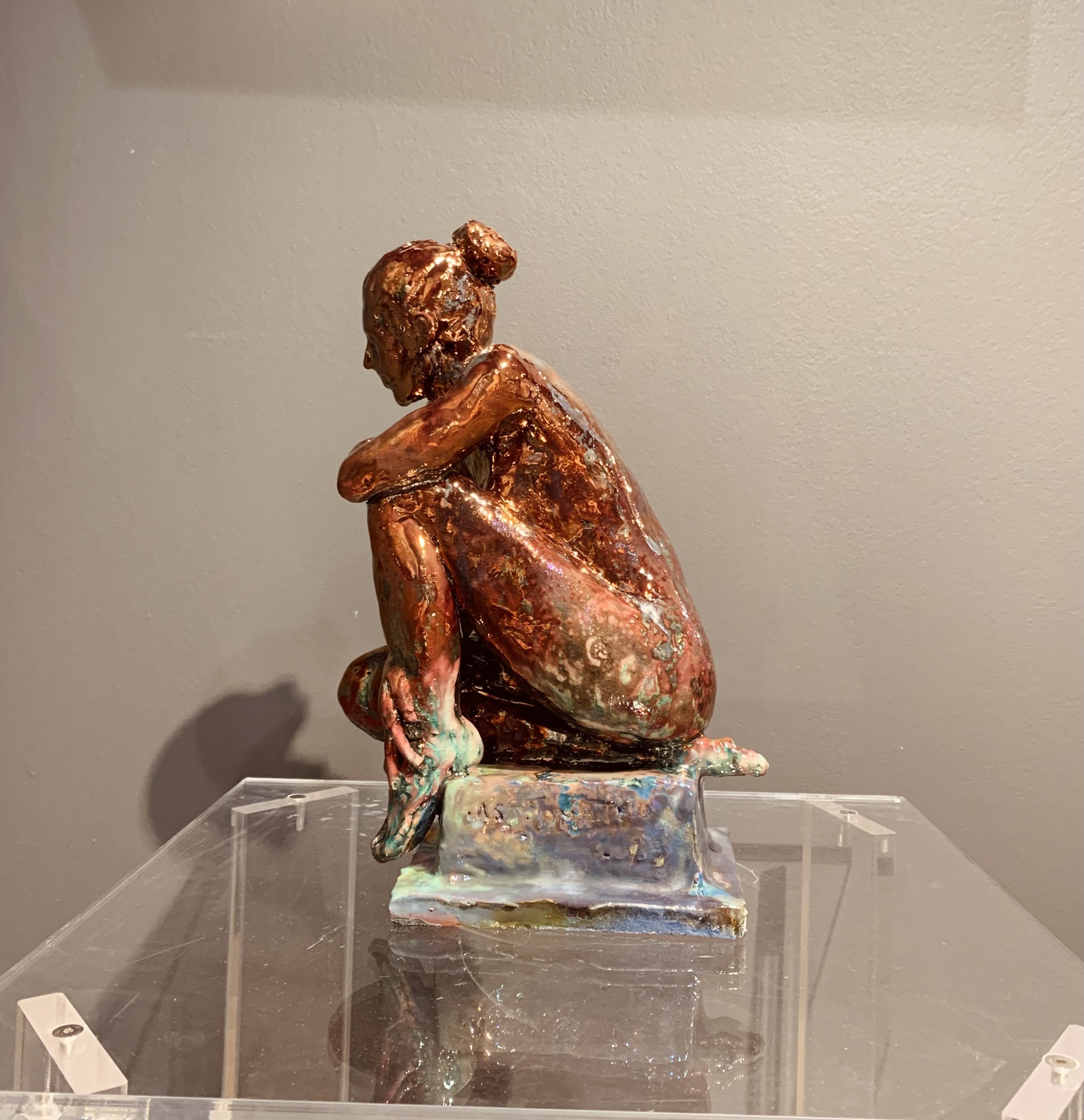 Sculpture en céramique originale et unique de l'artiste MASTROMATTEO, d'une femme assise, aux formes simples et épurées, figée dans un instant de calme et de réflexion. Recouverte d’un lustro métallique, la sculpture capte la lumière et dégage une atmosphère méditative typique de MASTROMATTEO.