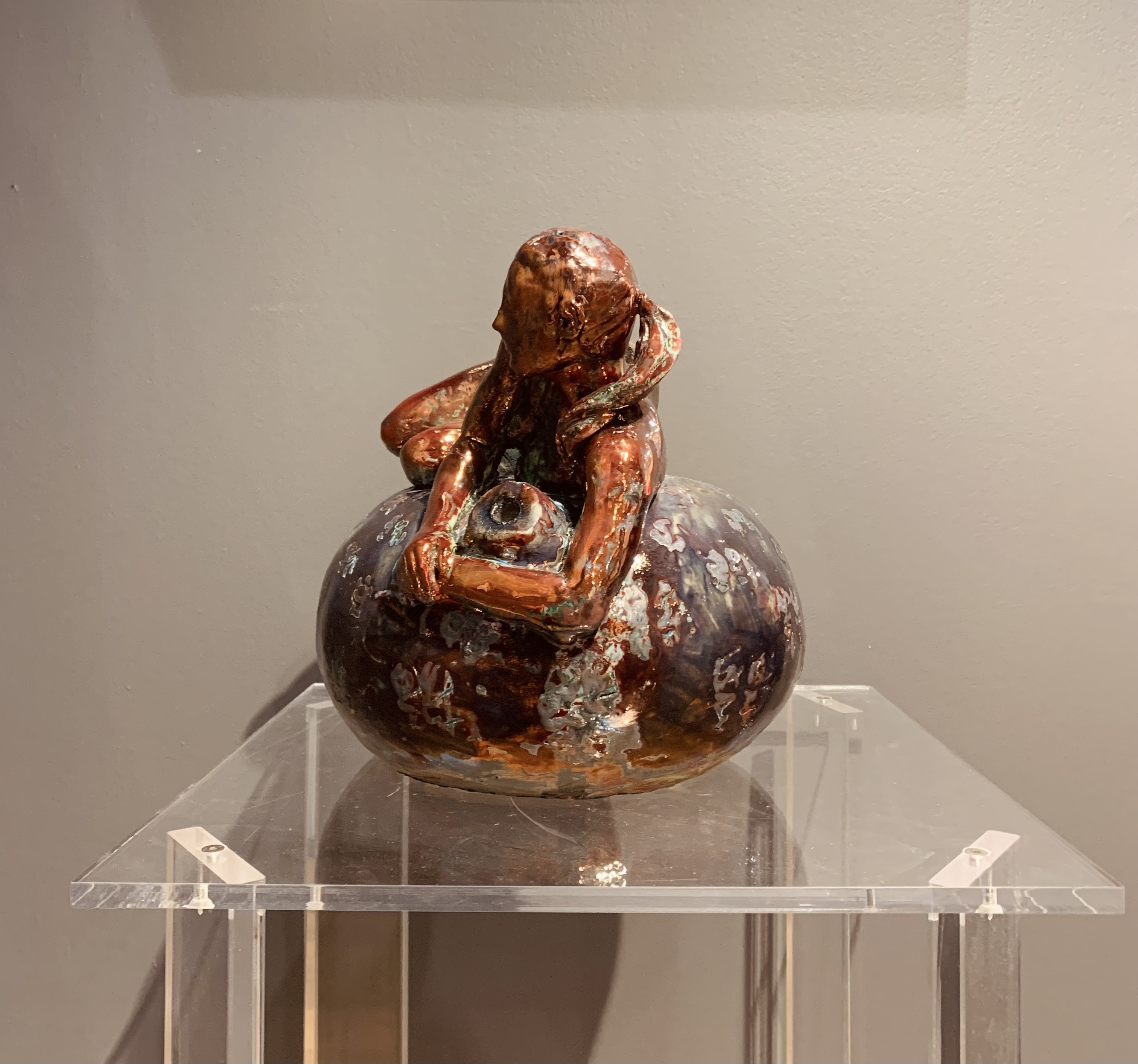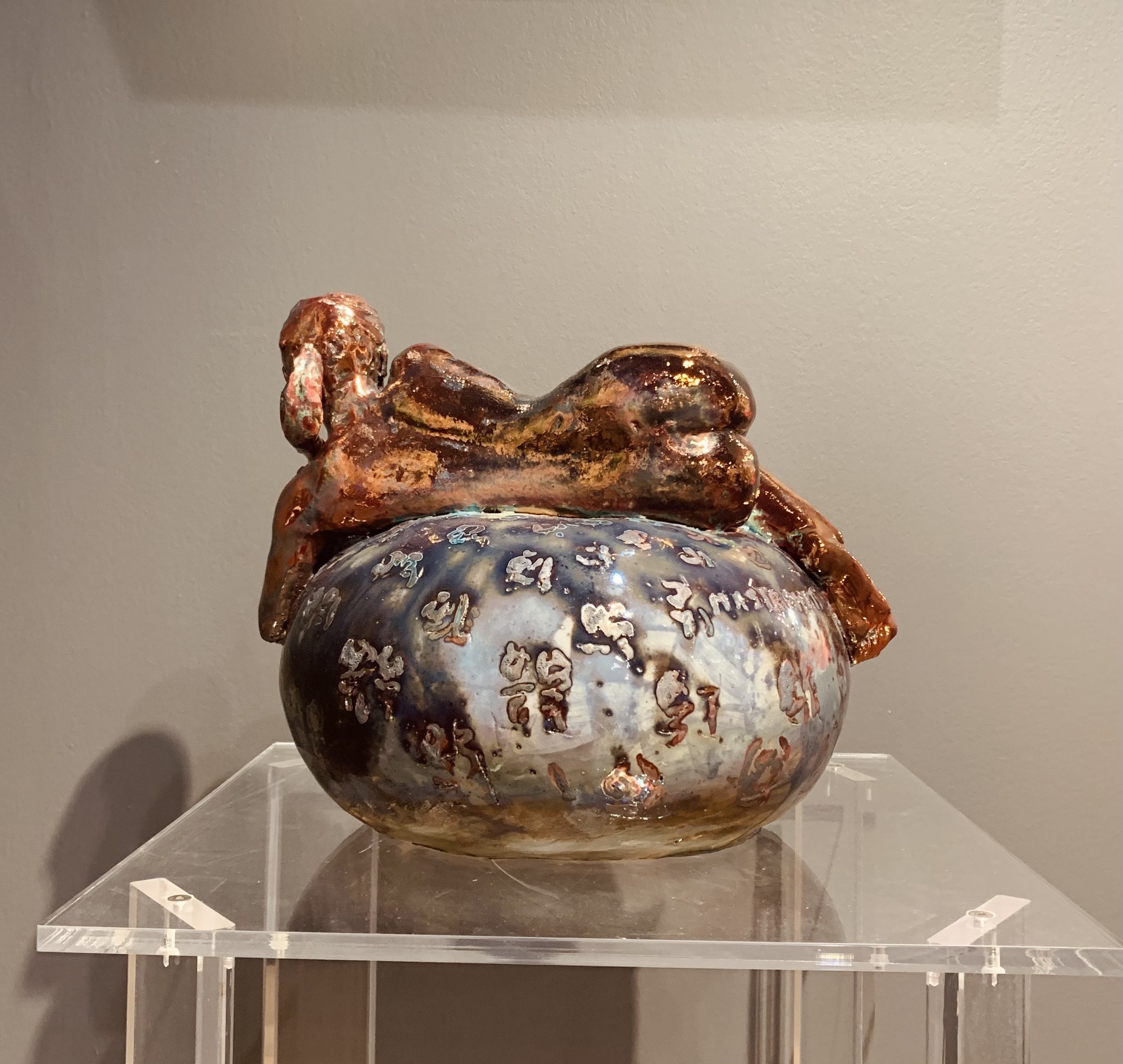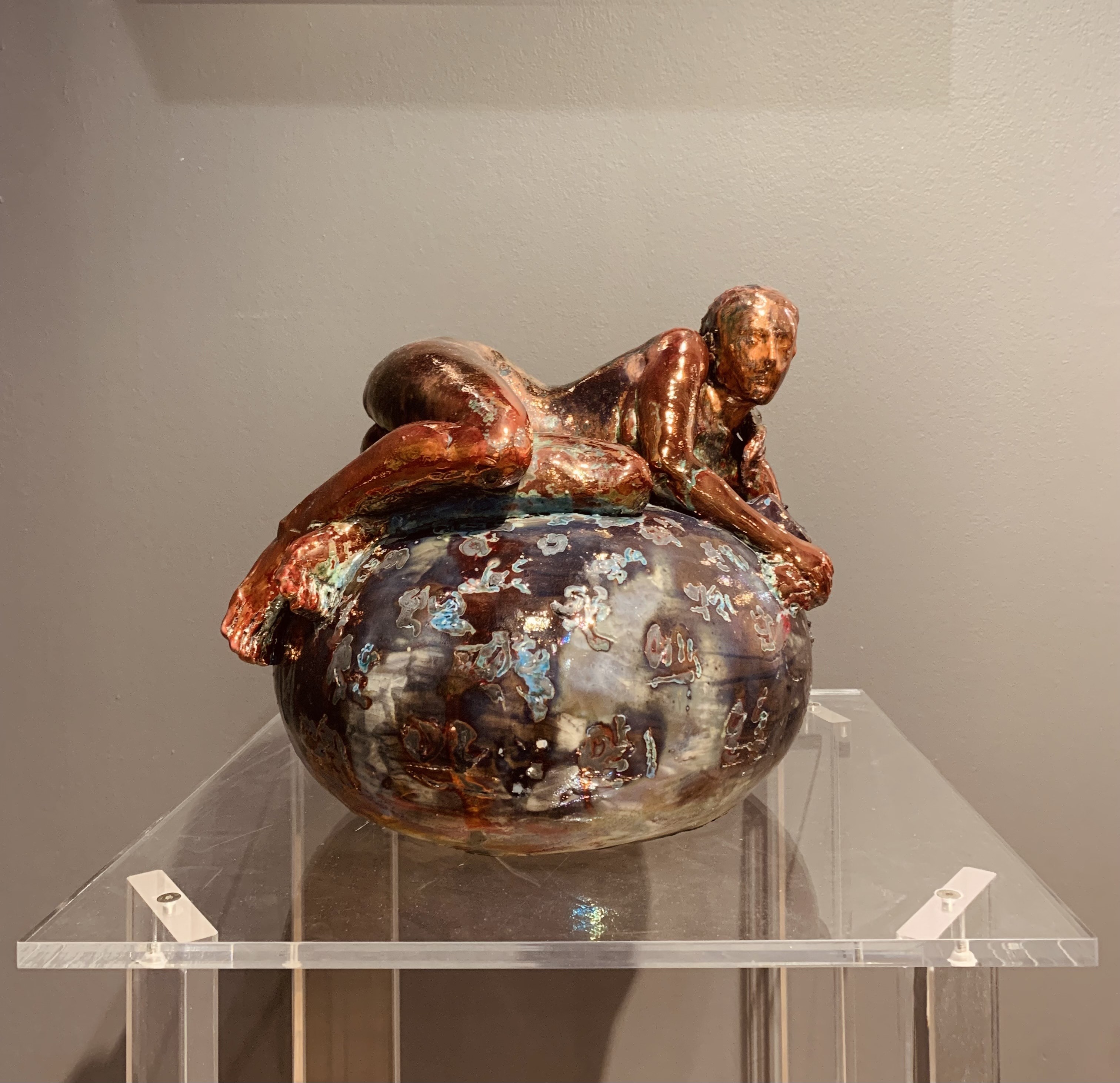Sculpture en céramique originale et unique de l'artiste MASTROMATTEO, d'une femme allongée sur un vase, aux formes simples et épurées, figée dans un instant de calme et de réflexion. Recouverte d’un lustro métallique, la sculpture capte la lumière et dégage une atmosphère méditative typique de MASTROMATTEO.