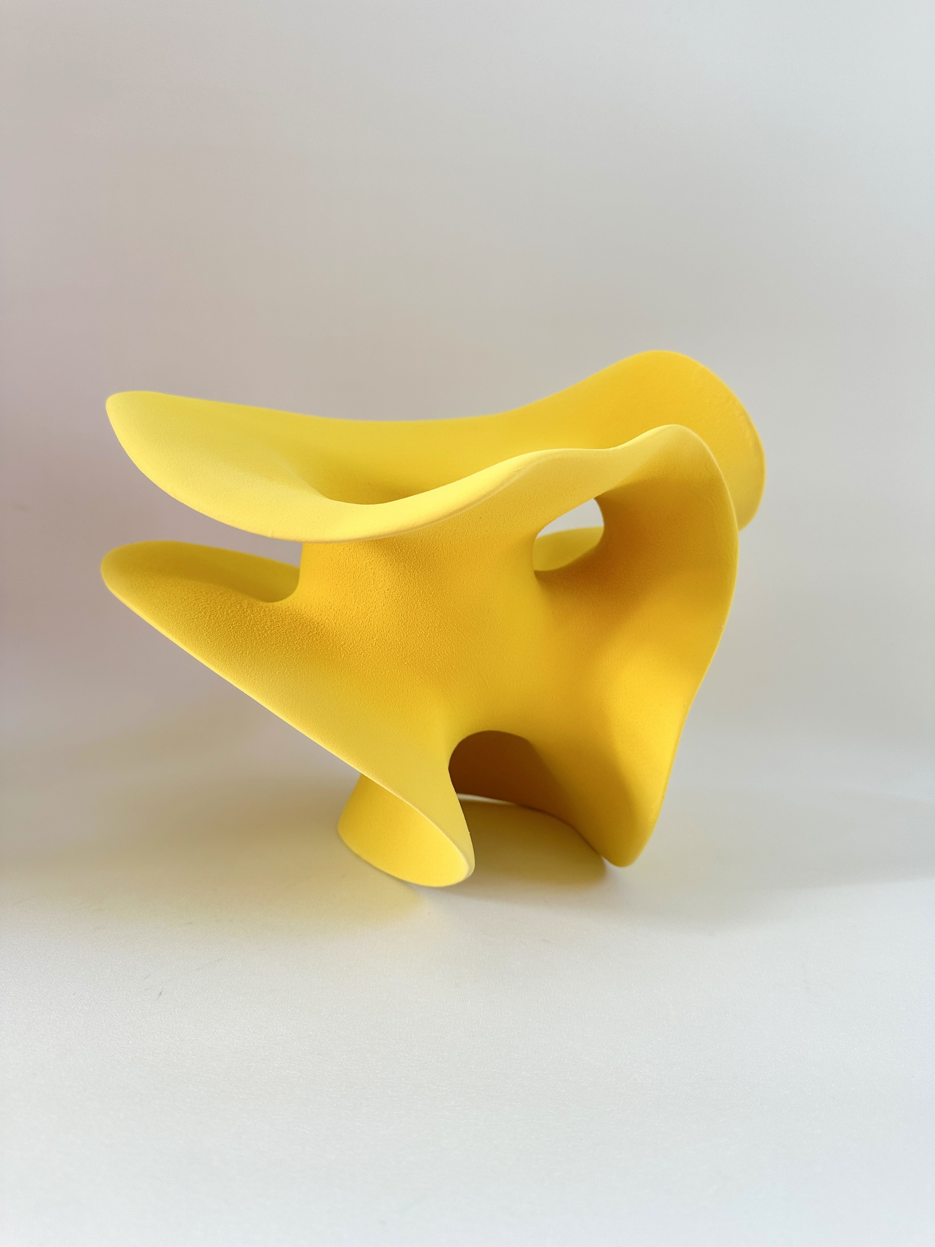 Sculpture en céramique originale et unique de l'artiste DEMEESTER, d’un jaune vif et uniforme, avec une forme organique qui évoque le mouvement. La pièce semble tourner et se plier sur elle-même. Les surfaces paraissent légèrement texturées. L’ensemble rappelle une danse de formes abstraites, sans angles rigides, avec un équilibre subtil.