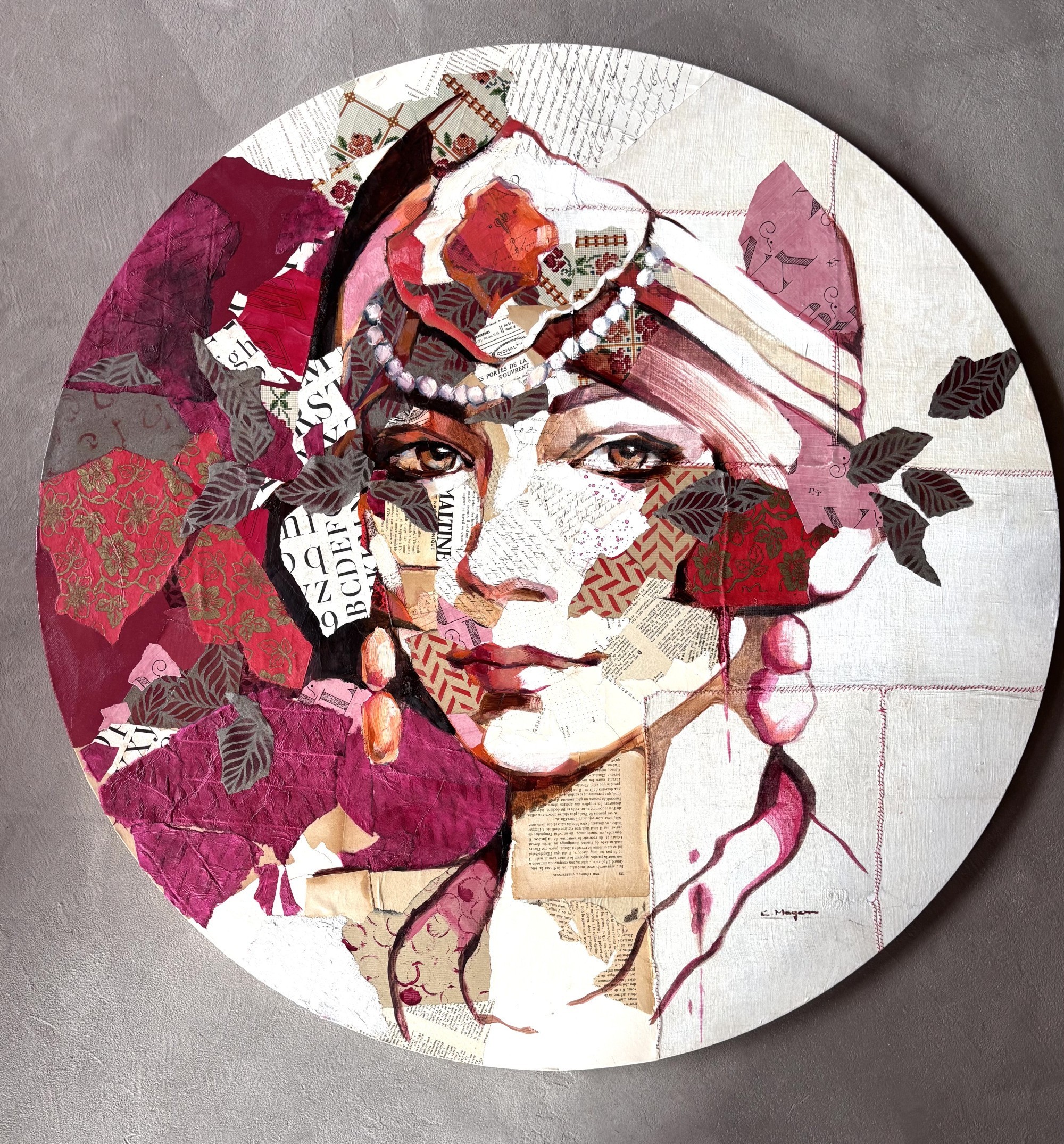 Œuvre originale de l'artiste Carme Magem, d'un portrait de femme au turban réalisé en technique de collage et peinture sur un support rond. Les couleurs dominantes sont le rouge et bordeaux et le fond est clair et texturé.