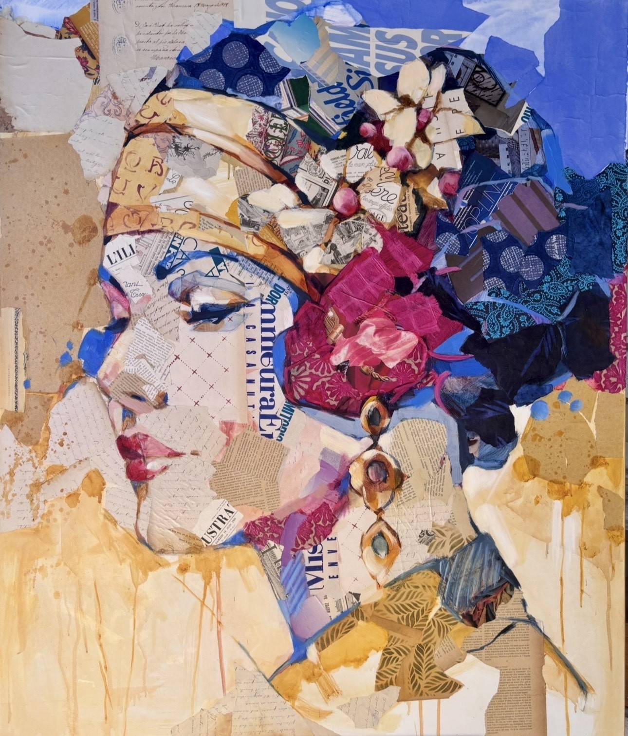 Œuvre originale de l'artiste Carme Magem, réalisée en technique mixte et collage. Le visage, très fragmenté par des coupures de journaux et de textes, porte un turban orné de fleurs aux couleurs intenses (fuchsia, rouge) et de motifs bleus et jaunes. L'ensemble dégage une impression d'élégance et de mystère, avec des coulures de peinture jaune en bas.