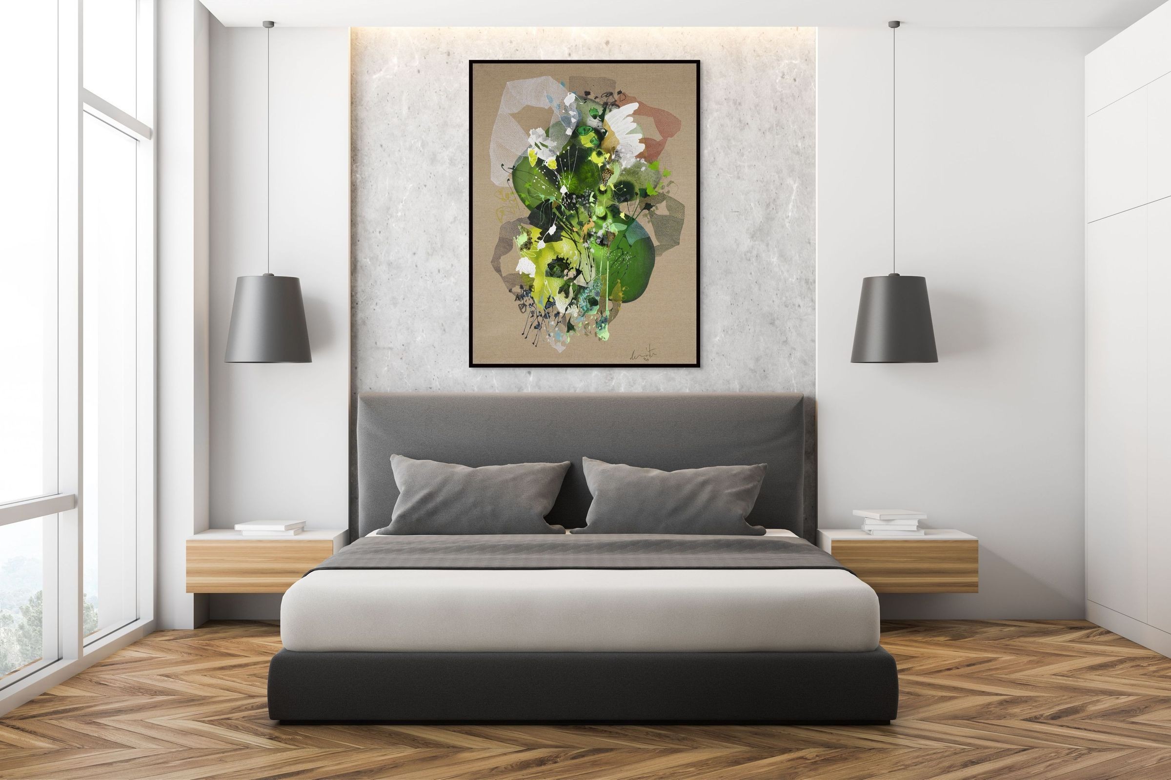 Œuvre originale de l'artiste Damien Demaiter, est une création abstraite où les teintes sombres dominent, notamment des nuances de vert. Ces couleurs sont enrichies par des touches subtiles de blanc qui ajoutent une lumière discrète et contrastée. Les textures riches et travaillées évoquent une sensation de matière brute, rappelant des paysages minéraux ou rocheux.