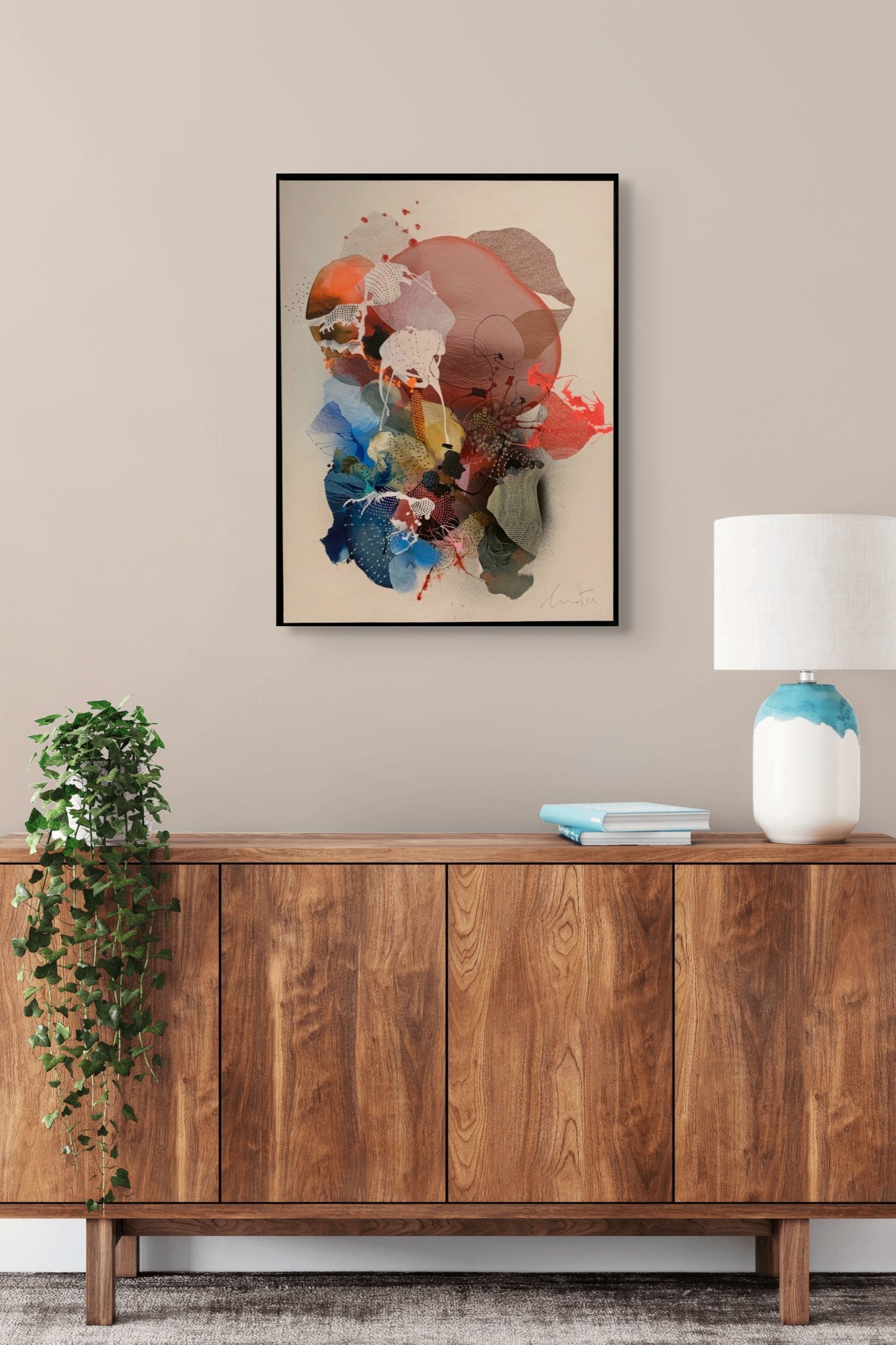Des formes fluides et organiques dominent la composition, évoquant des éléments naturels ou marins. Les motifs texturés, composés de points et de lignes, apportent une richesse visuelle, tandis que l’ensemble dégage une énergie dynamique et une profondeur captivante..