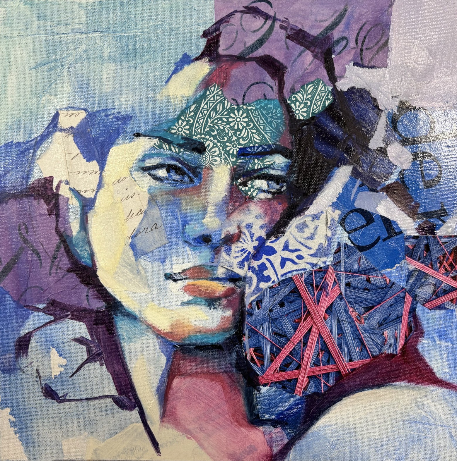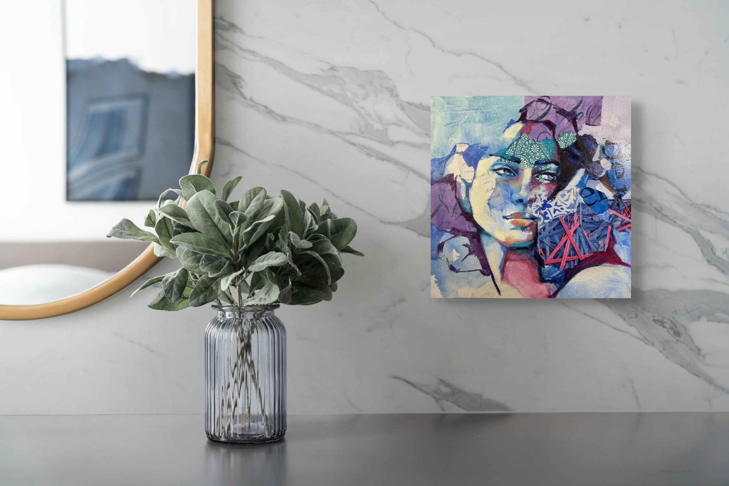 Œuvre originale de l'artiste Carme Magem, qui explore l'identité a travers un visage fragmenté. Avec ses couleurs éclatantes de bleu et de rose, ses motifs et textures, l'artiste a créé une composition poétique.