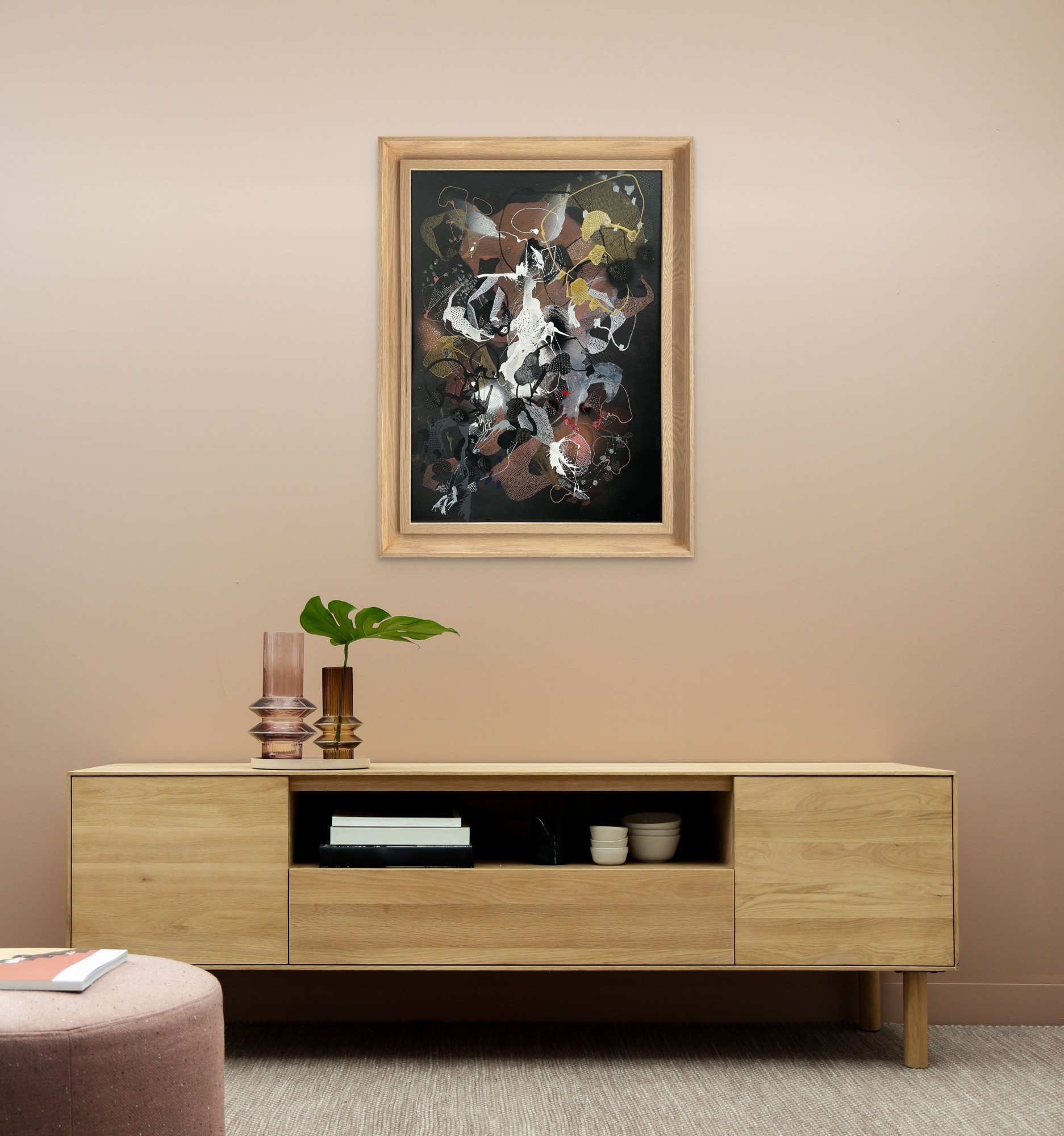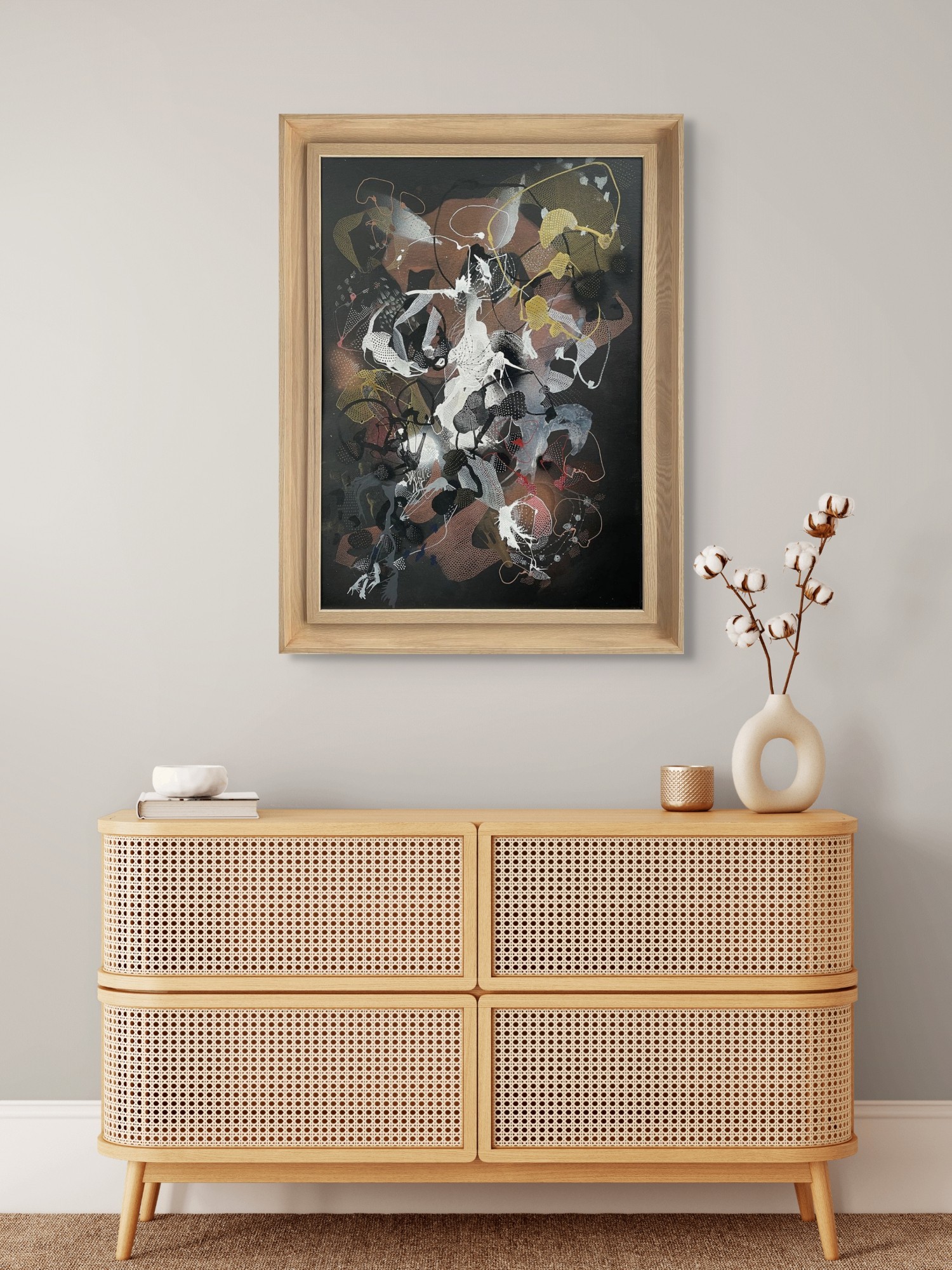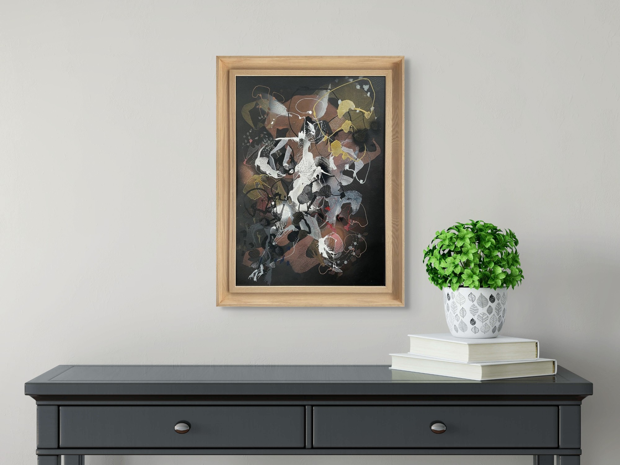 Cette œuvre abstraite présente une palette dominée par des tons sombres comme le noir et le brun, équilibrés par des touches de blanc éclatant et des accents dorés et rouges.
