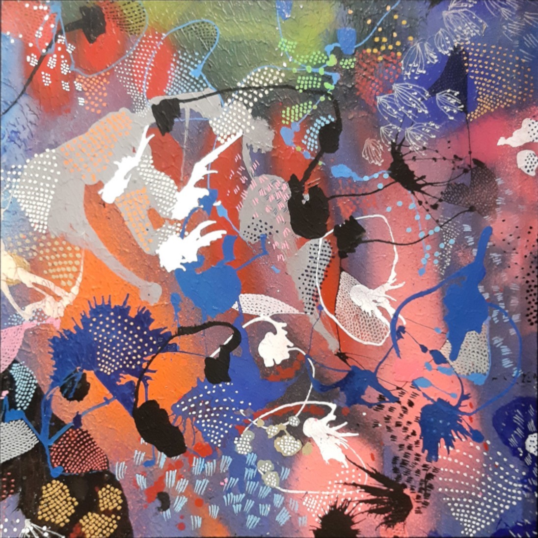 Cette œuvre est une composition abstraite vibrante et énergique, où des teintes chaudes comme l'orange et le rouge se mêlent à des tons froids tels que le bleu et le violet.