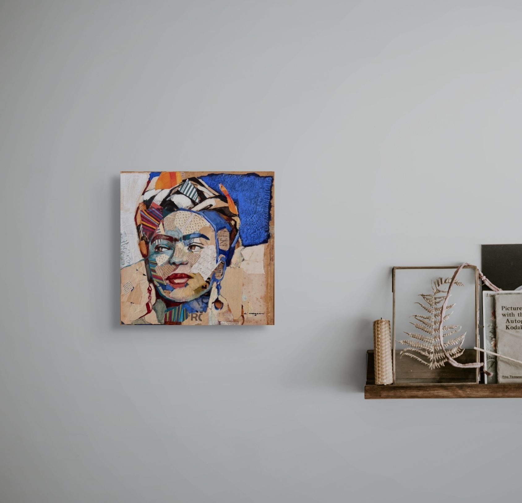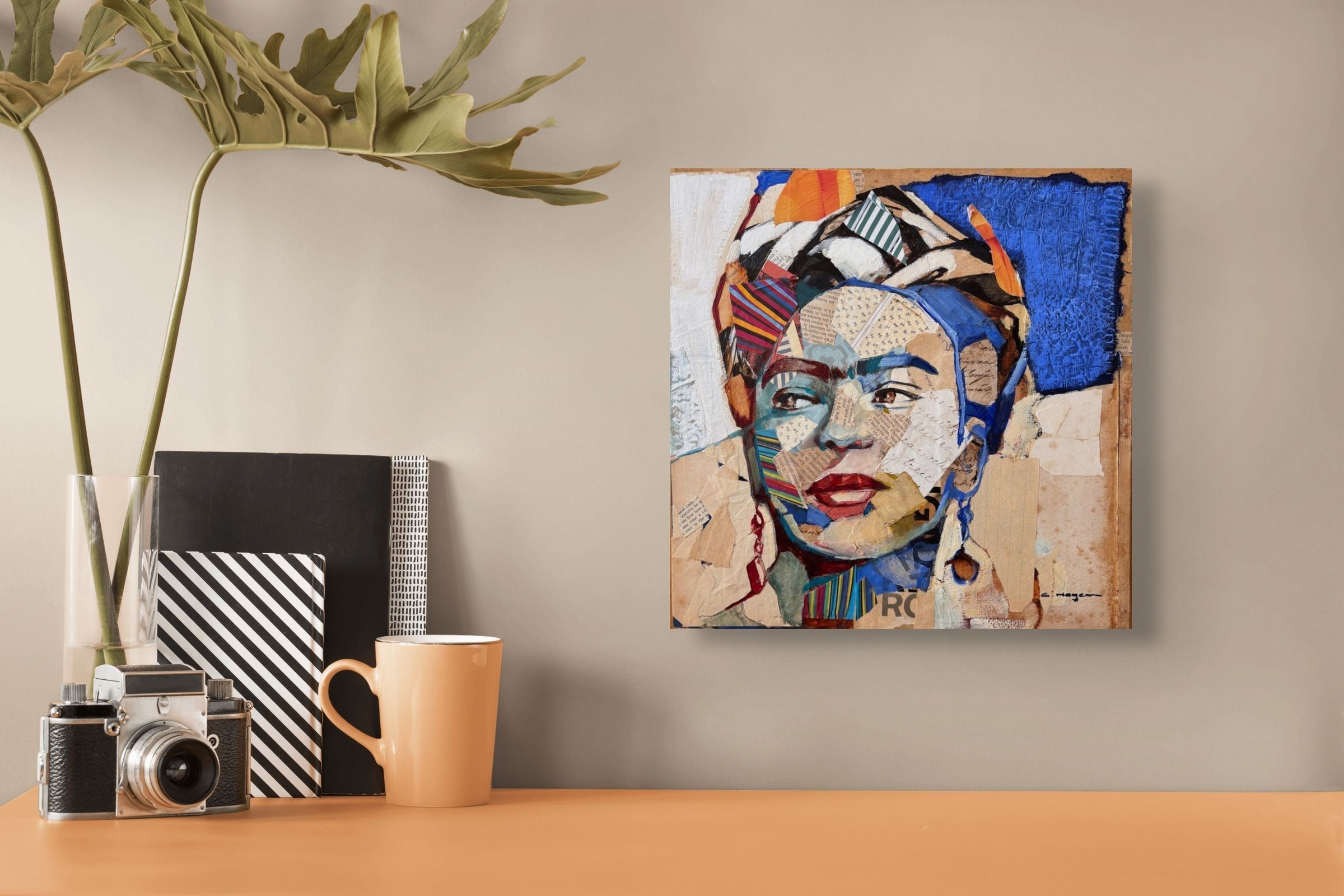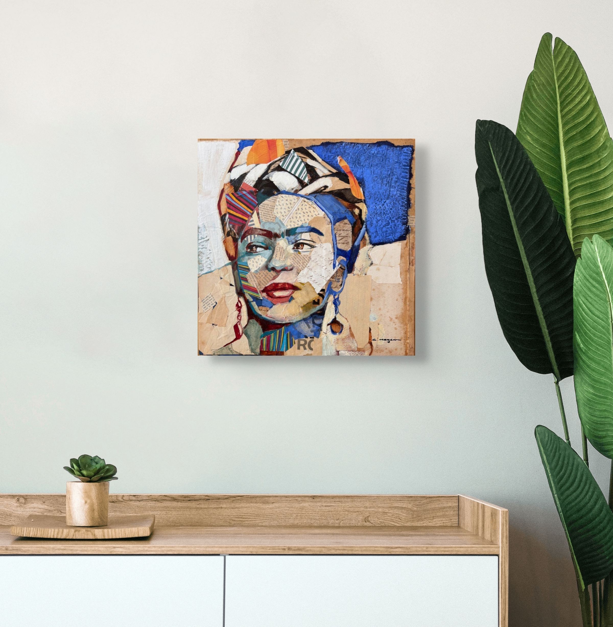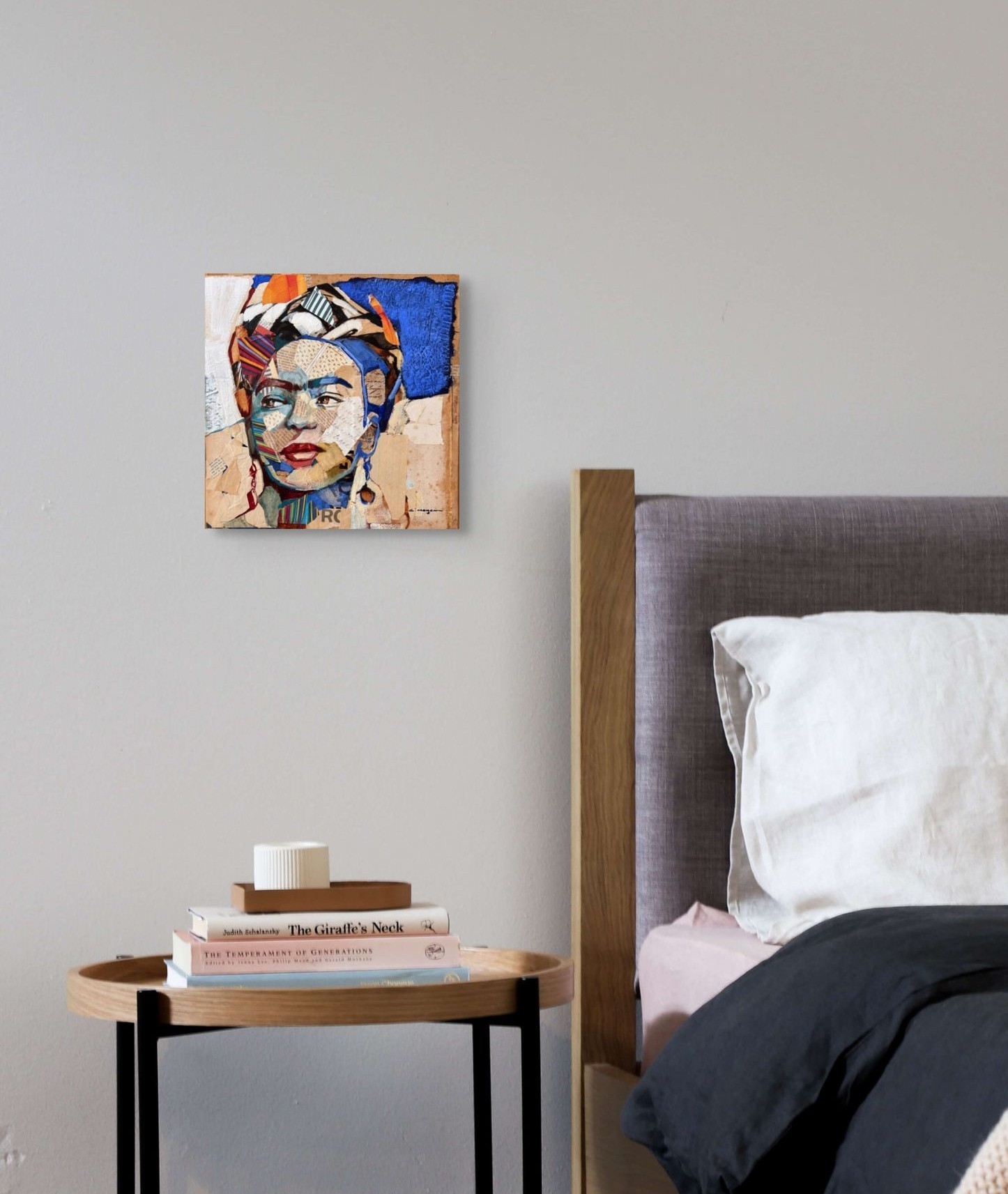 Œuvre originale de l'artiste Carme Magem, portrait expressif de Frida Kahlo, réalisé en collage mêlant papiers imprimés, tissus colorés et peinture. Les textures variées et les motifs dynamiques donnent une dimension vivante et engagée à cette œuvre.