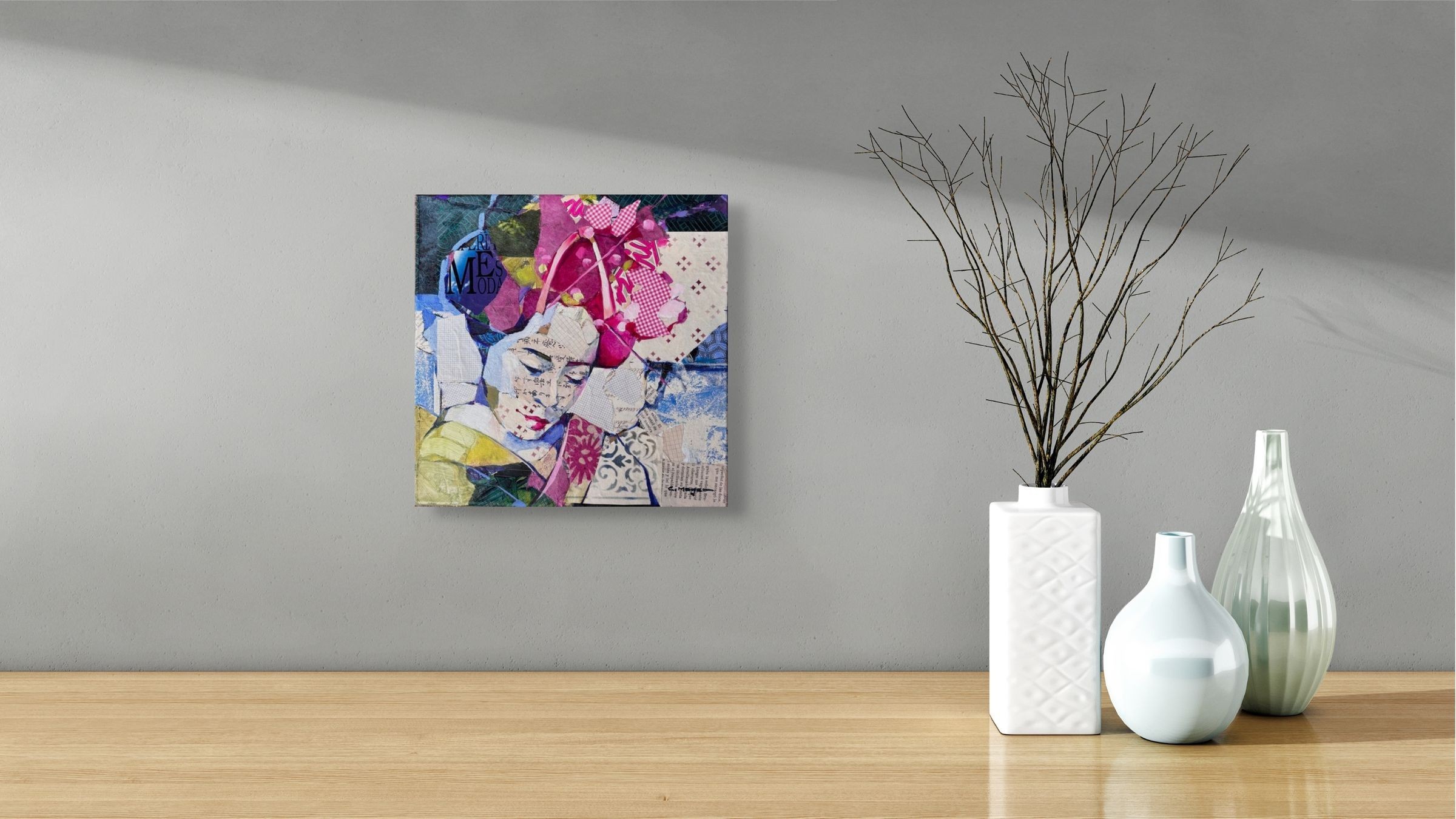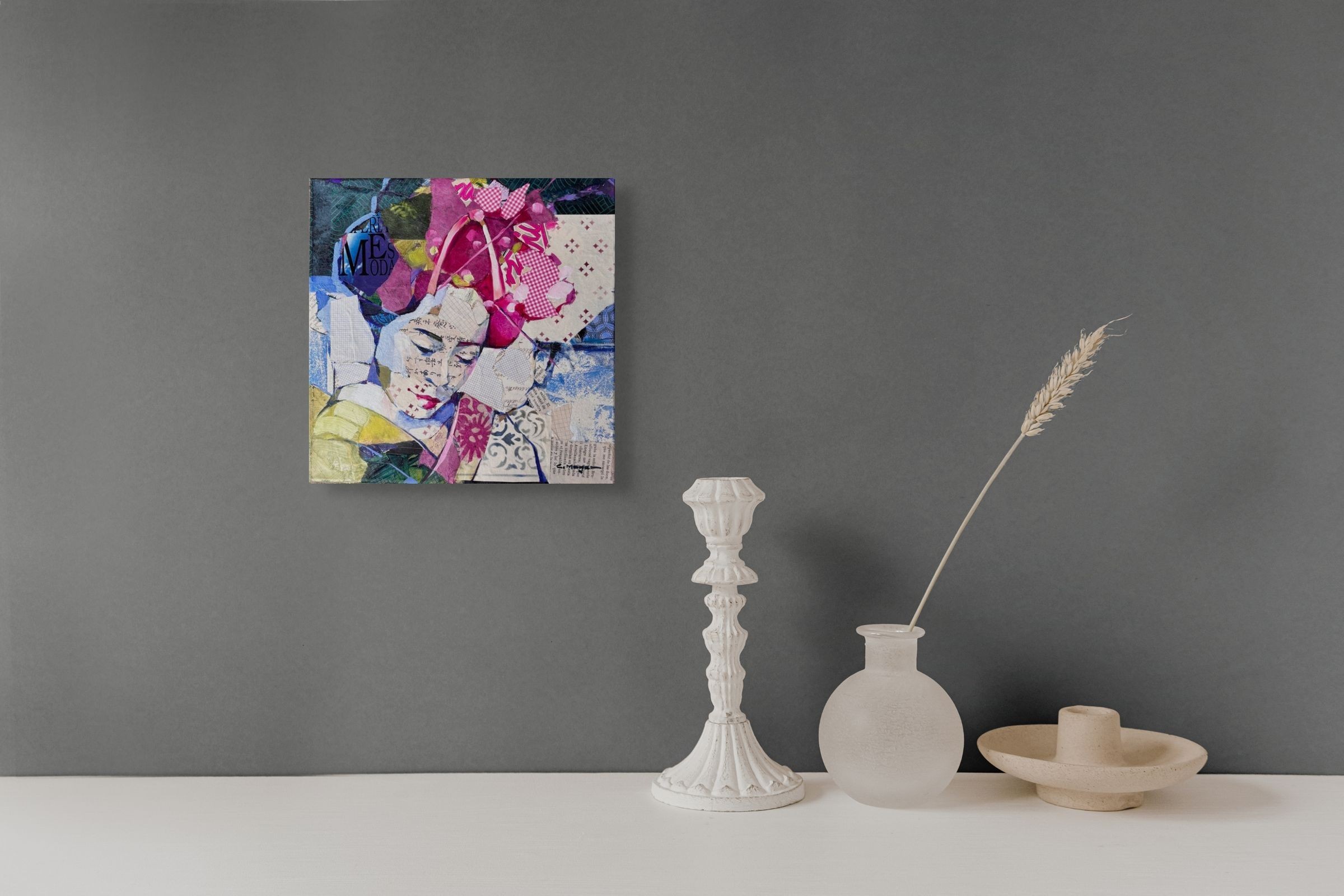 Œuvre originale de l'artiste Carme Magem, représente une geisha, façonnée par des fragments de textes et motifs, incarne la grâce silencieuse et la complexité culturelle du Japon. L’artiste compose chaque détail avec du papier collé, offrant une lecture à la fois poétique et moderne de cette figure emblématique.