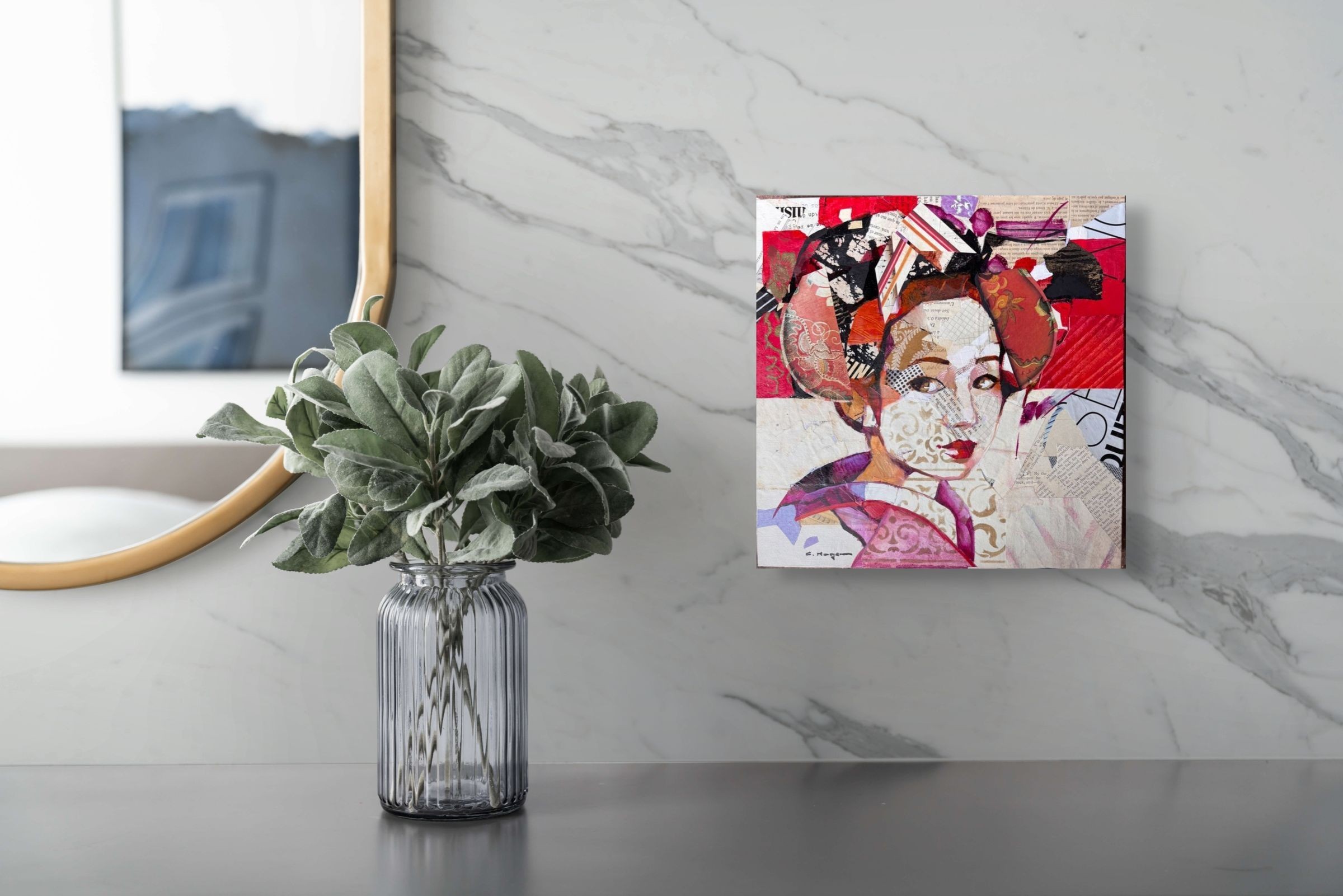 Mix media avec collages sur toile.