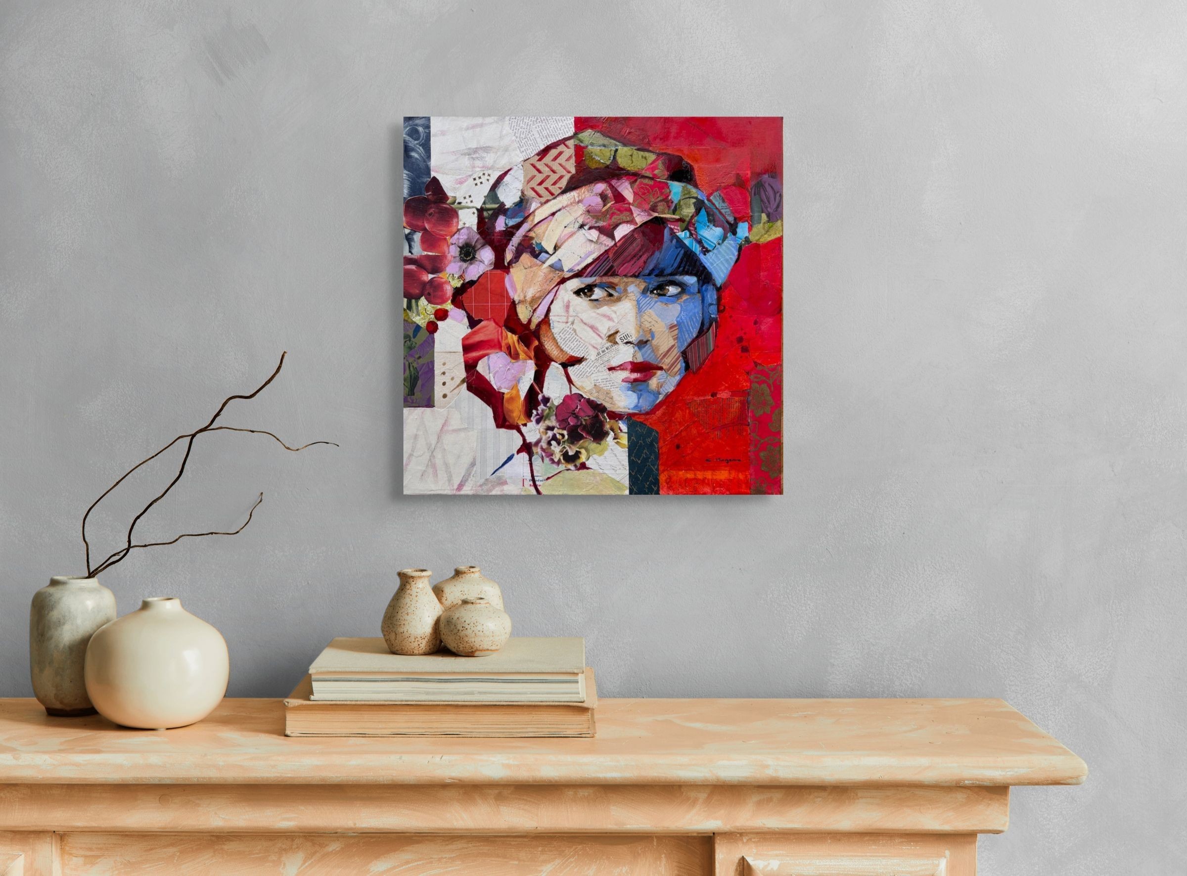 Œuvre originale de l'artiste Carme Magem, est un portrait de Louise utilise en mix media avec collages sur toile dominé par le rouge. Les papiers texturés et les motifs variés composent un visage expressif, plein de force et de caractère.