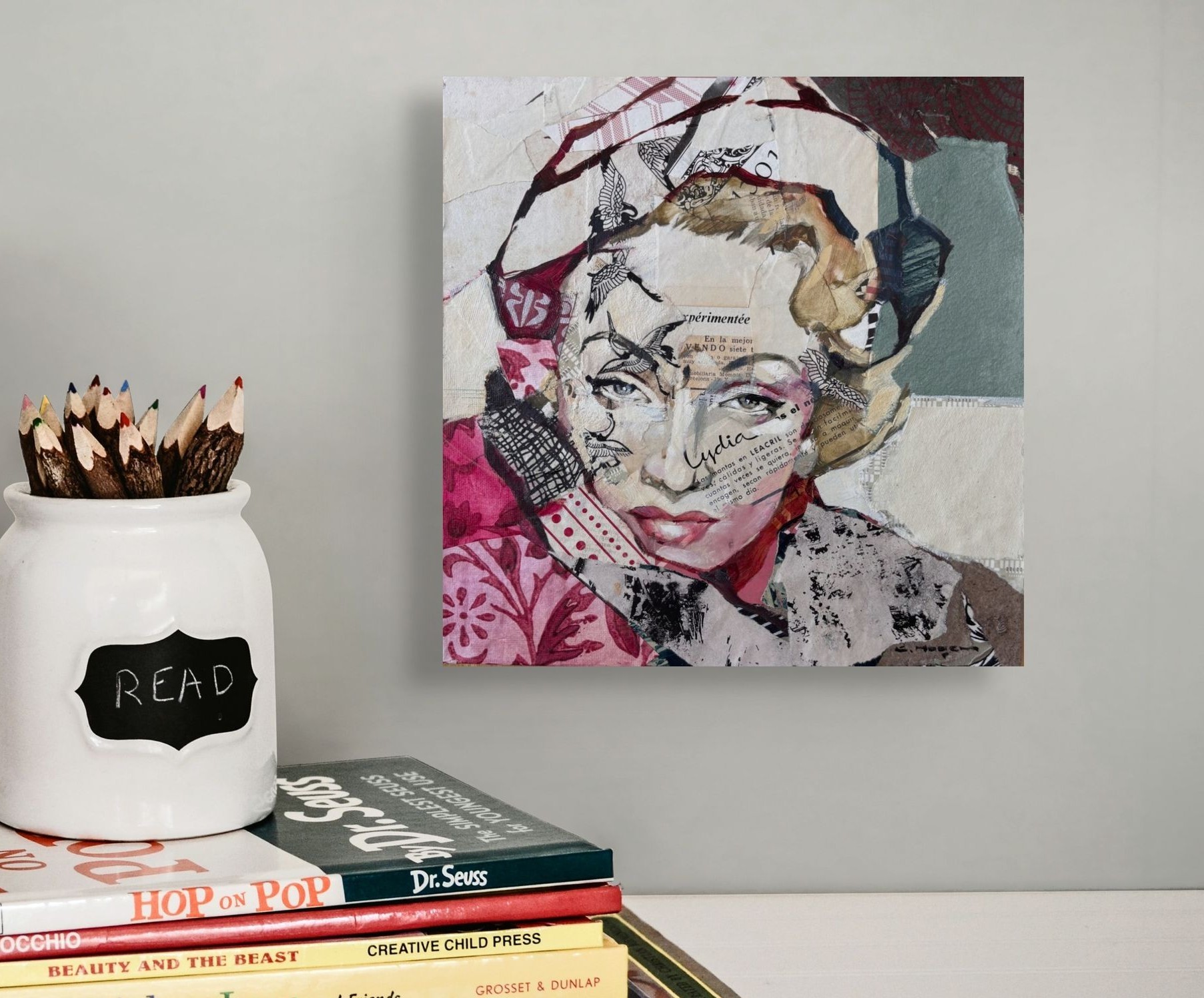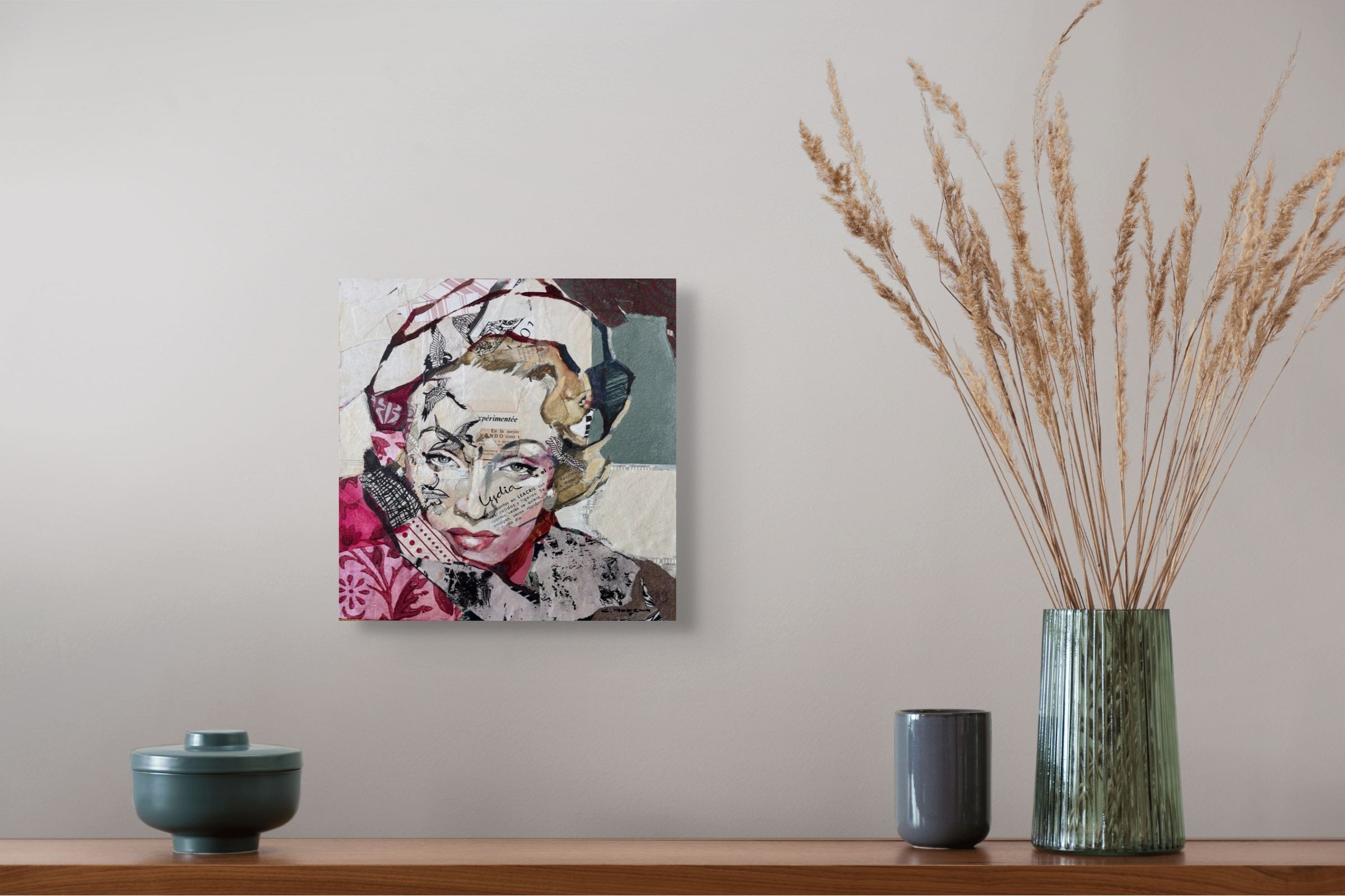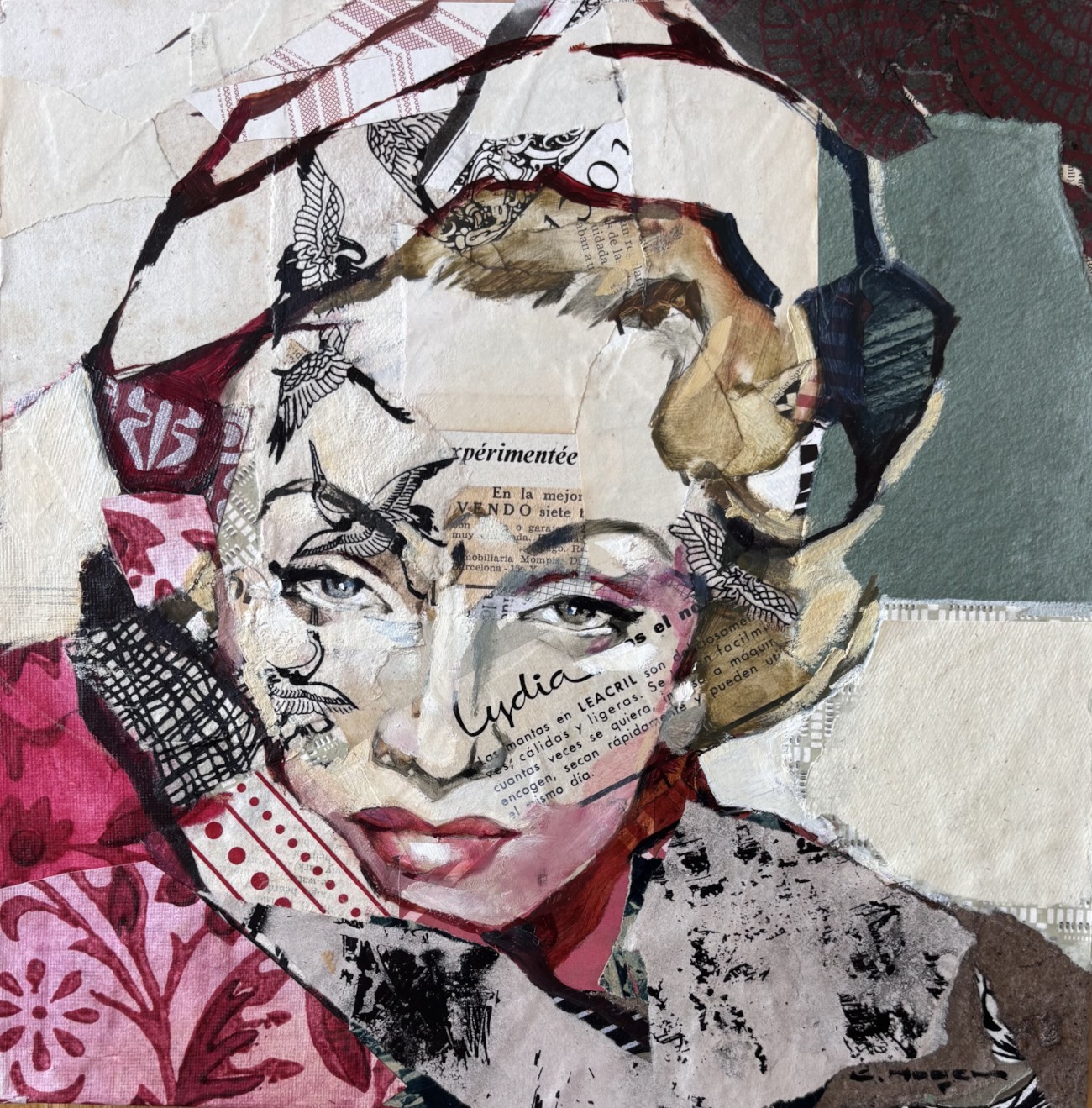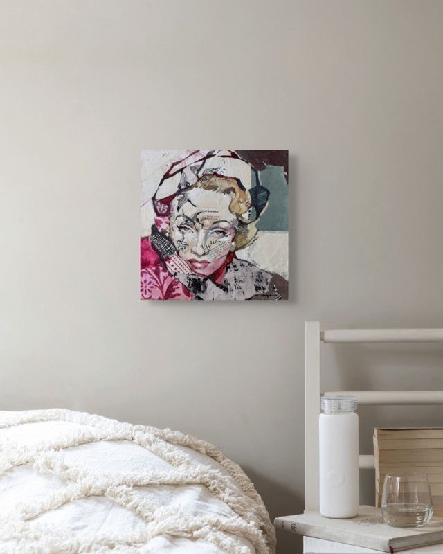Œuvre originale de l'artiste Carme Magem, est un portrait de Marlène Dietrich en collage mêle papiers imprimés, textures et couleurs douces. Son regard intense se détache au milieu de motifs floraux et d’écritures.