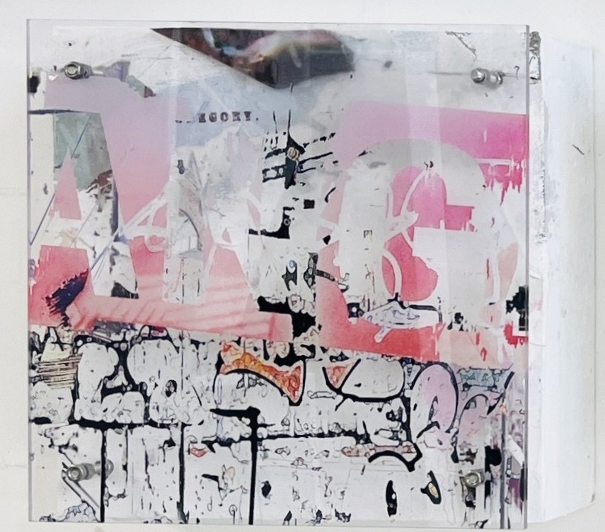 Œuvre originale de l'artiste Grégory Watin, qui mêle textures de graffiti, couches de peinture écaillée et affiches arrachées. Les tons dominants sont le rose, le blanc et le noir, créant une atmosphère urbaine brute.