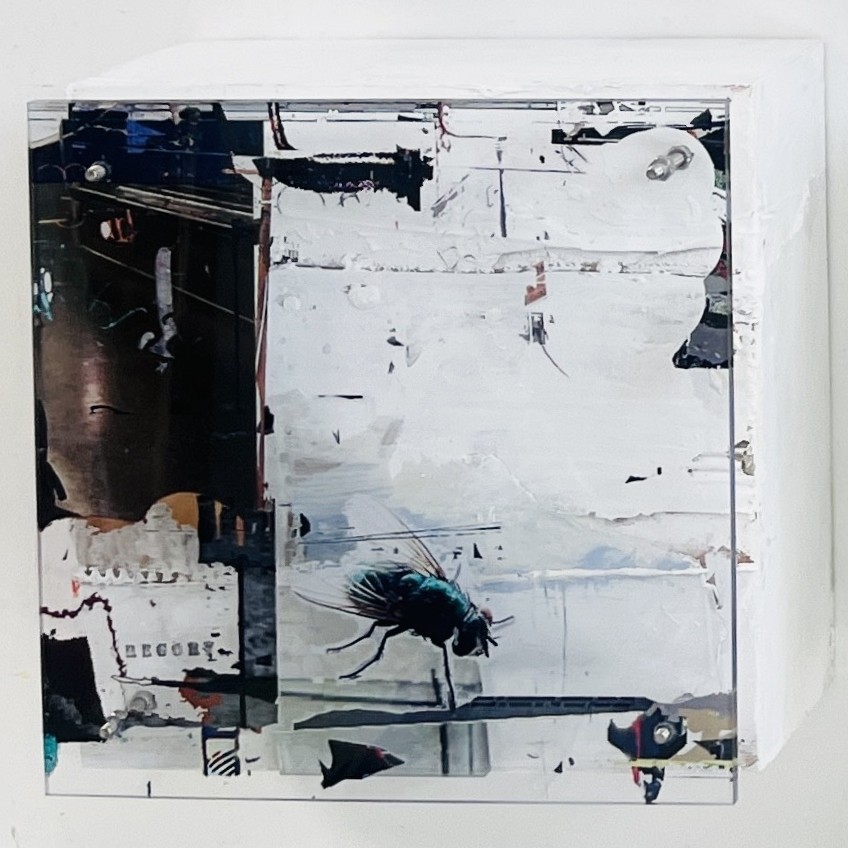 Œuvre originale de l'artiste Grégory Watin, d'une image surréaliste et intrigante montrant une grosse mouche sur une surface, en contraste avec des couches déchirées et des blancs/gris sourds. Une sensation de décomposition ou de saleté urbaine se dégage.