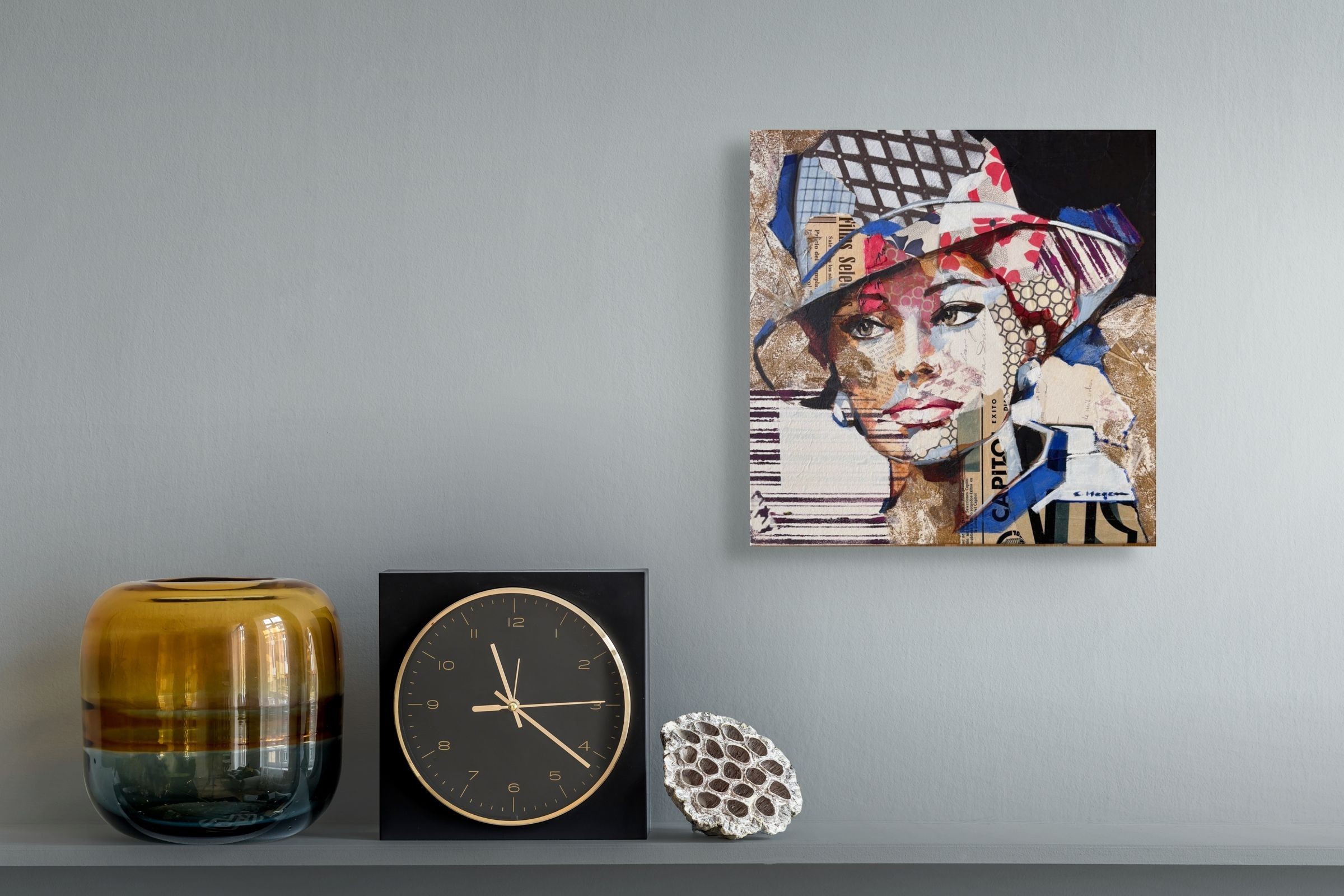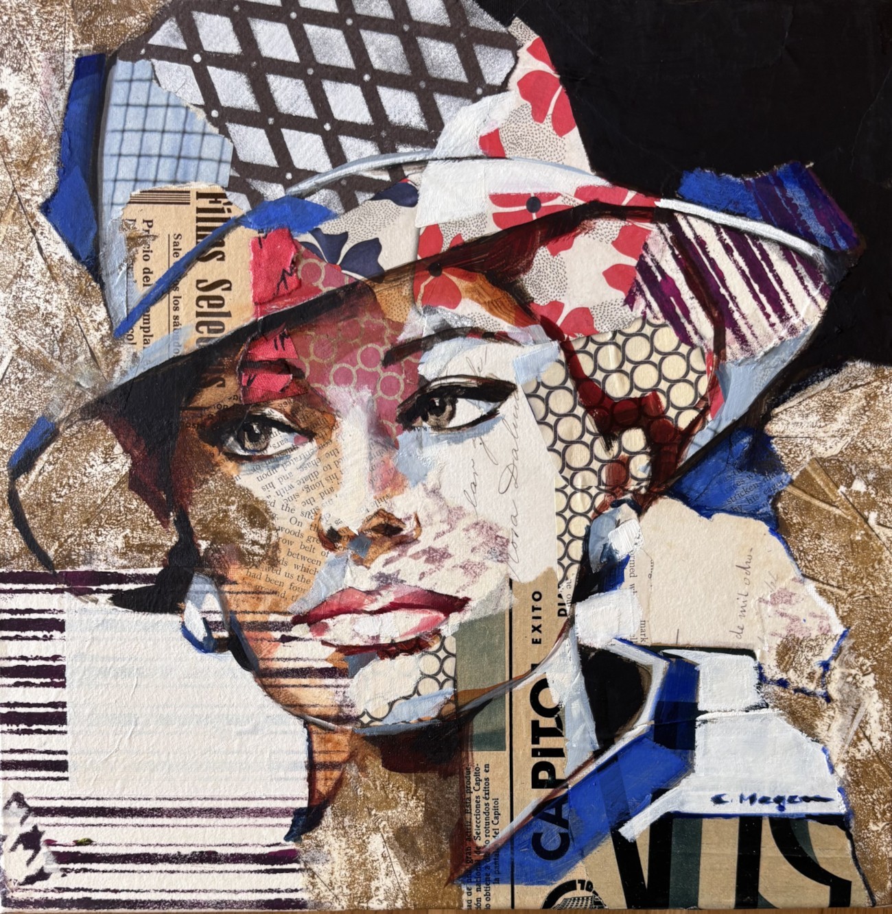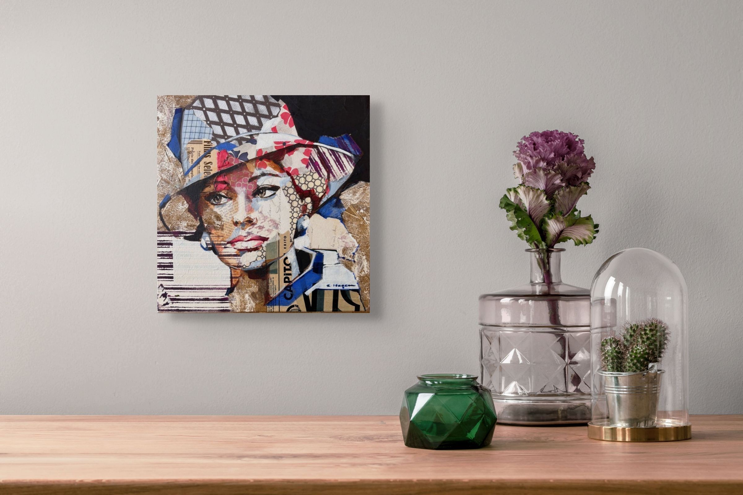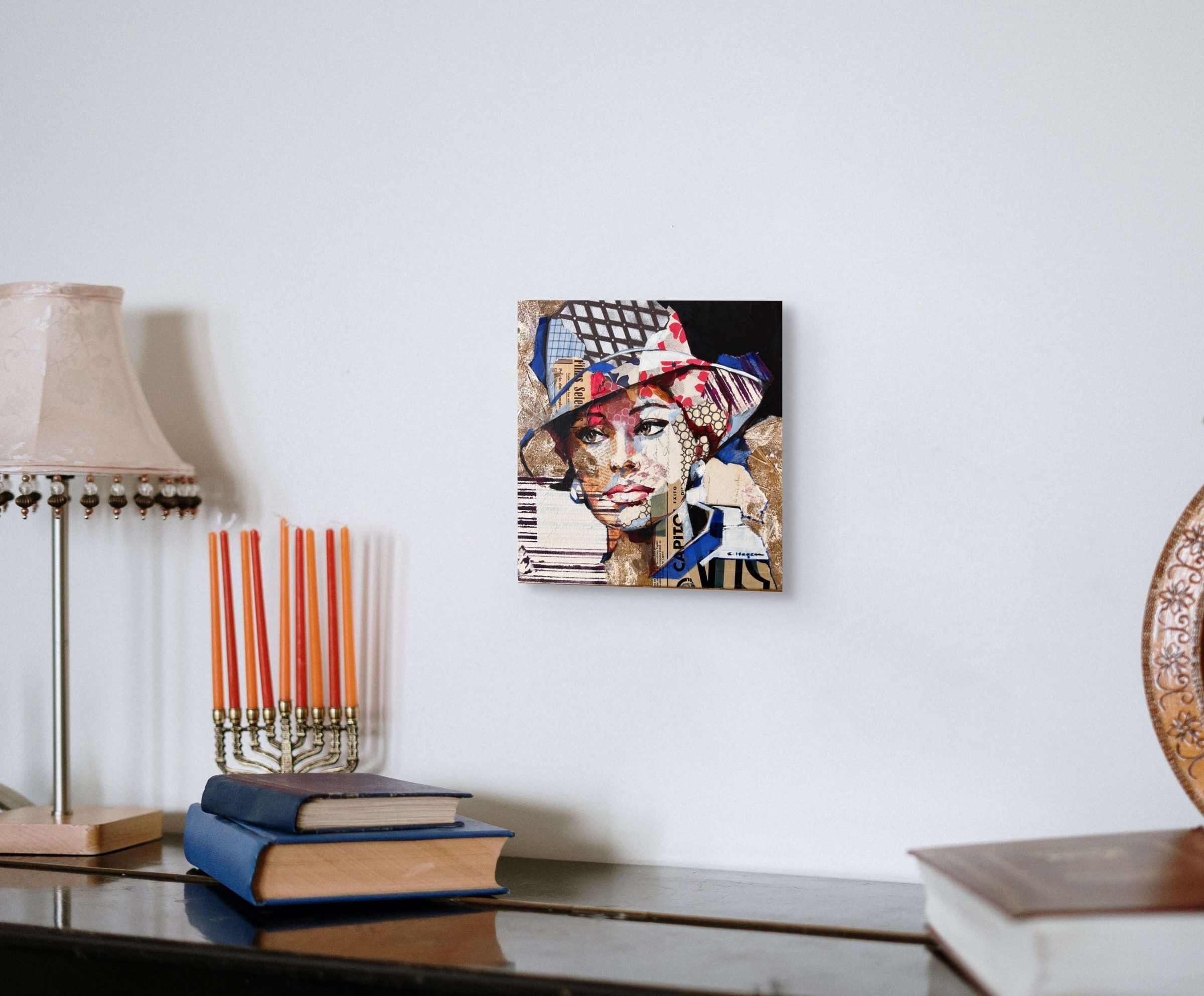 Œuvre originale de l'artiste Carme Magem, portrait de Sophia Loren en collage joue avec des papiers imprimés, des textures neutres et des contrastes graphiques.