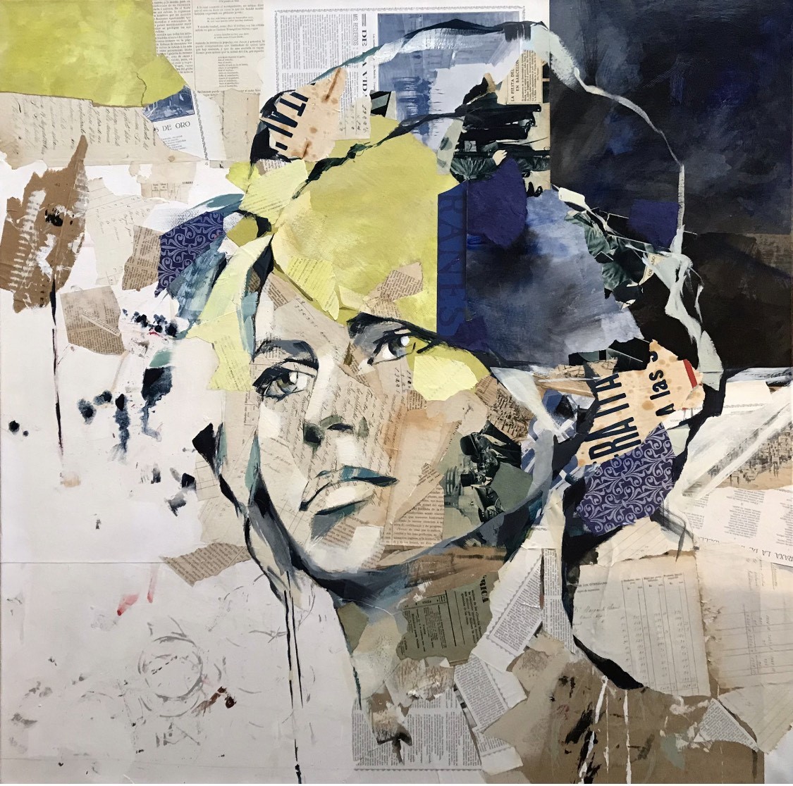 Œuvre originale de  Carme Magem, artiste collagiste reconnue pour ses portraits remarquablement expressifs, composés avec des coupures de journaux et des fragment de lettres et d'écrits anciens.