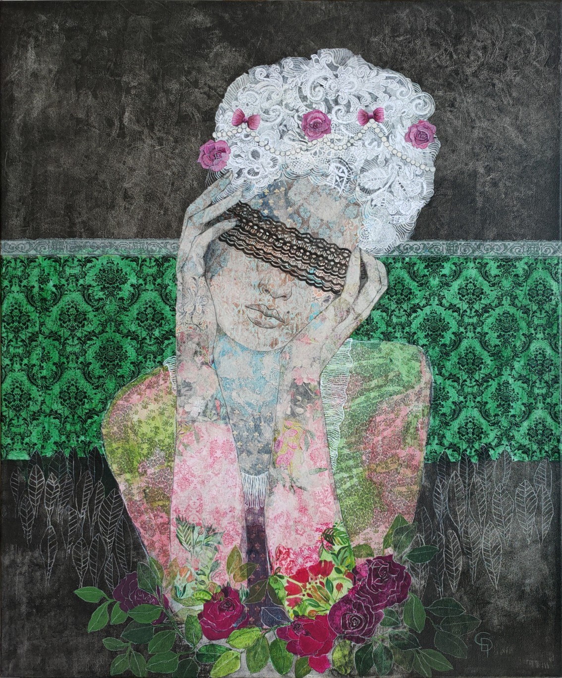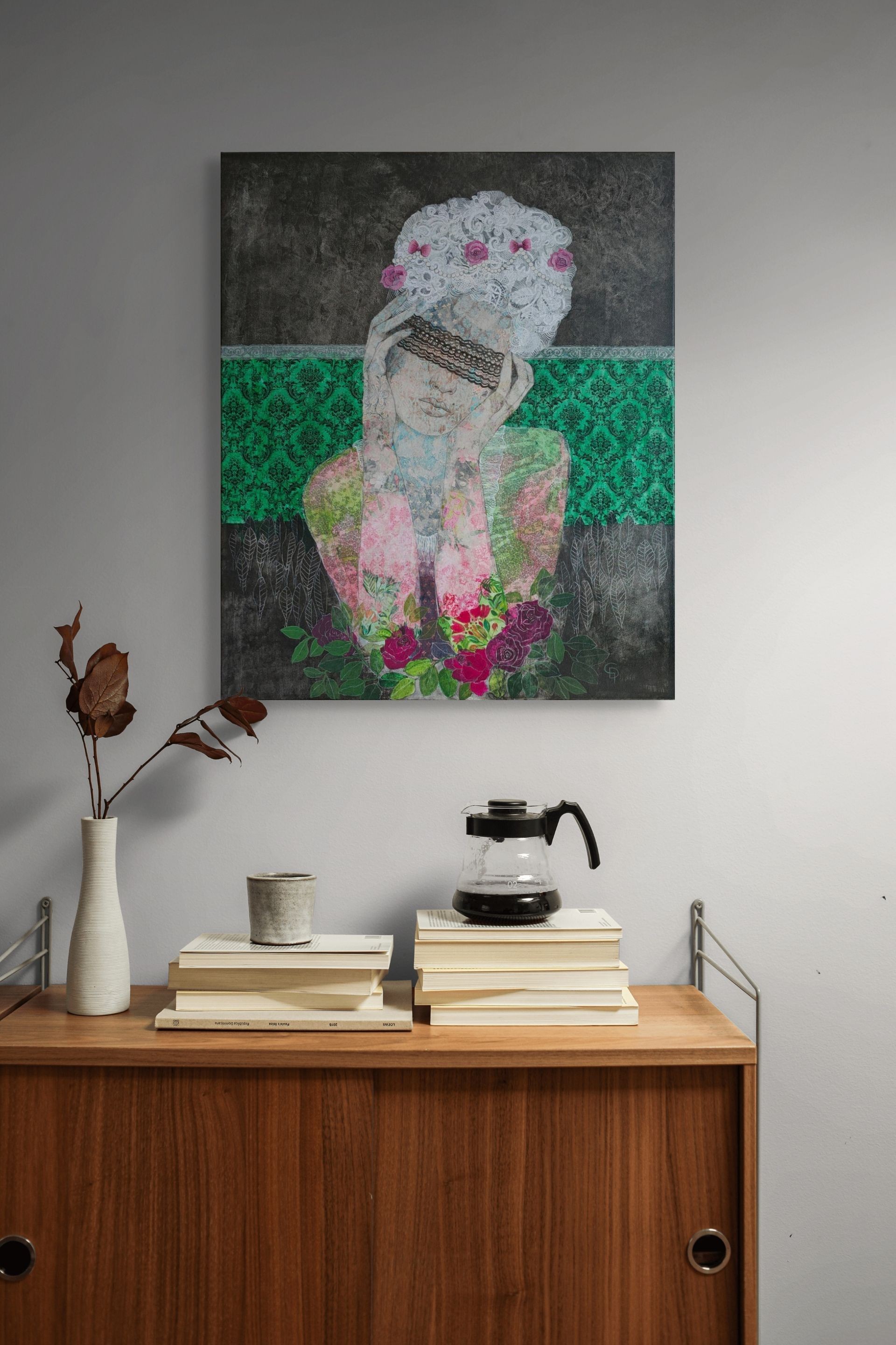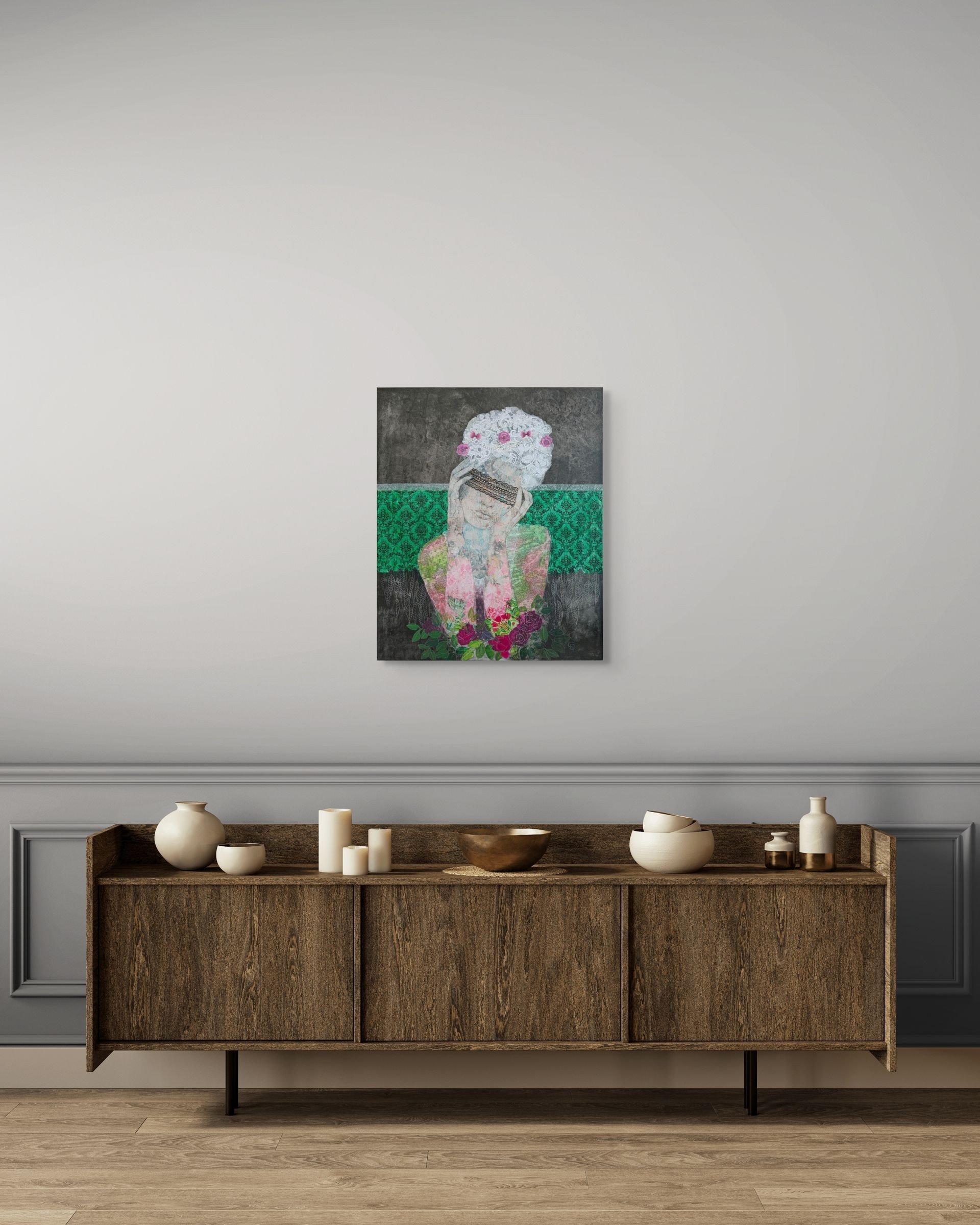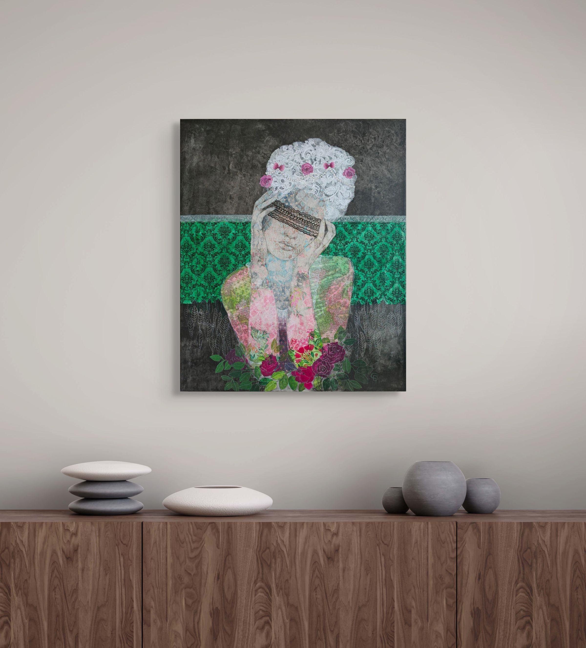 Œuvre originale de l'artiste DUCHÊNE-MALISSIN Un visage fragile et volontairement à peine esquissé émerge d’un fond sombre : la superposition délicate d’acrylique, de papier fin et de collages crée une atmosphère introspective et mélancolique.